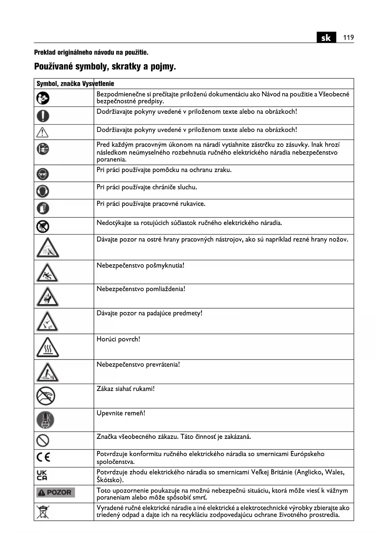 Preklad originálneho návodu na použitie. Používané symboly, skratky a pojmy. Symbol, značka Vysvetlenie Bezpodmienečne si prečítajte priloženú dokumentáciu ako Návod na použitie a Všeobecné bezpečnostné predpisy. Dodržiavajte pokyny uvedené v priloženom texte alebo na obrázkoch! Dodržiavajte pokyny uvedené v priloženom texte alebo na obrázkoch! Pred každým pracovným úkonom na náradí vytiahnite zástrčku zo zásuvky. Inak hrozí následkom neúmyselného rozbehnutia ručného elektrického náradia nebezpečenstvo poranenia. Pri práci používajte pomôcku na ochranu zraku. Pri práci používajte chrániče sluchu. Pri práci používajte pracovné rukavice. Nedotýkajte sa rotujúcich súčiastok ručného elektrického náradia. Dávajte pozor na ostré hrany pracovných nástrojov, ako sú napríklad rezné hrany nožov. Nebezpečenstvo pošmyknutia! Nebezpečenstvo pomliaždenia! Dávajte pozor na padajúce predmety! Horúci povrch! Nebezpečenstvo prevrátenia! Zákaz siahať rukami! Upevnite remeň! Značka všeobecného zákazu. Táto činnosť je zakázaná. Potvrdzuje konformitu ručného elektrického náradia so smernicami Európskeho spoločenstva. Potvrdzuje zhodu elektrického náradia so smernicami Veľkej Británie (Anglicko, Wales, Škótsko). Toto upozornenie poukazuje na možnú nebezpečnú situáciu, ktorá môže viesť k vážnym poraneniam alebo môže spôsobiť smrť. Vyradené ručné elektrické náradie a iné elektrické a elektrotechnické výrobky zbierajte ako triedený odpad a dajte ich na recykláciu zodpovedajúcu ochrane životného prostredia.120