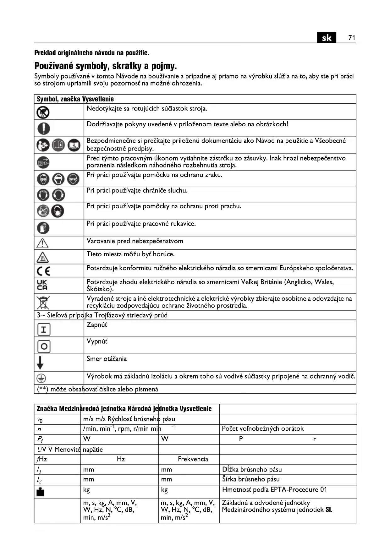 Preklad originálneho návodu na použitie. Používané symboly, skratky a pojmy. Symboly používané v tomto Návode na používanie a prípadne aj priamo na výrobku slúžia na to, aby ste pri práci so strojom upriamili svoju pozornosť na možné ohrozenia. Symbol, značka Vysvetlenie Nedotýkajte sa rotujúcich súčiastok stroja. Dodržiavajte pokyny uvedené v priloženom texte alebo na obrázkoch! Bezpodmienečne si prečítajte priloženú dokumentáciu ako Návod na použitie a Všeobecné bezpečnostné predpisy. Pred týmto pracovným úkonom vytiahnite zástrčku zo zásuvky. Inak hrozí nebezpečenstvo poranenia následkom náhodného rozbehnutia stroja. Pri práci používajte pomôcku na ochranu zraku. Pri práci používajte chrániče sluchu. Pri práci používajte pomôcky na ochranu proti prachu. Pri práci používajte pracovné rukavice. Varovanie pred nebezpečenstvom Tieto miesta môžu byť horúce. Potvrdzuje konformitu ručného elektrického náradia so smernicami Európskeho spoločenstva. Potvrdzuje zhodu elektrického náradia so smernicami Veľkej Británie (Anglicko, Wales, Škótsko). Vyradené stroje a iné elektrotechnické a elektrické výrobky zbierajte osobitne a odovzdajte na recykláciu zodpovedajúcu ochrane životného prostredia. 3~ Sieľová prípojka Trojfázový striedavý prúd Zapnúť Vypnúť Smer otáčania Výrobok má základnú izoláciu a okrem toho sú vodivé súčiastky pripojené na ochranný vodič. (**) môže obsahovať číslice alebo písmená Značka Medzinárodná jednotka Národná jednotka Vysvetlenie