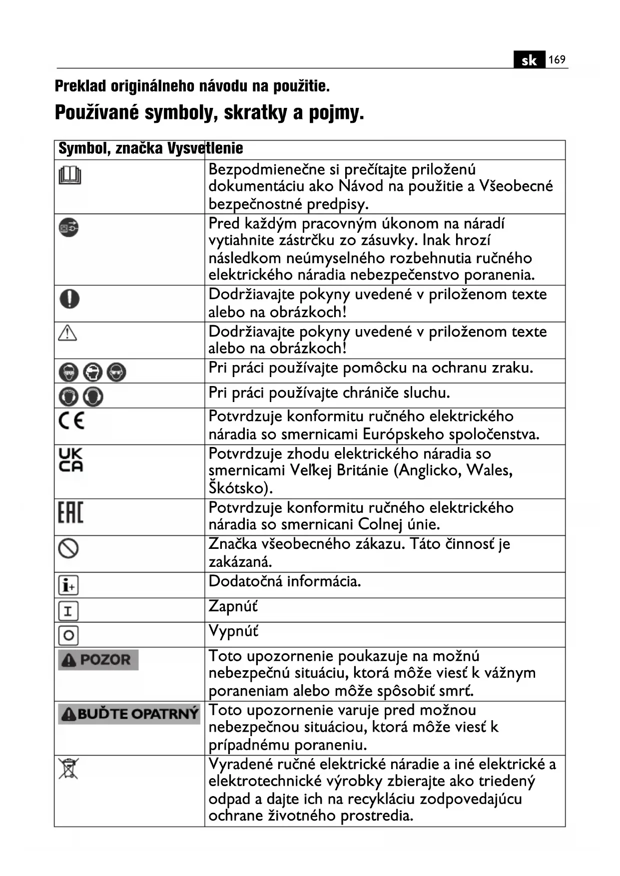 Preklad originálneho návodu na použitie. Používané symboly, skratky a pojmy. Symbol, značka Vysvetlenie Bezpodmienečne si prečítajte priloženú dokumentáciu ako Návod na použitie a Všeobecné bezpečnostné predpisy. Pred každým pracovným úkonom na náradí vytiahnite zástrčku zo zásuvky. Inak hrozí následkom neúmyselného rozbehnutia ručného elektrického náradia nebezpečenstvo poranenia. Dodržiavajte pokyny uvedené v priloženom texte alebo na obrázkoch! Dodržiavajte pokyny uvedené v priloženom texte alebo na obrázkoch! Pri práci používajte pomôcku na ochranu zraku. Pri práci používajte chrániče sluchu. Potvrdzuje konformitu ručného elektrického náradia so smernicami Európskeho spoločenstva. Potvrdzuje zhodu elektrického náradia so smernicami Veľkej Británie (Anglicko, Wales, Škótsko). Potvrdzuje konformitu ručného elektrického náradia so smernicani Colnej únie. Značka všeobecného zákazu. Táto činnosť je zakázaná. Dodatočná informácia. Zapnúť Vypnúť Toto upozornenie poukazuje na možnú nebezpečnú situáciu, ktorá môže viesť k vážnym poraneniam alebo môže spôsobiť smrť. Toto upozornenie varuje pred možnou nebezpečnou situáciou, ktorá môže viesť k prípadnému poraneniu. Vyradené ručné elektrické náradie a iné elektrické a elektrotechnické výrobky zbierajte ako triedený odpad a dajte ich na recykláciu zodpovedajúcu ochrane životného prostredia.170