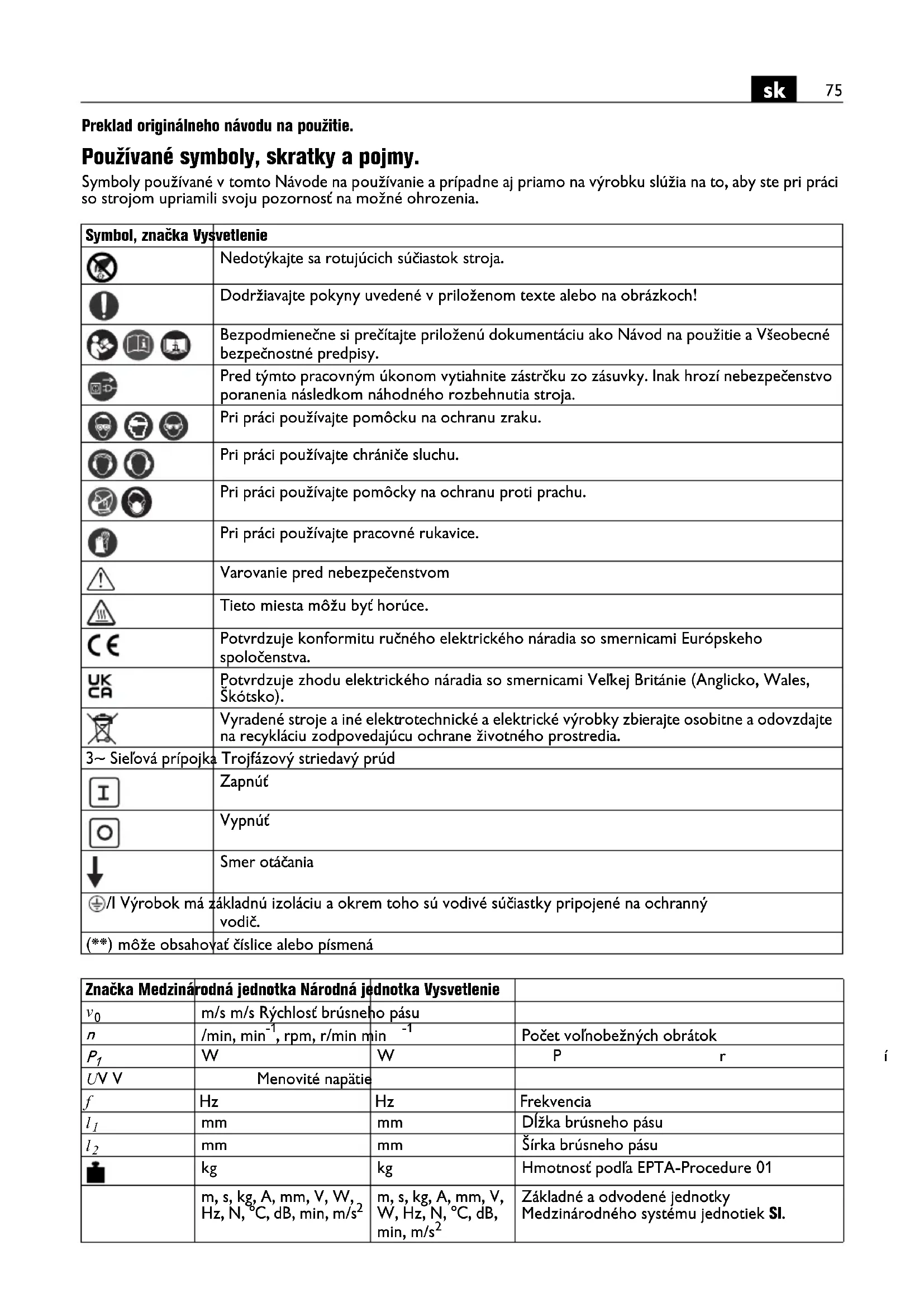 Preklad originálneho návodu na použitie. Používané symboly, skratky a pojmy. Symboly používané v tomto Návode na používanie a prípadne aj priamo na výrobku slúžia na to, aby ste pri práci so strojom upriamili svoju pozornosť na možné ohrozenia. Symbol, značka Vysvetlenie Nedotýkajte sa rotujúcich súčiastok stroja. Dodržiavajte pokyny uvedené v priloženom texte alebo na obrázkoch! Bezpodmienečne si prečítajte priloženú dokumentáciu ako Návod na použitie a Všeobecné bezpečnostné predpisy. Pred týmto pracovným úkonom vytiahnite zástrčku zo zásuvky. Inak hrozí nebezpečenstvo poranenia následkom náhodného rozbehnutia stroja. Pri práci používajte pomôcku na ochranu zraku. Pri práci používajte chrániče sluchu. Pri práci používajte pomôcky na ochranu proti prachu. Pri práci používajte pracovné rukavice. Varovanie pred nebezpečenstvom Tieto miesta môžu byť horúce. Potvrdzuje konformitu ručného elektrického náradia so smernicami Európskeho spoločenstva. Potvrdzuje zhodu elektrického náradia so smernicami Veľkej Británie (Anglicko, Wales, Škótsko). Vyradené stroje a iné elektrotechnické a elektrické výrobky zbierajte osobitne a odovzdajte na recykláciu zodpovedajúcu ochrane životného prostredia. 3~ Sieľová prípojka Trojfázový striedavý prúd Zapnúť Vypnúť Smer otáčania /I Výrobok má základnú izoláciu a okrem toho sú vodivé súčiastky pripojené na ochranný vodič. (**) môže obsahovať číslice alebo písmená Značka Medzinárodná jednotka Národná jednotka Vysvetlenie