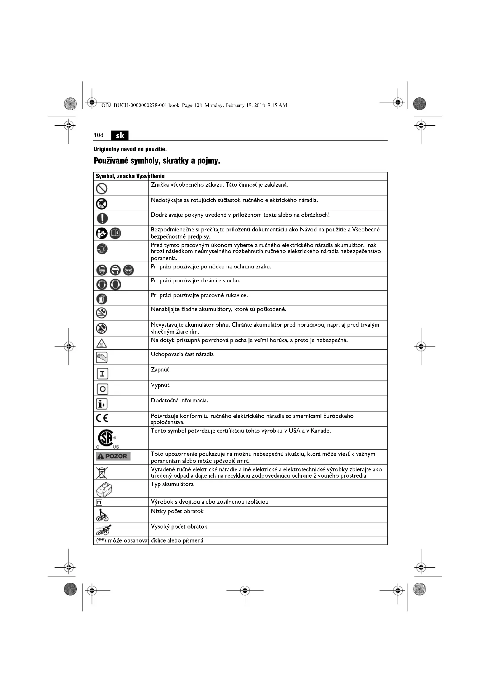 Originálny návod na použitie. Používané symboly, skratky a pojmy. Symbol, značka Vysvetlenie Značka všeobecného zákazu. Táto činnosť je zakázaná. Nedotýkajte sa rotujúcich súčiastok ručného elektrického náradia. Dodržiavajte pokyny uvedené v priloženom texte alebo na obrázkoch! Bezpodmienečne si prečítajte priloženú dokumentáciu ako Návod na použitie a Všeobecné bezpečnostné predpisy. Pred týmto pracovným úkonom vyberte z ručného elektrického náradia akumulátor. Inak hrozí následkom neúmyselného rozbehnutia ručného elektrického náradia nebezpečenstvo poranenia. Pri práci používajte pomôcku na ochranu zraku. Pri práci používajte chrániče sluchu. Pri práci používajte pracovné rukavice. Nenabíjajte žiadne akumulátory, ktoré sú poškodené. Nevystavujte akumulátor ohňu. Chráňte akumulátor pred horúčavou, napr. aj pred trvalým slnečným žiarením. Na dotyk prístupná povrchová plocha je veľmi horúca, a preto je nebezpečná. Uchopovacia časť náradia Zapnúť Vypnúť Dodatočná informácia. Potvrdzuje konformitu ručného elektrického náradia so smernicami Európskeho spoločenstva. Tento symbol potvrdzuje certifikáciu tohto výrobku v USA a v Kanade. Toto upozornenie poukazuje na možnú nebezpečnú situáciu, ktorá môže viesť k vážnym poraneniam alebo môže spôsobiť smrť. Vyradené ručné elektrické náradie a iné elektrické a elektrotechnické výrobky zbierajte ako triedený odpad a dajte ich na recykláciu zodpovedajúcu ochrane životného prostredia. Typ akumulátora Výrobok s dvojitou alebo zosilnenou izoláciou Nízky počet obrátok Vysoký počet obrátok (**) môže obsahovať číslice alebo písmená OBJ_BUCH-0000000278-001.book Page 108 Monday, February 19, 2018 9:15 AM109