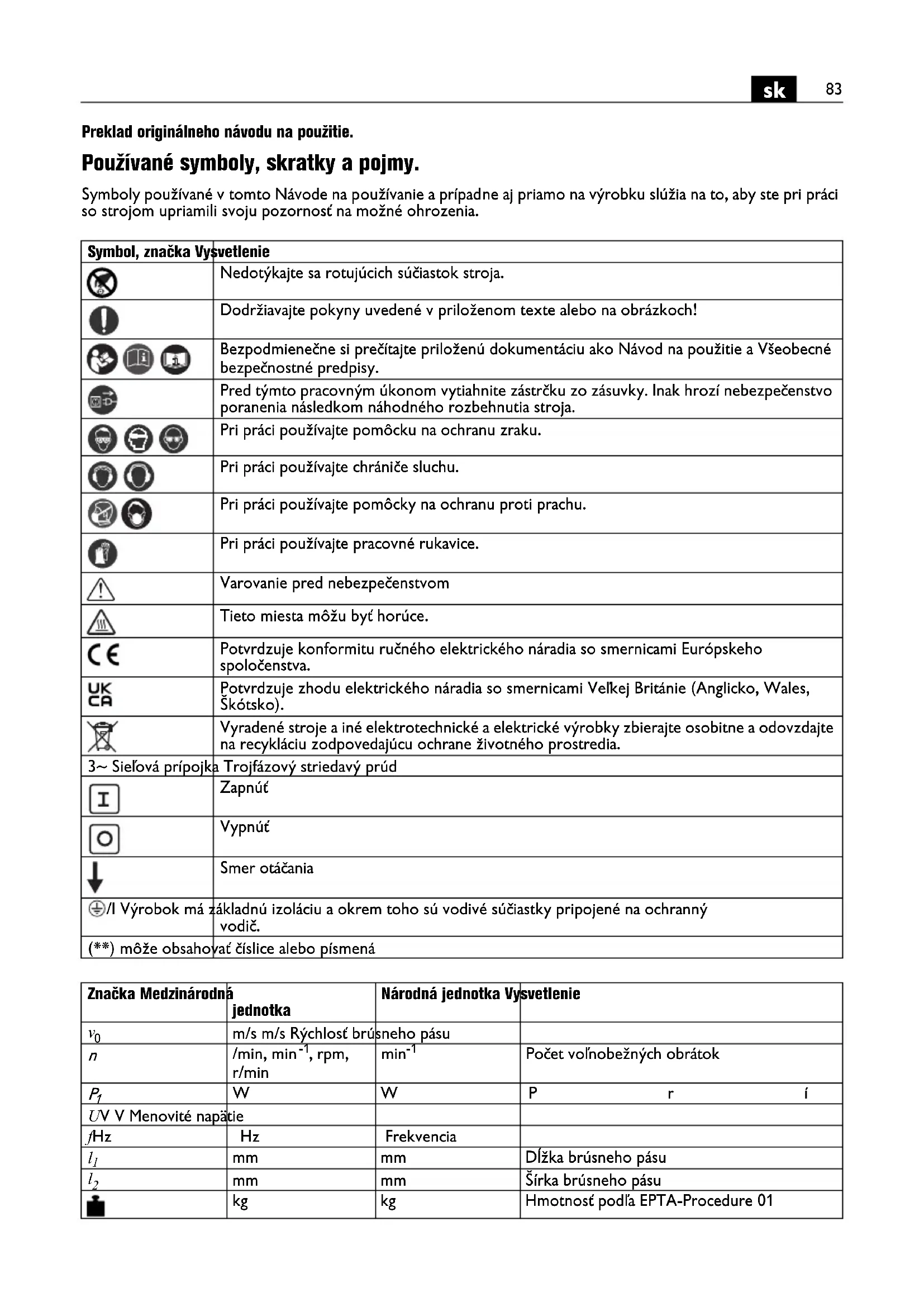 Preklad originálneho návodu na použitie. Používané symboly, skratky a pojmy. Symboly používané v tomto Návode na používanie a prípadne aj priamo na výrobku slúžia na to, aby ste pri práci so strojom upriamili svoju pozornosť na možné ohrozenia. Symbol, značka Vysvetlenie Nedotýkajte sa rotujúcich súčiastok stroja. Dodržiavajte pokyny uvedené v priloženom texte alebo na obrázkoch! Bezpodmienečne si prečítajte priloženú dokumentáciu ako Návod na použitie a Všeobecné bezpečnostné predpisy. Pred týmto pracovným úkonom vytiahnite zástrčku zo zásuvky. Inak hrozí nebezpečenstvo poranenia následkom náhodného rozbehnutia stroja. Pri práci používajte pomôcku na ochranu zraku. Pri práci používajte chrániče sluchu. Pri práci používajte pomôcky na ochranu proti prachu. Pri práci používajte pracovné rukavice. Varovanie pred nebezpečenstvom Tieto miesta môžu byť horúce. Potvrdzuje konformitu ručného elektrického náradia so smernicami Európskeho spoločenstva. Potvrdzuje zhodu elektrického náradia so smernicami Veľkej Británie (Anglicko, Wales, Škótsko). Vyradené stroje a iné elektrotechnické a elektrické výrobky zbierajte osobitne a odovzdajte na recykláciu zodpovedajúcu ochrane životného prostredia. 3~ Sieľová prípojka Trojfázový striedavý prúd Zapnúť Vypnúť Smer otáčania /I Výrobok má základnú izoláciu a okrem toho sú vodivé súčiastky pripojené na ochranný vodič. (**) môže obsahovať číslice alebo písmená Značka Medzinárodná jednotka Národná jednotka Vysvetlenie