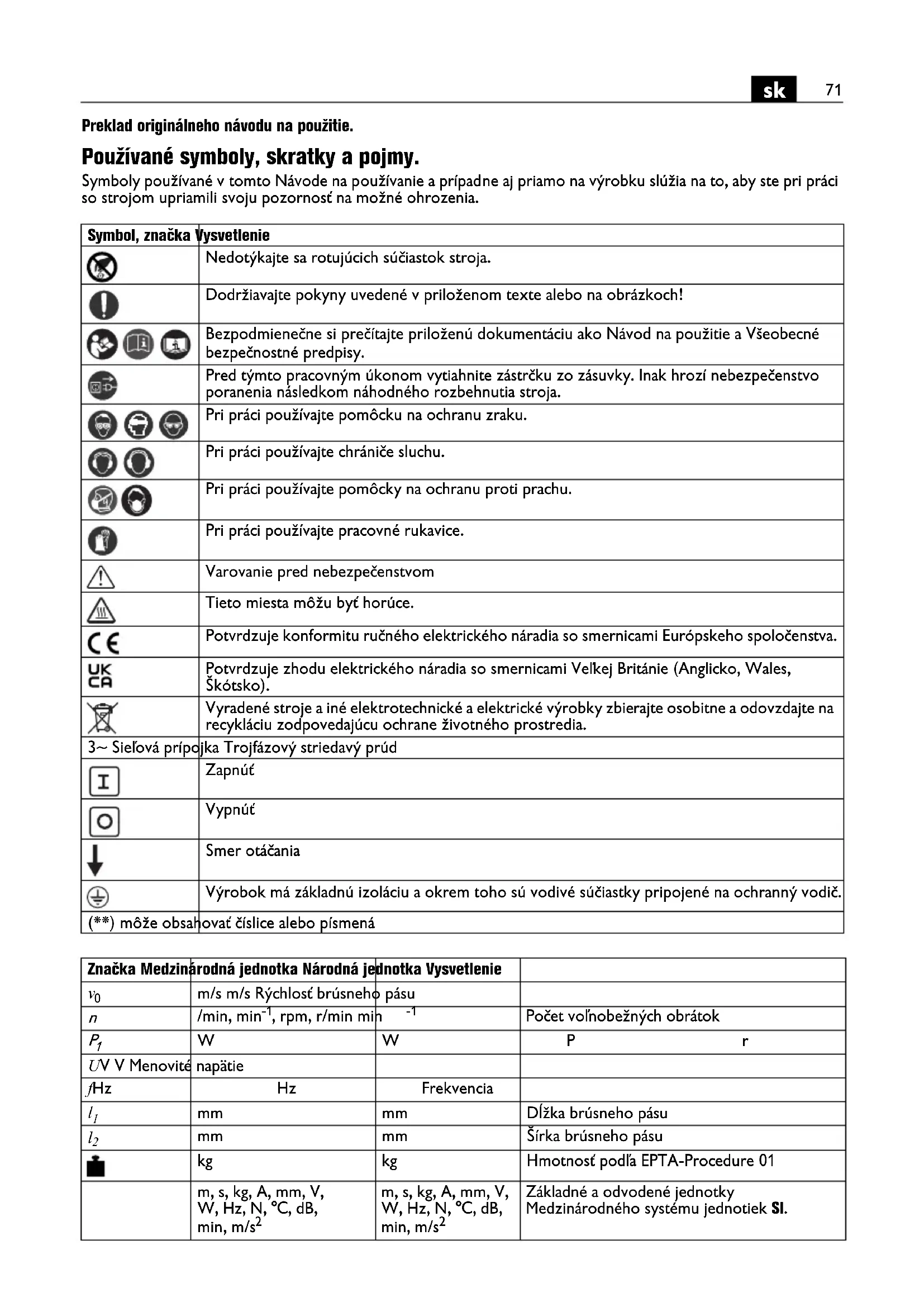 Preklad originálneho návodu na použitie. Používané symboly, skratky a pojmy. Symboly používané v tomto Návode na používanie a prípadne aj priamo na výrobku slúžia na to, aby ste pri práci so strojom upriamili svoju pozornosť na možné ohrozenia. Symbol, značka Vysvetlenie Nedotýkajte sa rotujúcich súčiastok stroja. Dodržiavajte pokyny uvedené v priloženom texte alebo na obrázkoch! Bezpodmienečne si prečítajte priloženú dokumentáciu ako Návod na použitie a Všeobecné bezpečnostné predpisy. Pred týmto pracovným úkonom vytiahnite zástrčku zo zásuvky. Inak hrozí nebezpečenstvo poranenia následkom náhodného rozbehnutia stroja. Pri práci používajte pomôcku na ochranu zraku. Pri práci používajte chrániče sluchu. Pri práci používajte pomôcky na ochranu proti prachu. Pri práci používajte pracovné rukavice. Varovanie pred nebezpečenstvom Tieto miesta môžu byť horúce. Potvrdzuje konformitu ručného elektrického náradia so smernicami Európskeho spoločenstva. Potvrdzuje zhodu elektrického náradia so smernicami Veľkej Británie (Anglicko, Wales, Škótsko). Vyradené stroje a iné elektrotechnické a elektrické výrobky zbierajte osobitne a odovzdajte na recykláciu zodpovedajúcu ochrane životného prostredia. 3~ Sieľová prípojka Trojfázový striedavý prúd Zapnúť Vypnúť Smer otáčania Výrobok má základnú izoláciu a okrem toho sú vodivé súčiastky pripojené na ochranný vodič. (**) môže obsahovať číslice alebo písmená Značka Medzinárodná jednotka Národná jednotka Vysvetlenie