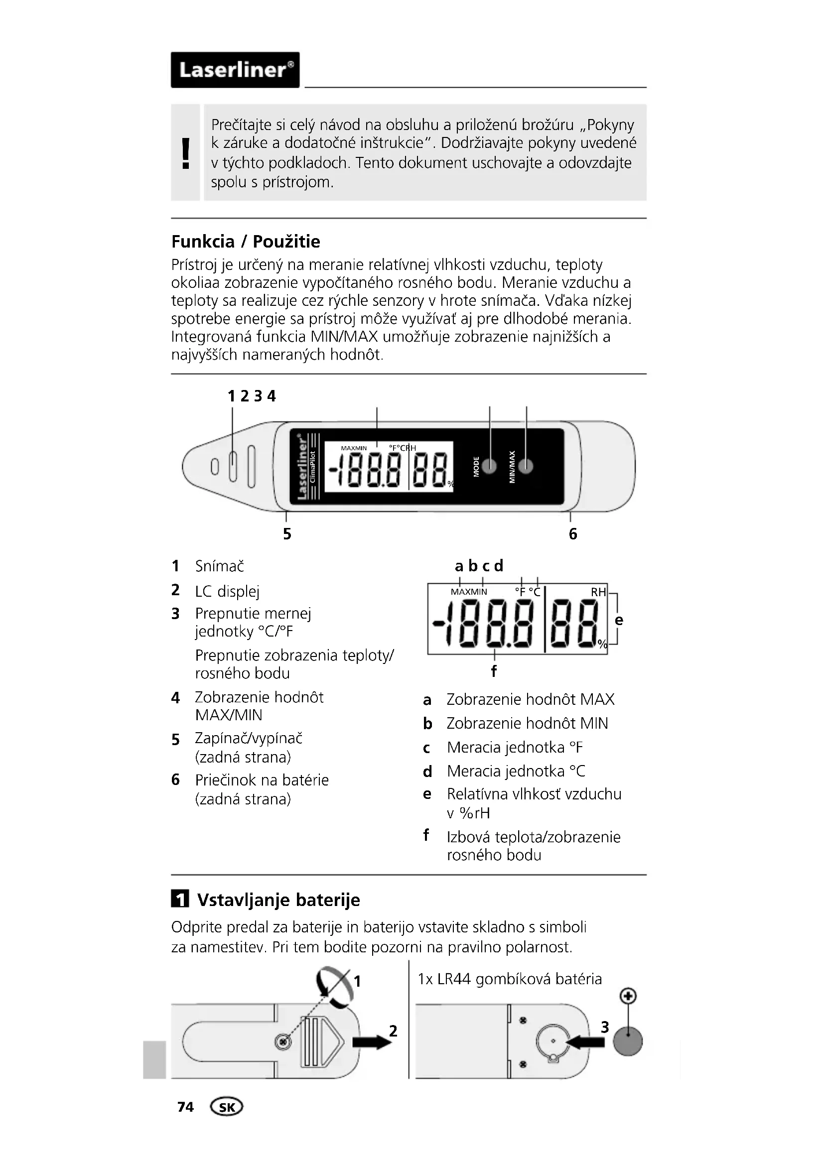 Funkcia / Použitie Prístroj je určený na meranie relatívnej vlhkosti vzduchu, teploty okoliaa zobrazenie vypočítaného rosného bodu. Meranie vzduchu a teploty sa realizuje cez rýchle senzory v hrote snímača. Vďaka nízkej spotrebe energie sa prístroj môže využívať aj pre dlhodobé merania. Integrovaná funkcia MIN/MAX umožňuje zobrazenie najnižších a najvyšších nameraných hodnôt. Snímač LC displej Prepnutie mernej jednotky °C/°F Prepnutie zobrazenia teploty/ rosného bodu Zobrazenie hodnôt MAX/MIN Zapínač/vypínač (zadná strana) Priečinok na batérie (zadná strana) Zobrazenie hodnôt MAX Zobrazenie hodnôt MIN Meracia jednotka °F Meracia jednotka °C Relatívna vlhkosť vzduchu v %rH Izbová teplota/zobrazenie rosného bodu