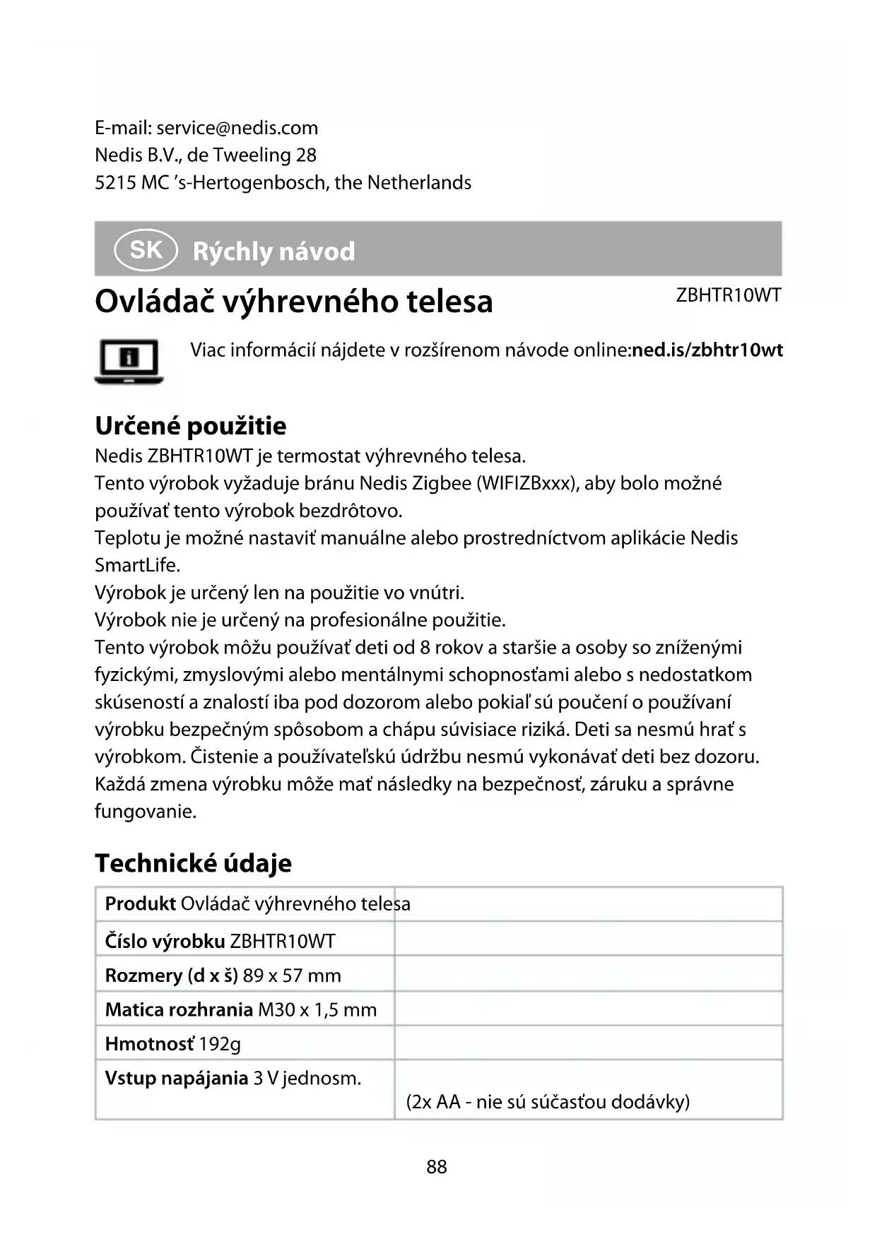 Rýchly návod Ovládač výhrevného telesa ZBHTR10WT Viac informácií nájdete v rozšírenom návode online:ned.is/zbhtr10wt Určené použitie Nedis ZBHTR10WT je termostat výhrevného telesa. Tento výrobok vyžaduje bránu Nedis Zigbee (WIFIZBxxx), aby bolo možné používať tento výrobok bezdrôtovo. Teplotu je možné nastaviť manuálne alebo prostredníctvom aplikácie Nedis SmartLife. Výrobok je určený len na použitie vo vnútri. Výrobok nie je určený na profesionálne použitie. Tento výrobok môžu používať deti od 8 rokov a staršie a osoby so zníženými fyzickými, zmyslovými alebo mentálnymi schopnosťami alebo s nedostatkom skúseností a znalostí iba pod dozorom alebo pokiaľ sú poučení o používaní výrobku bezpečným spôsobom a chápu súvisiace riziká. Deti sa nesmú hrať s výrobkom. Čistenie a používateľskú údržbu nesmú vykonávať deti bez dozoru. Každá zmena výrobku môže mať následky na bezpečnosť, záruku a správne fungovanie. Technické údaje Produkt Ovládač výhrevného telesa Číslo výrobku ZBHTR10WT Rozmery (d x š) 89 x 57 mm Matica rozhrania M30 x 1,5 mm Hmotnosť 192g Vstup napájania 3 V jednosm. (2x AA - nie sú súčasťou dodávky)89 Max. výkon rádiového vysielača 9 dBm Frekvenčné pásmo 2405 - 2480 MHz Bezdrôtová vzdialenosť ≥ 30 metrov na voľnom priestranstve Rozsah nastavenia teploty Automatický režim Manuálny režim Režim ochrany proti zamrznutiu 5 °C ~ 30 °C 5 °C ~ 30 °C 5 °C ~ 15 °C Meranie teploty 0 °C ~ 50 °C Intervaly merania 2 minút Zdvih ventilu Max. 6 mm Úroveň hluku <35 dBa Teplota prostredia -20 °C ~ 65 °C Teplota skladovania 0 °C ~ 40 °C Max. teplota vody 90 °C Environmentálne normy RoHS Hlavné časti (obrázok A) 1 Kruhová matica 2 Telo 3 Ovládač termostatu 4 LCD displej 5 Chyba 6 Takmer úplne vybitá batéria 7 Nastavená teplota 8 Detekcia otvoreného okna 9 Automatický režim q Detská poistka w Indikátor siete e Režim inštalácie r Manuálny režim Prehľad aplikácie (obrázok B) 1 Stav batérie 2 Nastavená teplota 3 Teplota v miestnosti 4 Manuálny režim 5 Automatický režim 6 Detský zámok 7 Detekcia ventilu 8 Ovládač na nastavenie teploty 9 Teplotný rozsah q Režim ochrany proti zamrznutiu w Detekcia otvoreného okna90 Bezpečnostné pokyny