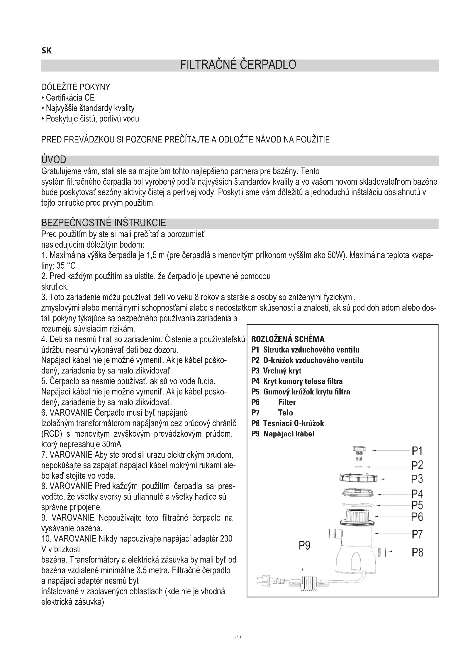 - Poskytuje čistú, perlivú vodu PRED PREVÁDZKOU SI POZORNE PREČÍTAJTE A ODLOŽTE NÁVOD NA POUŽITIE ÚVOD Gratulujeme vám, stali ste sa majiteľom tohto najlepšieho partnera pre bazény. Tento systém ltračného čerpadla bol vyrobený podľa najvyšších štandardov kvality a vo vašom novom skladovateľnom bazéne bude poskytovať sezóny aktivity čistej a perlivej vody. Poskytli sme vám dôležitú a jednoduchú inštaláciu obsiahnutú v tejto príručke pred prvým použitím.