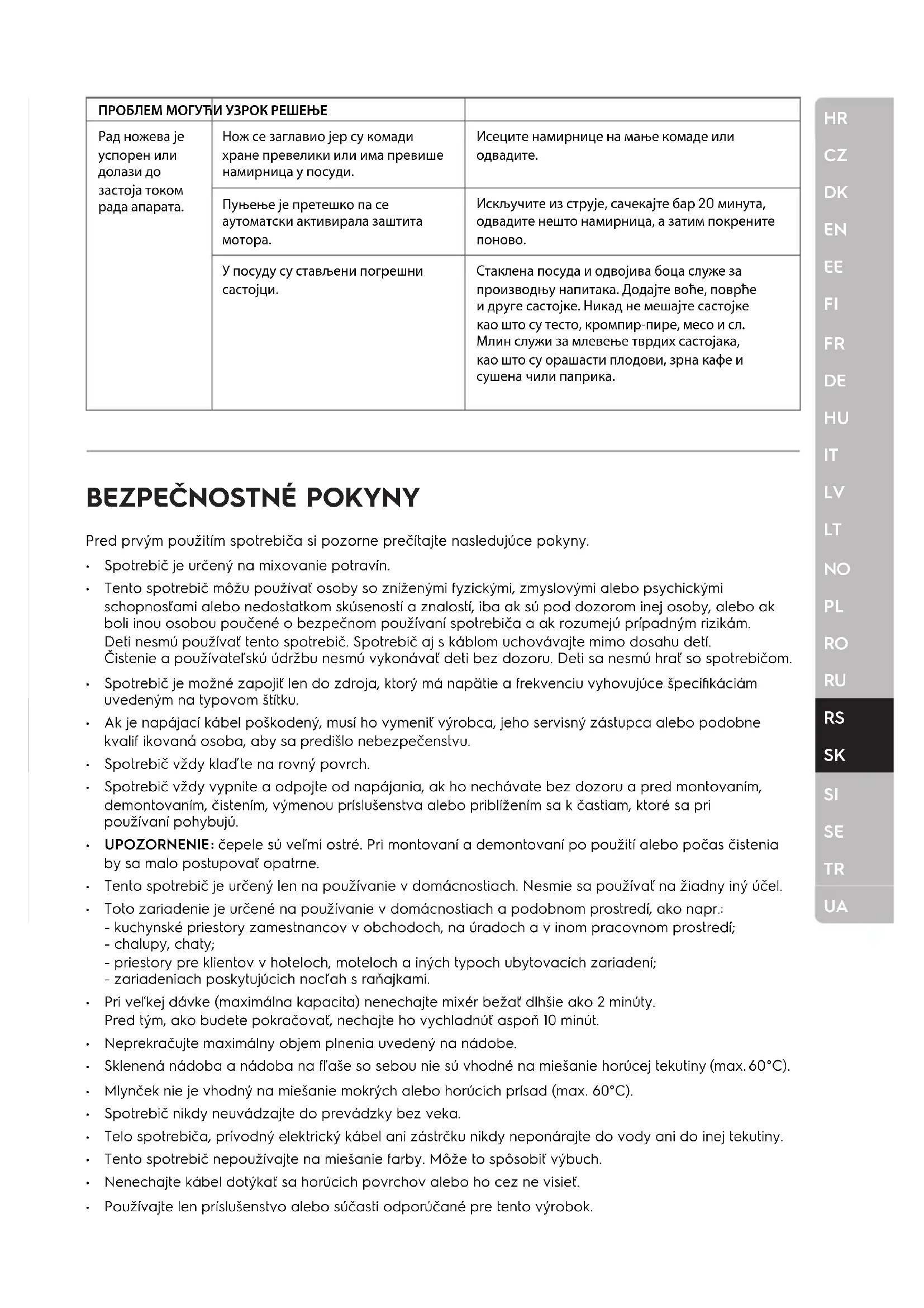 Spotrebič je určený na mixovanie potravín. Tento spotrebič môžu používať osoby so zníženými fyzickými, zmyslovými alebo psychickými schopnosťami alebo nedostatkom skúseností a znalostí, iba ak sú pod dozorom inej osoby, alebo ak boli inou osobou poučené o bezpečnom používaní spotrebiča a ak rozumejú prípadným rizikám. Deti nesmú používať tento spotrebič. Spotrebič aj s káblom uchovávajte mimo dosahu detí. Čistenie a používateľskú údržbu nesmú vykonávať deti bez dozoru. Deti sa nesmú hrať so spotrebičom. Spotrebič je možné zapojiť len do zdroja, ktorý má napätie a frekvenciu vyhovujúce špecifikáciám uvedeným na typovom štítku. Ak je napájací kábel poškodený, musí ho vymeniť výrobca, jeho servisný zástupca alebo podobne kvalif ikovaná osoba, aby sa predišlo nebezpečenstvu. Spotrebič vždy klaďte na rovný povrch. Spotrebič vždy vypnite a odpojte od napájania, ak ho nechávate bez dozoru a pred montovaním, demontovaním, čistením, výmenou príslušenstva alebo priblížením sa k častiam, ktoré sa pri používaní pohybujú. UPOZORNENIE: čepele sú veľmi ostré. Pri montovaní a demontovaní po použití alebo počas čistenia by sa malo postupovať opatrne. Tento spotrebič je určený len na používanie v domácnostiach. Nesmie sa používať na žiadny iný účel. Toto zariadenie je určené na používanie v domácnostiach a podobnom prostredí, ako napr.: - kuchynské priestory zamestnancov v obchodoch, na úradoch a v inom pracovnom prostredí; - chalupy, chaty; - priestory pre klientov v hoteloch, moteloch a iných typoch ubytovacích zariadení; - zariadeniach poskytujúcich nocľah s raňajkami. Pri veľkej dávke (maximálna kapacita) nenechajte mixér bežať dlhšie ako 2 minúty. Pred tým, ako budete pokračovať, nechajte ho vychladnúť aspoň 10 minút. Neprekračujte maximálny objem plnenia uvedený na nádobe. Sklenená nádoba a nádoba na fľaše so sebou nie sú vhodné na miešanie horúcej tekutiny (max. 60°C). Mlynček nie je vhodný na miešanie mokrých alebo horúcich prísad (max. 60°C). Spotrebič nikdy neuvádzajte do prevádzky bez veka. Telo spotrebiča, prívodný elektrický kábel ani zástrčku nikdy neponárajte do vody ani do inej tekutiny. Tento spotrebič nepoužívajte na miešanie farby. Môže to spôsobiť výbuch. Nenechajte kábel dotýkať sa horúcich povrchov alebo ho cez ne visieť. Používajte len príslušenstvo alebo súčasti odporúčané pre tento výrobok.HR