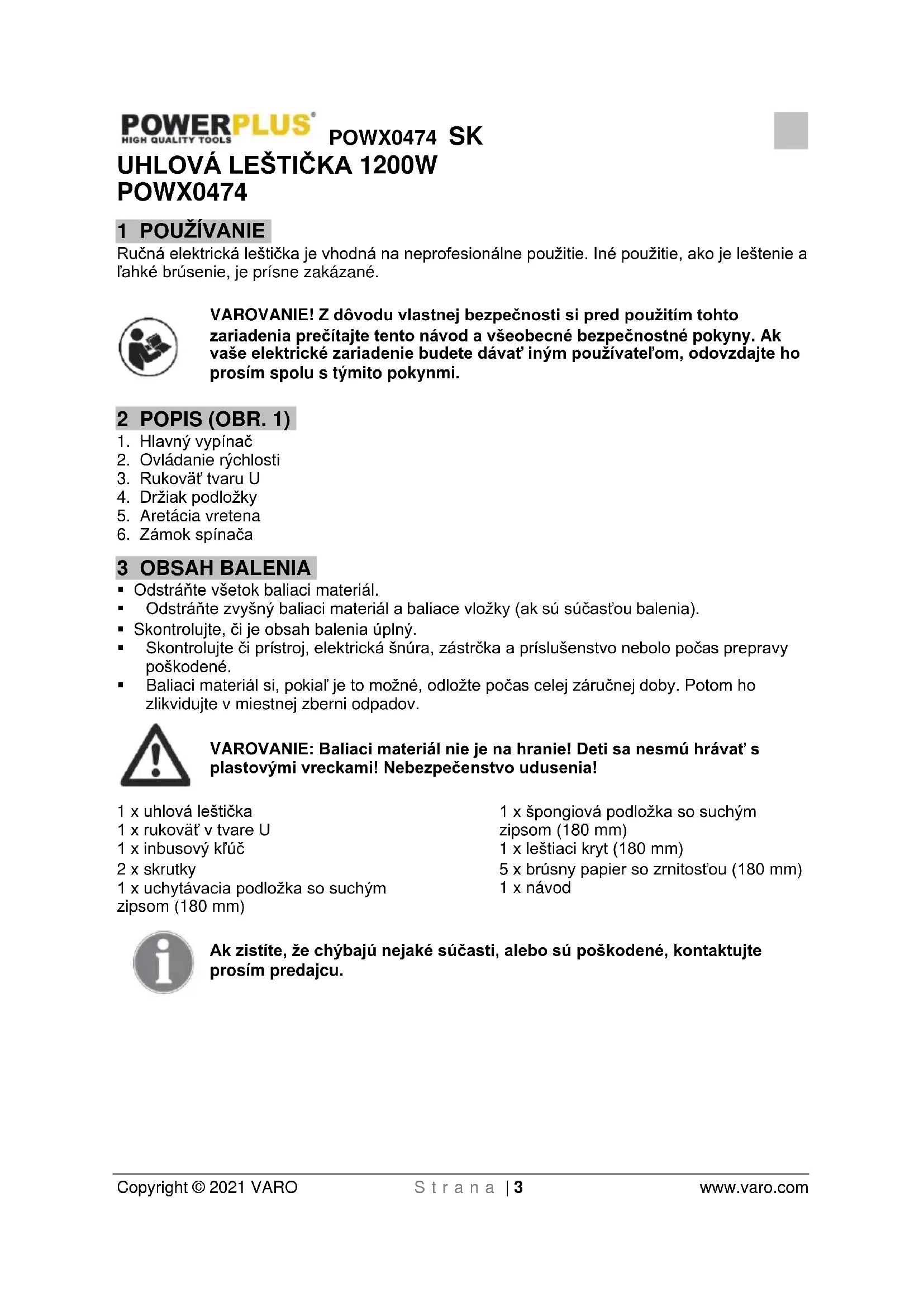 - Baliaci materiál si, pokiaľ je to možné, odložte počas celej záručnej doby. Potom ho zlikvidujte v miestnej zberni odpadov. VAROVANIE: Baliaci materiál nie je na hranie! Deti sa nesmú hrávať s plastovými vreckami! Nebezpečenstvo udusenia! 1 x uhlová leštička 1 x rukoväť v tvare U 1 x inbusový kľúč 2 x skrutky 1 x uchytávacia podložka so suchým zipsom (180 mm) 1 x špongiová podložka so suchým zipsom (180 mm) 1 x leštiaci kryt (180 mm) 5 x brúsny papier so zrnitosťou (180 mm) 1 x návod Ak zistíte, že chýbajú nejaké súčasti, alebo sú poškodené, kontaktujte prosím predajcu.POWX0474 SK Copyright © 2021 VARO S t r a n a | 4 www.varo.com 4 SYMBOLY V tomto návode a/alebo na stroji sa používajú nasledujúce symboly: