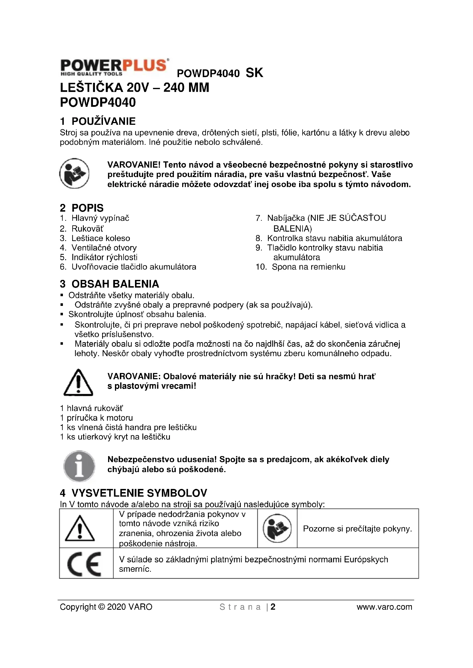 VARO – Vic. Van Rompuy N.V. - Joseph Van Instraat 9 - BE2500 Lier - BELGICKO vyhlasuje, že výrobok: Leštička obchodná známka: POWERplus model: POWDP4040 je v súlade so základnými požiadavkami a inými relevantnými ustanoveniami príslušných európskych smerníc, na základe uplatnenia európskych harmonizovaných noriem. V prípade akýchkoľvek neoprávnených úprav tohto zariadenia stráca toto vyhlásenie svoju platnosť. Európske smernice (vrátane ich prípadných novelizácií do dátumu podpisu): 2011/65/EÚ 2006/42/ES 2014/30/EÚ Európske harmonizované normy (vrátane ich prípadných novelizácií do dátumu podpisu): EN62841-1 : 2015 EN62841-2-4 : 2014* EN55014-1 : 2017 EN55014-2 : 2015 Uchovávateľ technickej dokumentácie: Philippe Vankerkhove, VARO – Vic. Van Rompuy N.V. Nižšie podpísaný koná v mene výkonného riaditeľa spoločnosti, Ludo Mertens Regulačné záležitosti – Compliance Manager 12/08/2020, Lier - BelgiumPOWDP4040 RO Copyright © 2020 VARO P a g i n a | 1 www.varo.com