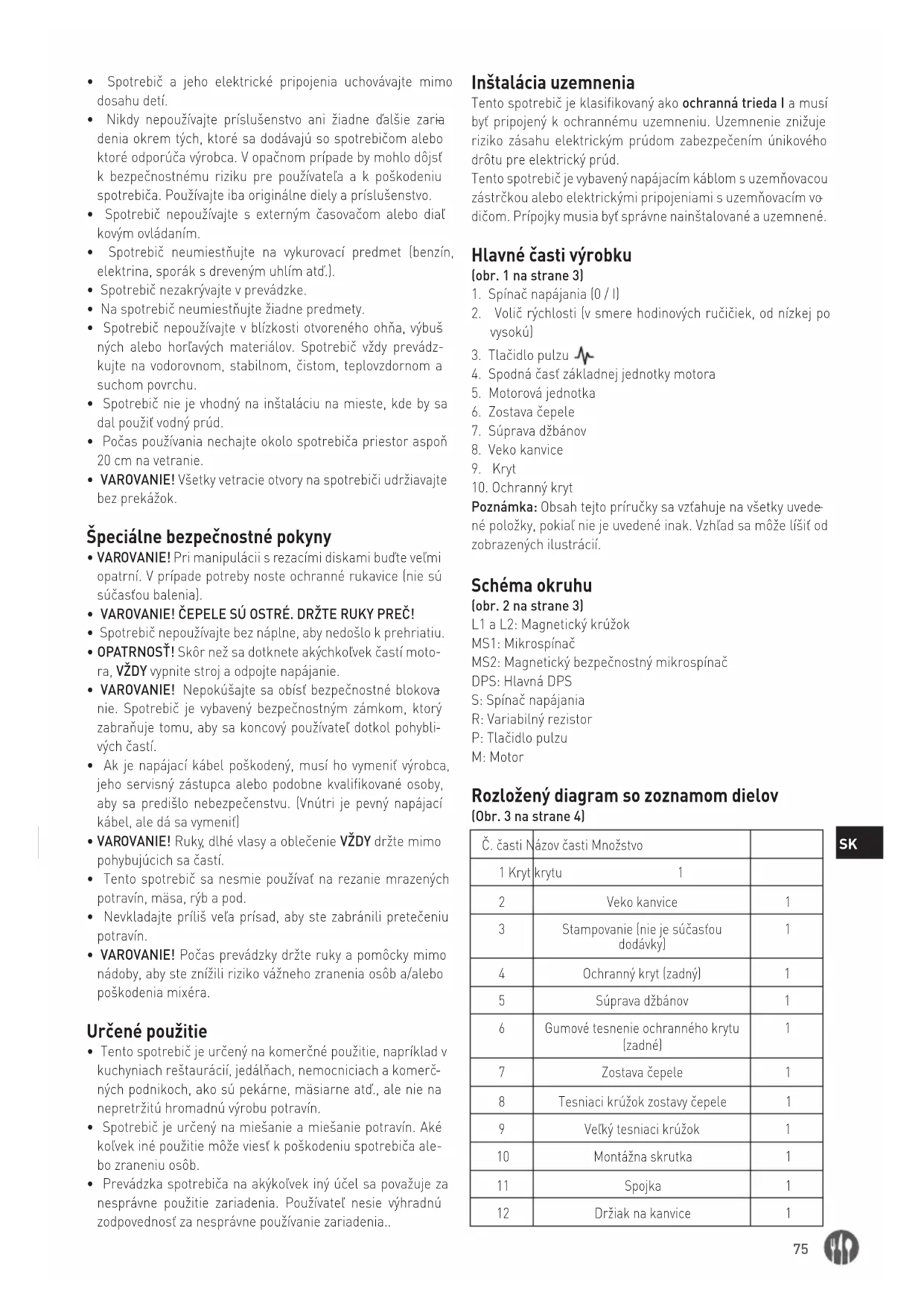 né položky, pokiaľ nie je uvedené inak. Vzhľad sa môže líšiť od zobrazených ilustrácií. Schéma okruhu (obr. 2 na strane 3) L1 a L2: Magnetický krúžok MS1: Mikrospínač MS2: Magnetický bezpečnostný mikrospínač DPS: Hlavná DPS S: Spínač napájania R: Variabilný rezistor P: Tlačidlo pulzu M: Motor Rozložený diagram so zoznamom dielov (Obr. 3 na strane 4) Č. časti Názov časti Množstvo 1 Kryt krytu 1 2 Veko kanvice 1 3 Stampovanie (nie je súčasťou dodávky)
