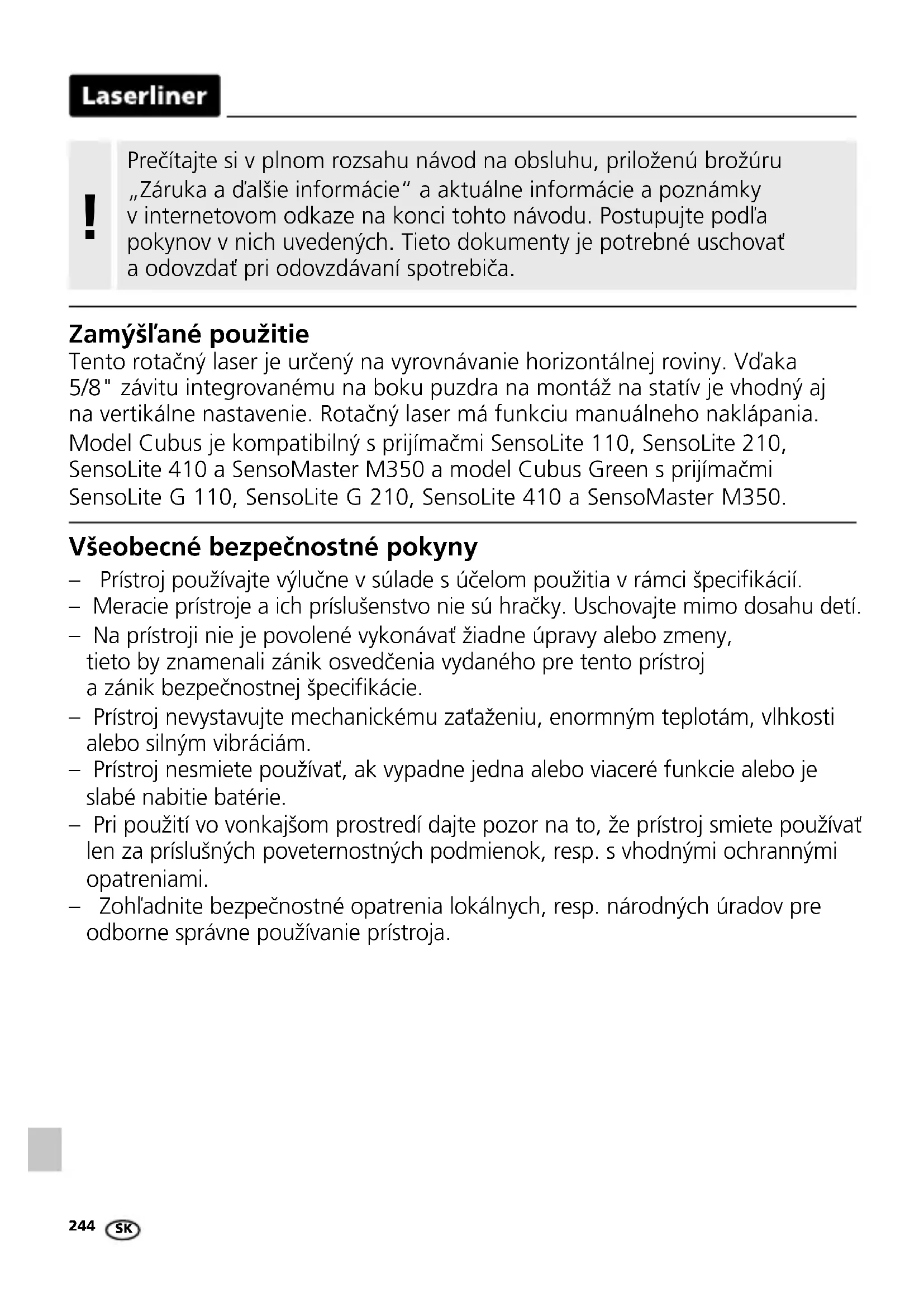 – Prístroj používajte výlučne v súlade s účelom použitia v rámci špecikácií. – Meracie prístroje a ich príslušenstvo nie sú hračky. Uschovajte mimo dosahu detí. – Na prístroji nie je povolené vykonávať žiadne úpravy alebo zmeny, tieto by znamenali zánik osvedčenia vydaného pre tento prístroj a zánik bezpečnostnej špecikácie. – Prístroj nevystavujte mechanickému zaťaženiu, enormným teplotám, vlhkosti alebo silným vibráciám. – Prístroj nesmiete používať, ak vypadne jedna alebo viaceré funkcie alebo je slabé nabitie batérie. – Pri použití vo vonkajšom prostredí dajte pozor na to, že prístroj smiete používať len za príslušných poveternostných podmienok, resp. s vhodnými ochrannými opatreniami. – Zohľadnite bezpečnostné opatrenia lokálnych, resp. národných úradov pre odborne správne používanie prístroja. Všeobecné bezpečnostné pokyny Zamýšľané použitie Tento rotačný laser je určený na vyrovnávanie horizontálnej roviny. Vďaka 5/8" závitu integrovanému na boku puzdra na montáž na statív je vhodný aj na vertikálne nastavenie. Rotačný laser má funkciu manuálneho naklápania. Model Cubus je kompatibilný s prijímačmi SensoLite 110, SensoLite 210, SensoLite 410 a SensoMaster M350 a model Cubus Green s prijímačmi SensoLite G 110, SensoLite G 210, SensoLite 410 a SensoMaster M350. Prečítajte si v plnom rozsahu návod na obsluhu, priloženú brožúru „Záruka a ďalšie informácie“ a aktuálne informácie a poznámky v internetovom odkaze na konci tohto návodu. Postupujte podľa pokynov v nich uvedených. Tieto dokumenty je potrebné uschovať a odovzdať pri odovzdávaní spotrebiča. !Cubus / Cubus Green