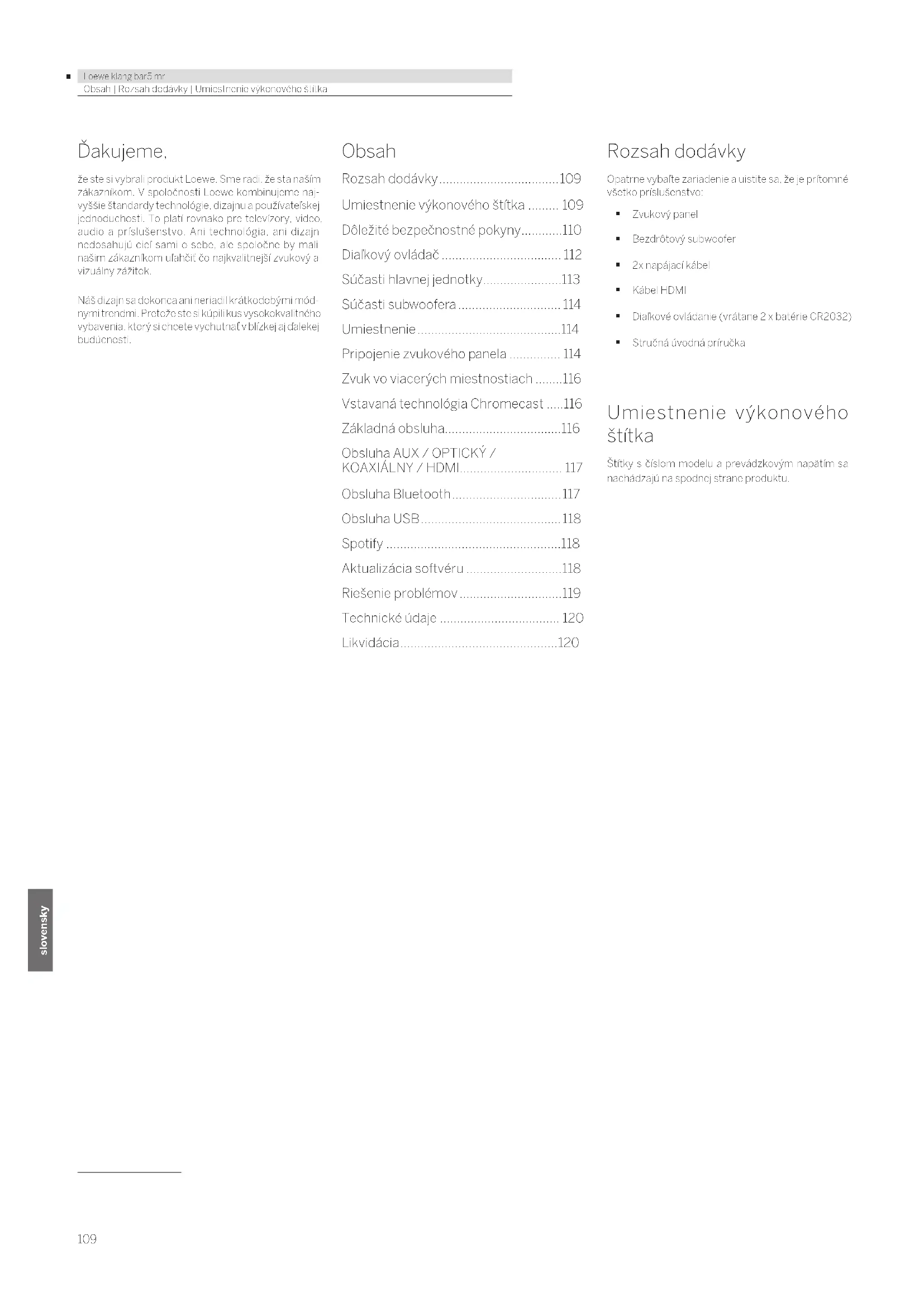 - Loewe klang bar5 mr allemand slovensky Obsah | Rozsah dodávky | Umiestnenie výkonového štítka Ďakujeme, že ste si vybrali produkt Loewe. Sme radi, že sta naším zákazníkom. V spoločnosti Loewe kombinujeme naj- vyššie štandardy technológie, dizajnu a používateľskej jednoduchosti. To platí rovnako pre televízory, video, audio a príslušenstvo. Ani technológia, ani dizajn nedosahujú cieľ sami o sebe, ale spoločne by mali našim zákazníkom uľahčiť čo najkvalitnejší zvukový a vizuálny zážitok. Náš dizajn sa dokonca ani neriadil krátkodobými mód- nymi trendmi. Pretože ste si kúpili kus vysokokvalitného vybavenia, ktorý si chcete vychutnať v blízkej aj ďalekej budúcnosti. Obsah Rozsah dodávky p. 109