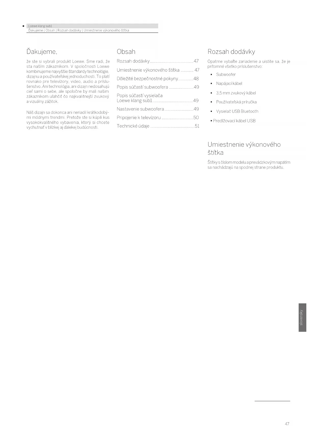 Stiahnite si návod pre váš Reproduktor vo formáte PDF zadarmo! Nájdite svoj návod Klang sub1 - LOEWE a vezmite svoje elektronické zariadenie späť do rúk. Na tejto stránke sú zverejnené všetky dokumenty potrebné na používanie vášho zariadenia. Klang sub1 značky LOEWE.