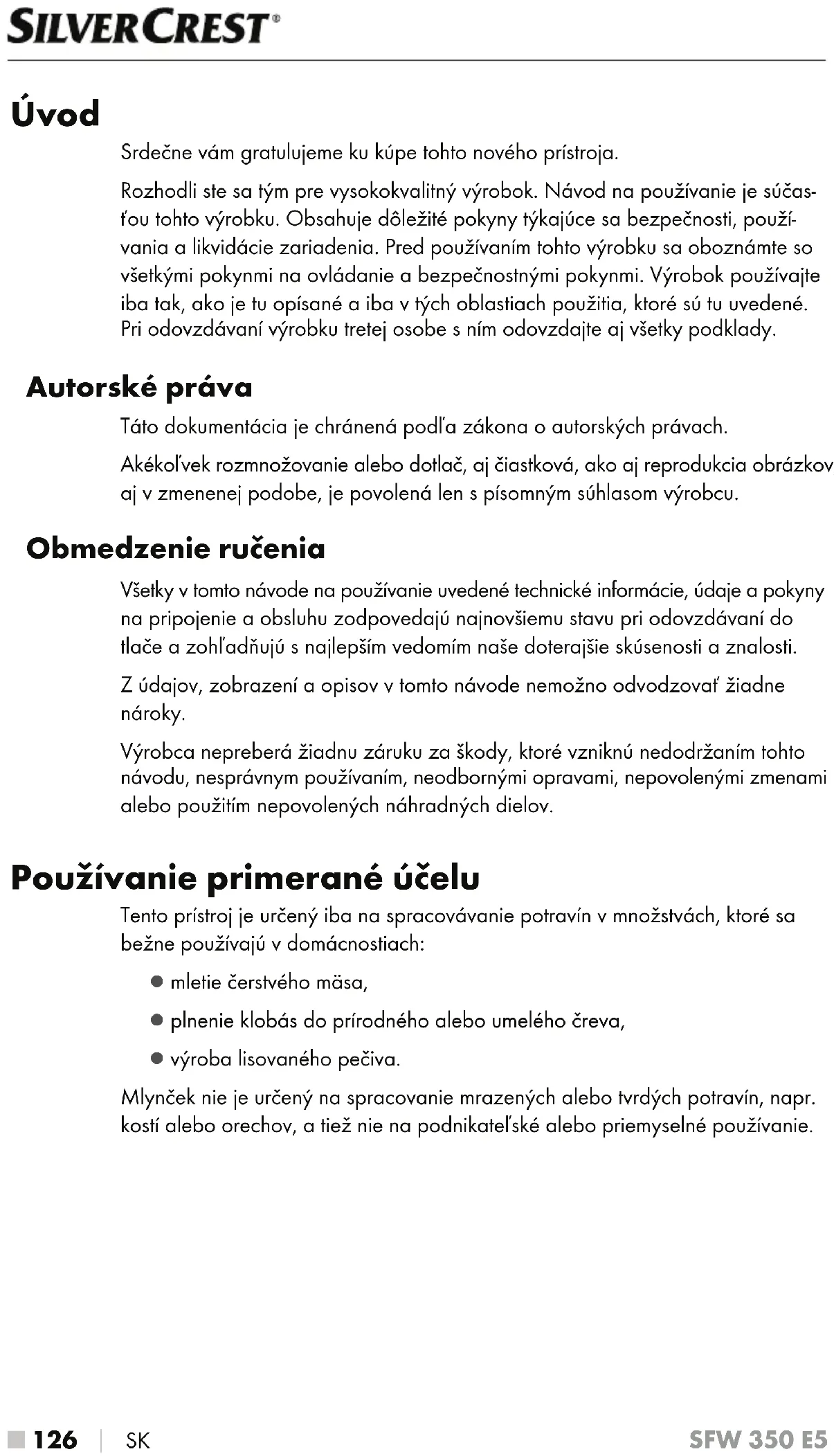 SK SFW 350 E5 Úvod Srdečne vám gratulujeme ku kúpe tohto nového prístroja. Rozhodli ste sa tým pre vysokokvalitný výrobok. Návod na používanie je súčas- ťou tohto výrobku. Obsahuje dôležité pokyny týkajúce sa bezpečnosti, použí- vania a likvidácie zariadenia. Pred používaním tohto výrobku sa oboznámte so všetkými pokynmi na ovládanie a bezpečnostnými pokynmi. Výrobok používajte iba tak, ako je tu opísané a iba v tých oblastiach použitia, ktoré sú tu uvedené. Pri odovzdávaní výrobku tretej osobe s ním odovzdajte aj všetky podklady. Autorské práva Táto dokumentácia je chránená podľa zákona o autorských právach. Akékoľvek rozmnožovanie alebo dotlač, aj čiastková, ako aj reprodukcia obrázkov, aj v zmenenej podobe, je povolená len s písomným súhlasom výrobcu. Obmedzenie ručenia Všetky v tomto návode na používanie uvedené technické informácie, údaje a pokyny na pripojenie a obsluhu zodpovedajú najnovšiemu stavu pri odovzdávaní do tlače a zohľadňujú s najlepším vedomím naše doterajšie skúsenosti a znalosti. Z údajov, zobrazení a opisov v tomto návode nemožno odvodzovať žiadne nároky. Výrobca nepreberá žiadnu záruku za škody, ktoré vzniknú nedodržaním tohto návodu, nesprávnym používaním, neodbornými opravami, nepovolenými zmenami alebo použitím nepovolených náhradných dielov. Používanie primerané účelu Tento prístroj je určený iba na spracovávanie potravín v množstvách, ktoré sa bežne používajú v domácnostiach: ▯ mletie čerstvého mäsa, ▯ plnenie klobás do prírodného alebo umelého čreva, ▯ výroba lisovaného pečiva. Mlynček nie je určený na spracovanie mrazených alebo tvrdých potravín, napr. kostí alebo orechov, a tiež nie na podnikateľské alebo priemyselné používanie.SK