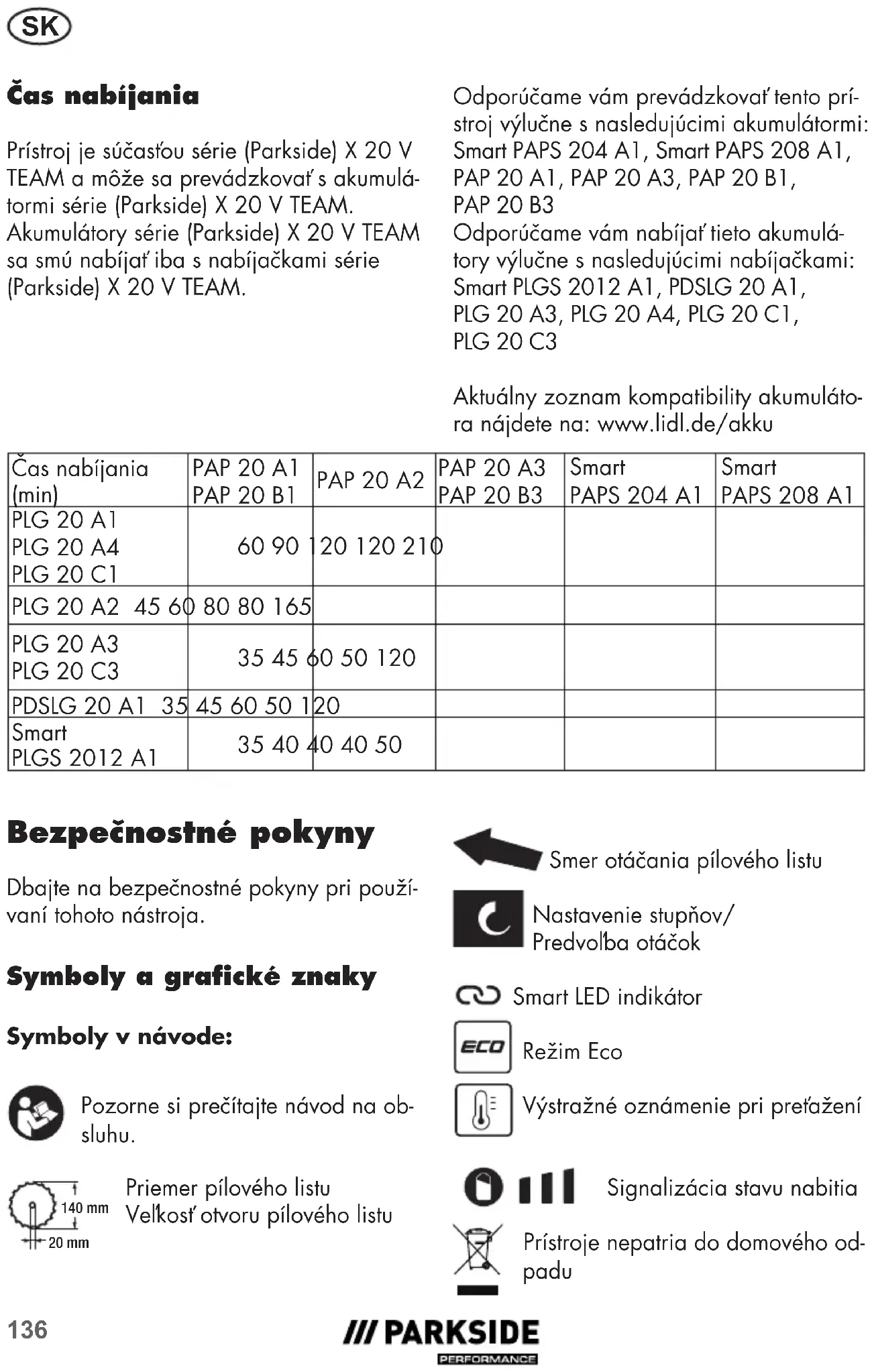 Upozornenie!Tentoelektrickýprí- strojpočasprevádzkyvytváraelek- tromagneticképole.Totopolemôžezaur- čitýchokolnostíovplyvniťaktívnealebopa- sívnelekárskeimplantáty.Abysazabráni- lonebezpečenstvuvážnychalebosmrteľ- nýchzranení,odporúčame,abyosobys lekárskymiimplantátmikonzultovalisvojho lekáraalebovýrobculekárskehoimplantá- tupredsamotnouobsluhouprístroja. Dodržiavajte bezpečnostné pokyny a pokyny k nabíjaniu a správnemu používaniu, ktoré sú uvedené v návode na obsluhu váš- ho akumulátora a vašej nabíjačky série (Parkside) X20VTeam. Pod- robnejší opis k nabíjaniu a ďalšie informácie nájdete v tomto samo- statnom návode na používanie. Bezpečnostnépokynypre všetkypíly PÍLY A SPÔSOBY PÍLENIA