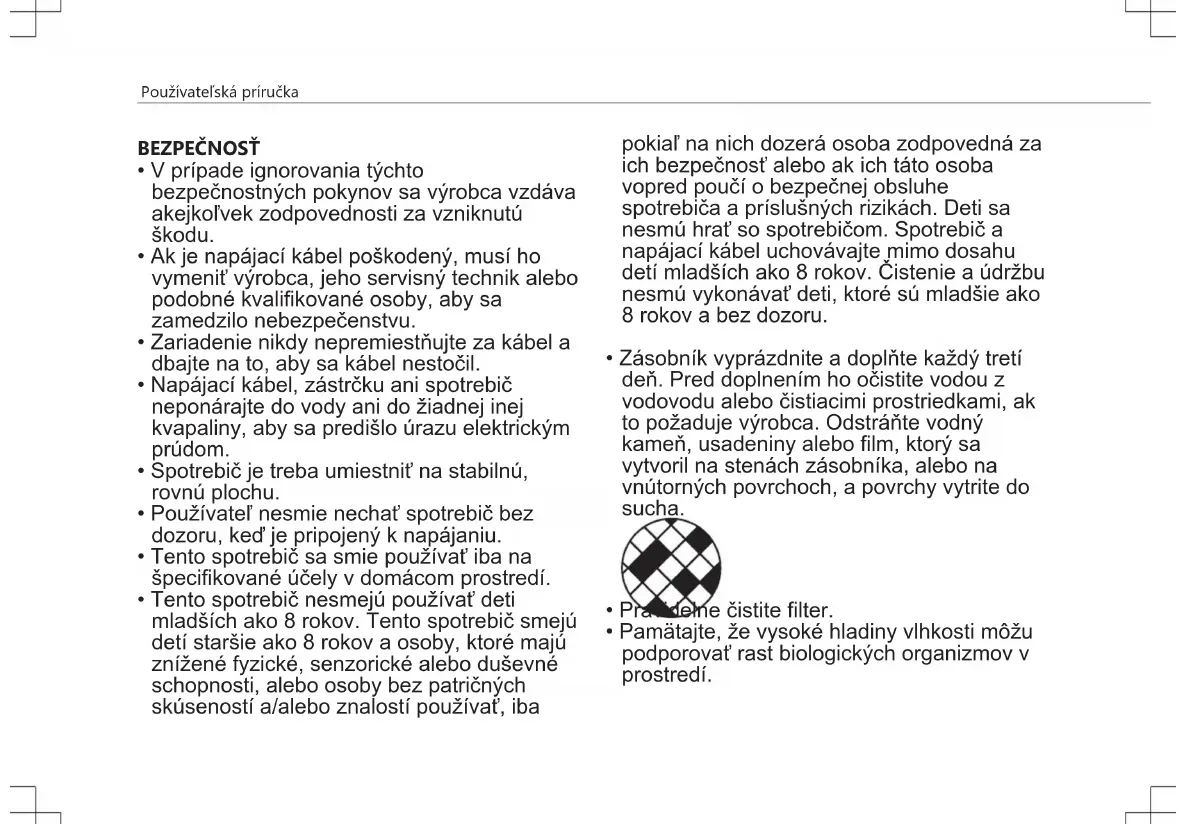 - Tento spotrebič nesmejú používať deti mladších ako 8 rokov. Tento spotrebič smejú detí staršie ako 8 rokov a osoby, ktoré majú znížené fyzické, senzorické alebo duševné schopnosti, alebo osoby bez patričných skúseností a/alebo znalostí používať, iba pokiaľ na nich dozerá osoba zodpovedná za ich bezpečnosť alebo ak ich táto osoba vopred poučí o bezpečnej obsluhe spotrebiča a príslušných rizikách. Deti sa nesmú hrať so spotrebičom. Spotrebič a napájací kábel uchovávajte mimo dosahu detí mladších ako 8 rokov. Čistenie a údržbu nesmú vykonávať deti, ktoré sú mladšie ako 8 rokov abez dozoru.