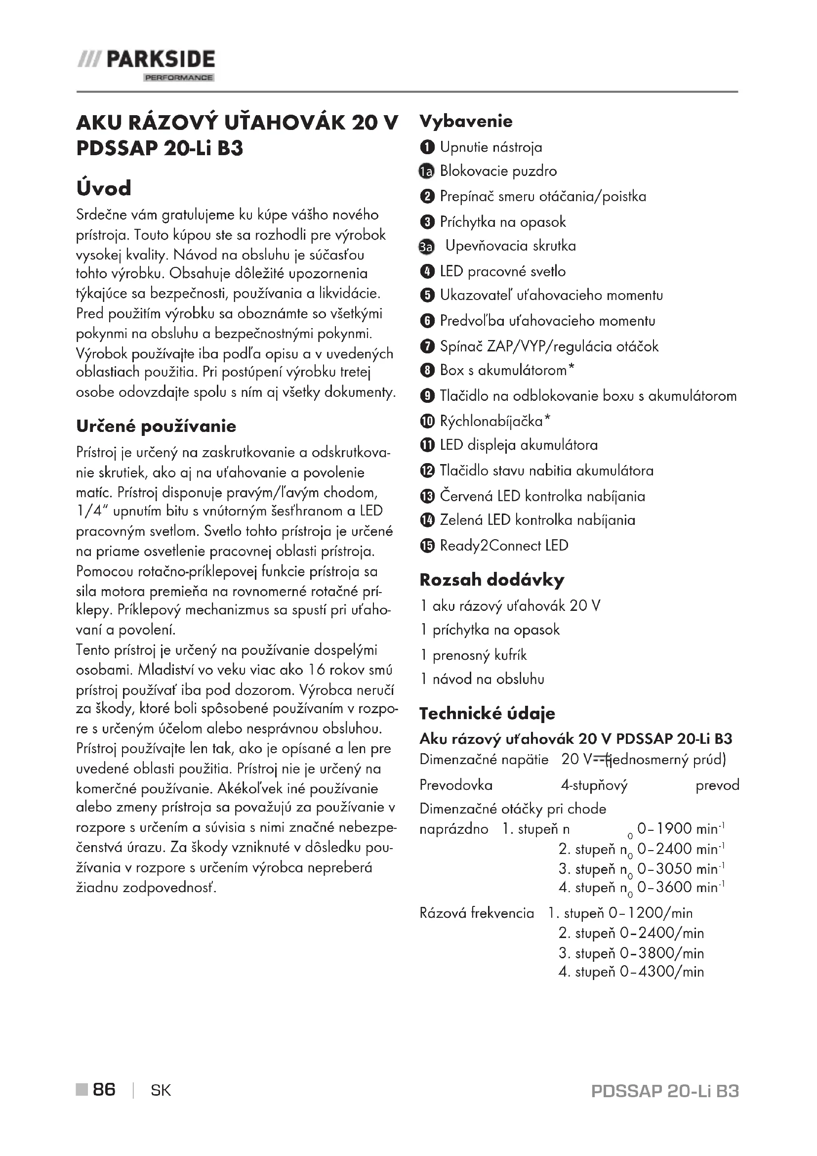 SK AKU RÁZOVÝ UŤAHOVÁK 20 V PDSSAP 20-Li B3 Úvod Srdečne vám gratulujeme kukúpe vášho nového prístroja. Touto kúpou ste sa rozhodli pre výrobok vysokej kvality. Návod na obsluhu je súčasťou tohto výrobku. Obsahuje dôležité upozornenia týkajúce sa bezpečnosti, používania a likvidácie. Pred použitím výrobku sa oboznámte sovšetkými pokynmi na obsluhu a bezpečnostnými pokynmi. Výrobok používajte iba podľa opisu a vuvedených oblastiach použitia. Pri postúpení výrobku tretej osobe odovzdajte spolu sním aj všetky dokumenty. Určené používanie Prístroj je určený na zaskrutkovanie a odskrutkova- nie skrutiek, ako aj na uťahovanie a povolenie matíc. Prístroj disponuje pravým/ľavým chodom, 1/4“ upnutím bitu s vnútorným šesťhranom a LED pracovným svetlom. Svetlo tohto prístroja je určené na priame osvetlenie pracovnej oblasti prístroja. Pomocou rotačno-príklepovej funkcie prístroja sa sila motora premieňa na rovnomerné rotačné prí- klepy. Príklepový mechanizmus sa spustí pri uťaho- vaní a povolení. Tento prístroj je určený na používanie dospelými osobami. Mladiství vo veku viac ako 16 rokov smú prístroj používať iba pod dozorom. Výrobca neručí za škody, ktoré boli spôsobené používaním v rozpo- re surčeným účelom alebo nesprávnou obsluhou. Prístroj používajte len tak, ako je opísané a len pre uvedené oblasti použitia. Prístroj nie je určený na komerčné používanie. Akékoľvek iné používanie alebo zmeny prístroja sa považujú za používanie v rozpore surčením a súvisia s nimi značné nebezpe- čenstvá úrazu. Za škody vzniknuté v dôsledku pou- žívania v rozpore s určením výrobca nepreberá žiadnu zodpovednosť. Vybavenie 1 Upnutie nástroja