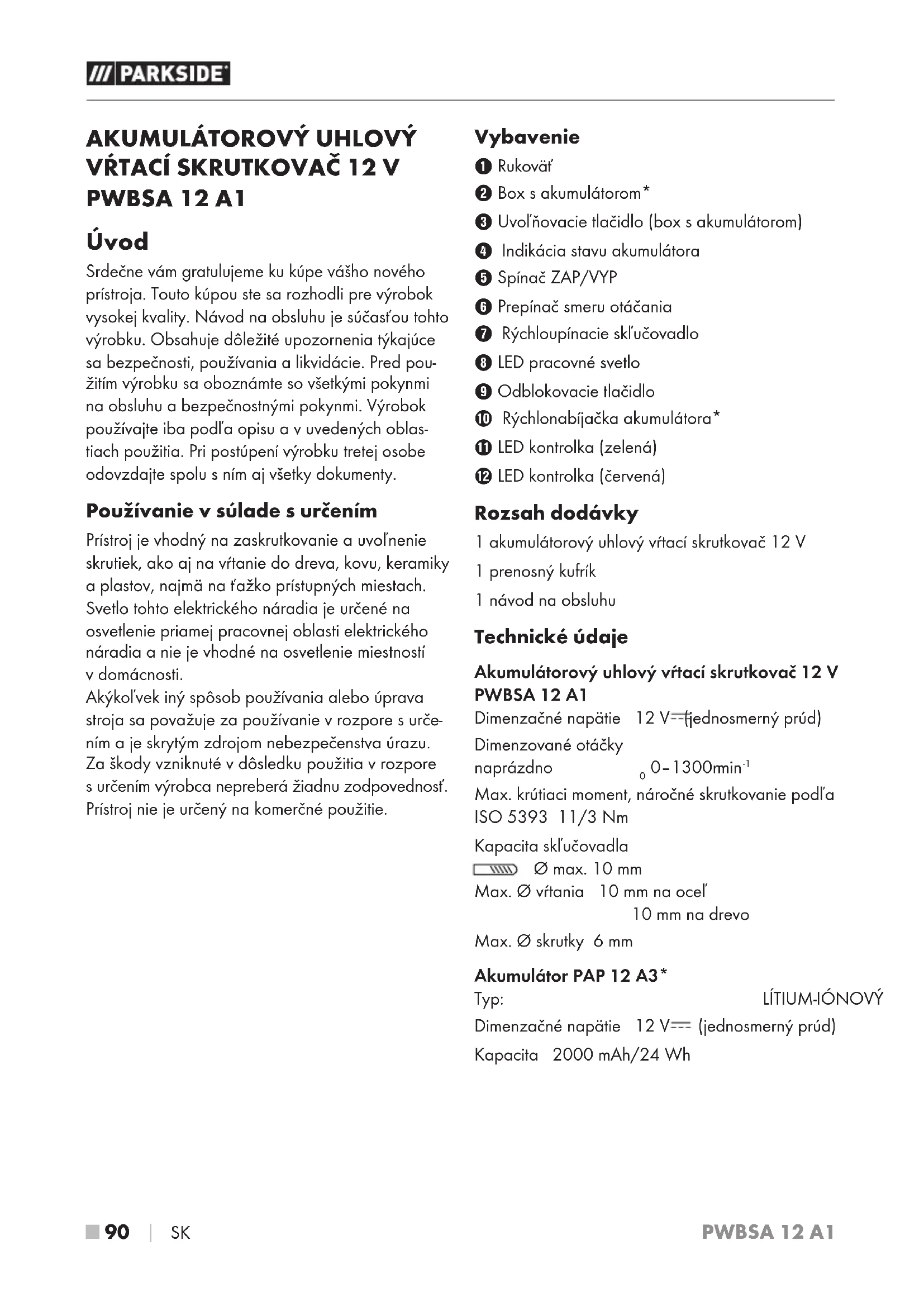 PWBSA 12 A1 Úvod Srdečne vám gratulujeme kukúpe vášho nového prístroja. Touto kúpou ste sa rozhodli pre výrobok vysokej kvality. Návod na obsluhu je súčasťou tohto výrobku. Obsahuje dôležité upozornenia týkajúce sa bezpečnosti, používania a likvidácie. Pred pou- žitím výrobku sa oboznámte sovšetkými pokynmi na obsluhu a bezpečnostnými pokynmi. Výrobok používajte iba podľa opisu a vuvedených oblas- tiach použitia. Pri postúpení výrobku tretej osobe odovzdajte spolu sním aj všetky dokumenty. Používanie vsúlade surčením Prístroj je vhodný na zaskrutkovanie a uvoľnenie skrutiek, ako aj na vŕtanie do dreva, kovu, keramiky a plastov, najmä na ťažko prístupných miestach. Svetlo tohto elektrického náradia je určené na osvetlenie priamej pracovnej oblasti elektrického náradia a nie je vhodné na osvetlenie miestností v domácnosti. Akýkoľvek iný spôsob používaniaalebo úprava strojasapovažuje zapoužívanie vrozpore surče- ním aje skrytým zdrojom nebezpečenstva úrazu. Za škody vzniknuté v dôsledku použitia v rozpore s určením výrobca nepreberá žiadnu zodpovednosť. Prístroj nie je určený na komerčné použitie. Vybavenie 1 Rukoväť 2 Box s akumulátorom* 3 Uvoľňovacie tlačidlo (box s akumulátorom) 4 Indikácia stavu akumulátora 5 Spínač ZAP/VYP 6 Prepínač smeru otáčania 7 Rýchloupínacie skľučovadlo 8 LED pracovné svetlo 9 Odblokovacie tlačidlo 0 Rýchlonabíjačka akumulátora* q LED kontrolka (zelená) w LED kontrolka (červená) Rozsah dodávky 1 akumulátorový uhlový vŕtací skrutkovač 12 V 1 prenosný kufrík 1 návod na obsluhu Technické údaje Akumulátorový uhlový vŕtací skrutkovač 12 V PWBSA 12 A1 Dimenzačné napätie 12 V (jednosmerný prúd) Dimenzované otáčky naprázdno n