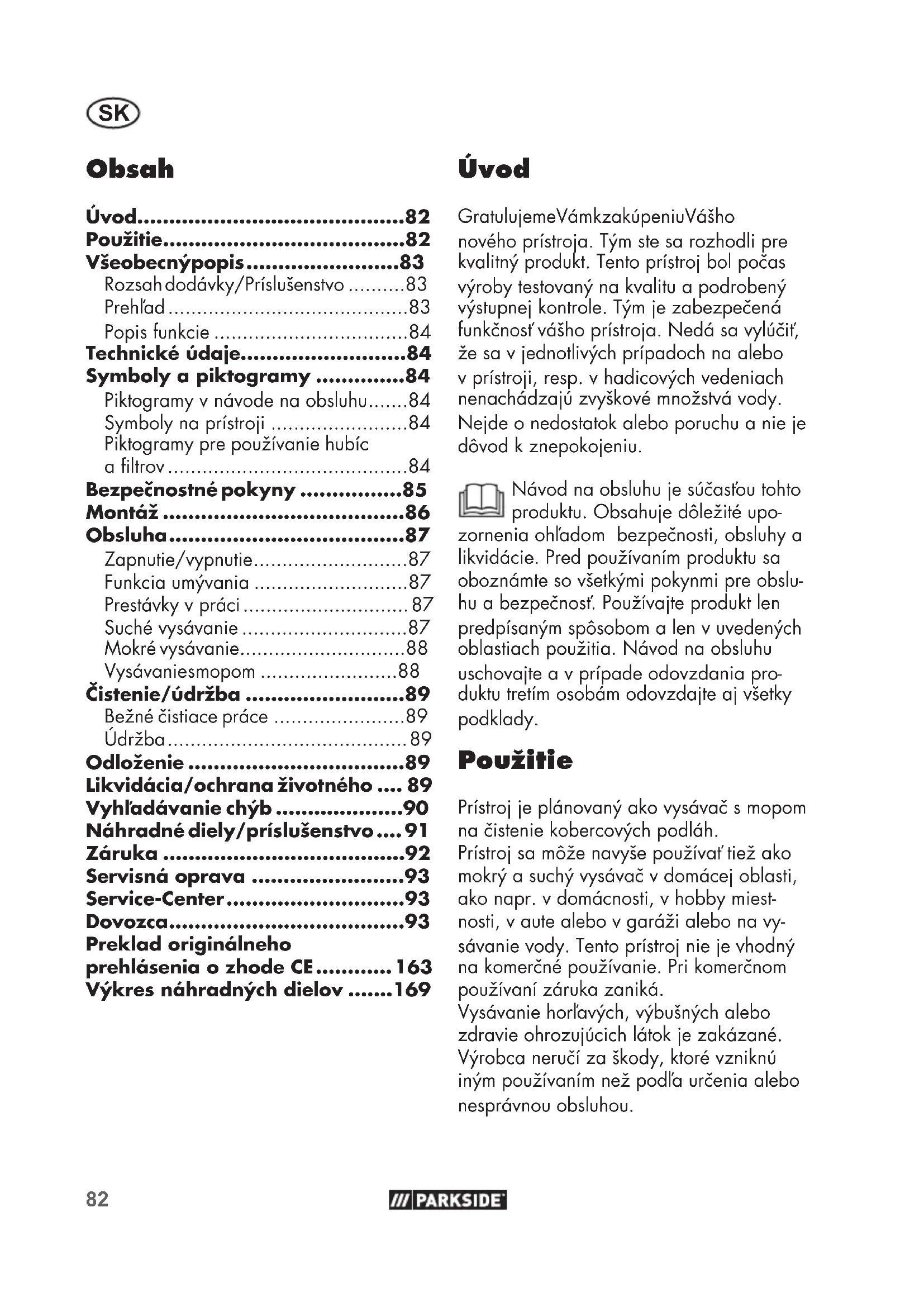 - Úvod Gratulujeme Vám k zakúpeniu Vášho nového prístroja. Tým ste sa rozhodli pre kvalitný produkt. Tento prístroj bol počas výroby testovaný na kvalitu a podrobený výstupnej kontrole. Tým je zabezpečená funkčnosť vášho prístroja. Nedá sa vylúčiť, že sa v jednotlivých prípadoch na alebo v prístroji, resp. v hadicových vedeniach nenachádzajú zvyškové množstvá vody. Nejde o nedostatok alebo poruchu a nie je dôvod k znepokojeniu. Návod na obsluhu je súčasťou tohto produktu. Obsahuje dôležité upo- zornenia ohľadom bezpečnosti, obsluhy a likvidácie. Pred používaním produktu sa oboznámte so všetkými pokynmi pre obslu- hu a bezpečnosť. Používajte produkt len predpísaným spôsobom a len v uvedených oblastiach použitia. Návod na obsluhu uschovajte a v prípade odovzdania pro- duktu tretím osobám odovzdajte aj všetky podklady. Použitie Prístroj je plánovaný ako vysávač s mopom na čistenie kobercových podláh. Prístroj sa môže navyše používať tiež ako mokrý a suchý vysávač v domácej oblasti, ako napr.v domácnosti, v hobby miest- nosti, v aute alebo v garáži alebo na vy- sávanie vody. Tento prístroj nie je vhodný na komerčné používanie. Pri komerčnom používaní záruka zaniká. Vysávanie horľavých, výbušných alebo zdravie ohrozujúcich látok je zakázané. Výrobca neručí za škody, ktoré vzniknú iným používaním než podľa určenia alebo nesprávnou obsluhou. Preklad originálneho prehlásenia o zhode CE p. 163