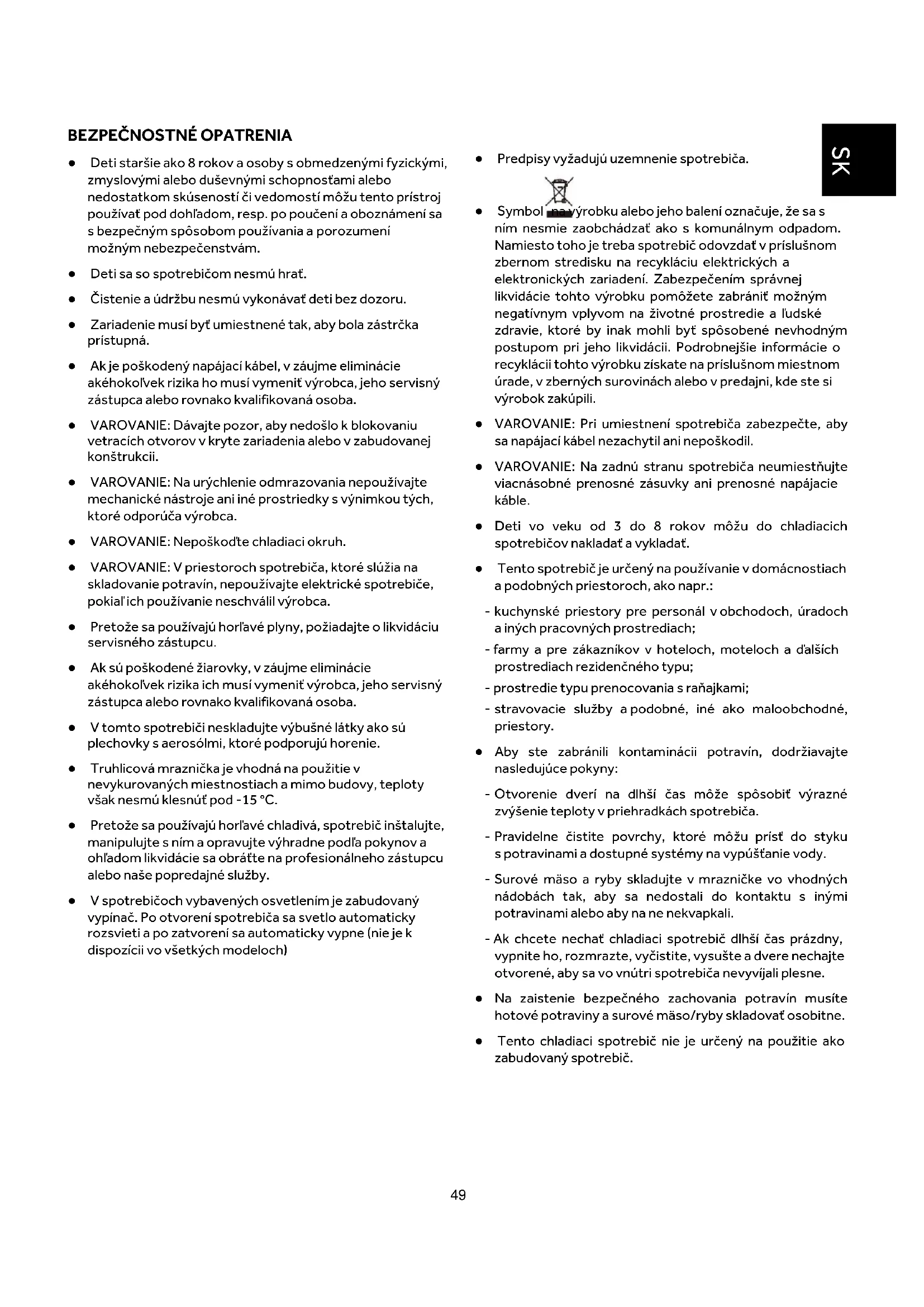 ● Deti staršie ako 8 rokov a osoby s obmedzenými fyzickými, zmyslovými alebo duševnými schopnosťami alebo nedostatkom skúseností či vedomostí môžu tento prístroj používať pod dohľadom, resp. po poučení a oboznámení sa s bezpečným spôsobom používania a porozumení možným nebezpečenstvám. ● Deti sa so spotrebičom nesmú hrať. ● Čistenie a údržbu nesmú vykonávať deti bez dozoru. ● Zariadenie musí byť umiestnené tak, aby bola zástrčka prístupná. ● Ak je poškodený napájací kábel, v záujme eliminácie akéhokoľvek rizika ho musí vymeniť výrobca, jeho servisný zástupca alebo rovnako kvalifikovaná osoba. ● VAROVANIE: Dávajte pozor, aby nedošlo k blokovaniu vetracích otvorov v kryte zariadenia alebo v zabudovanej konštrukcii. ● VAROVANIE: Na urýchlenie odmrazovania nepoužívajte mechanické nástroje ani iné prostriedky s výnimkou tých, ktoré odporúča výrobca. ● VAROVANIE: Nepoškoďte chladiaci okruh. ● VAROVANIE: V priestoroch spotrebiča, ktoré slúžia na skladovanie potravín, nepoužívajte elektrické spotrebiče, pokiaľ ich používanie neschválil výrobca. ● Pretože sa používajú horľavé plyny, požiadajte o likvidáciu servisného zástupcu. ● Ak sú poškodené žiarovky, v záujme eliminácie akéhokoľvek rizika ich musí vymeniť výrobca, jeho servisný zástupca alebo rovnako kvalifikovaná osoba. ● V tomto spotrebiči neskladujte výbušné látky ako sú plechovky s aerosólmi, ktoré podporujú horenie. ● Truhlicová mraznička je vhodná na použitie v nevykurovaných miestnostiach a mimo budovy, teploty však nesmú klesnúť pod -15 °C. ● Pretože sa používajú horľavé chladivá, spotrebič inštalujte, manipulujte s ním a opravujte výhradne podľa pokynov a ohľadom likvidácie sa obráťte na profesionálneho zástupcu alebo naše popredajné služby. ● V spotrebičoch vybavených osvetlením je zabudovaný vypínač. Po otvorení spotrebiča sa svetlo automaticky rozsvieti a po zatvorení sa automaticky vypne (nie je k dispozícii vo všetkých modeloch) ● Predpisy vyžadujú uzemnenie spotrebiča. ● Symbol na výrobku alebo jeho balení označuje, že sa s ním nesmie zaobchádzať ako s komunálnym odpadom. Namiesto toho je treba spotrebič odovzdať v príslušnom zbernom stredisku na recykláciu elektrických a elektronických zariadení. Zabezpečením správnej likvidácie tohto výrobku pomôžete zabrániť možným negatívnym vplyvom na životné prostredie a ľudské zdravie, ktoré by inak mohli byť spôsobené nevhodným postupom pri jeho likvidácii. Podrobnejšie informácie o recyklácii tohto výrobku získate na príslušnom miestnom úrade, v zberných surovinách alebo v predajni, kde ste si výrobok zakúpili. ● VAROVANIE: Pri umiestnení spotrebiča zabezpečte, aby sa napájací kábel nezachytil ani nepoškodil. ● VAROVANIE: Na zadnú stranu spotrebiča neumiestňujte viacnásobné prenosné zásuvky ani prenosné napájacie káble. ● Deti vo veku od 3 do 8 rokov môžu do chladiacich spotrebičov nakladať a vykladať. ● Tento spotrebič je určený na používanie v domácnostiach a podobných priestoroch, ako napr.: - kuchynské priestory pre personál v obchodoch, úradoch a iných pracovných prostrediach; - farmy a pre zákazníkov v hoteloch, moteloch a ďalších prostrediach rezidenčného typu; - prostredie typu prenocovania s raňajkami; - stravovacie služby a podobné, iné ako maloobchodné, priestory. ● Aby ste zabránili kontaminácii potravín, dodržiavajte nasledujúce pokyny: - Otvorenie dverí na dlhší čas môže spôsobiť výrazné zvýšenie teploty v priehradkách spotrebiča. - Pravidelne čistite povrchy, ktoré môžu prísť do styku s potravinami a dostupné systémy na vypúšťanie vody. - Surové mäso a ryby skladujte v mrazničke vo vhodných nádobách tak, aby sa nedostali do kontaktu s inými potravinami alebo aby na ne nekvapkali. - Ak chcete nechať chladiaci spotrebič dlhší čas prázdny, vypnite ho, rozmrazte, vyčistite, vysušte a dvere nechajte otvorené, aby sa vo vnútri spotrebiča nevyvíjali plesne. ● Na zaistenie bezpečného zachovania potravín musíte hotové potraviny a surové mäso/ryby skladovať osobitne. ● Tento chladiaci spotrebič nie je určený na použitie ako zabudovaný spotrebič. SK50 DIAGRAMY OBR1. A Veko B Tesnenie C Vnútorné svetlo (ak je k dispozícii) D Skriňa E Úložný priestor F Vetracia mriežka G Ovládací panel H Kôš I Komora kompresora J Kompresor K Ventilátor (ak je k dispozícii) L Zadný kondenzátor (ak je k dispozícii) M Odtoková zátka rozmrazenej vody