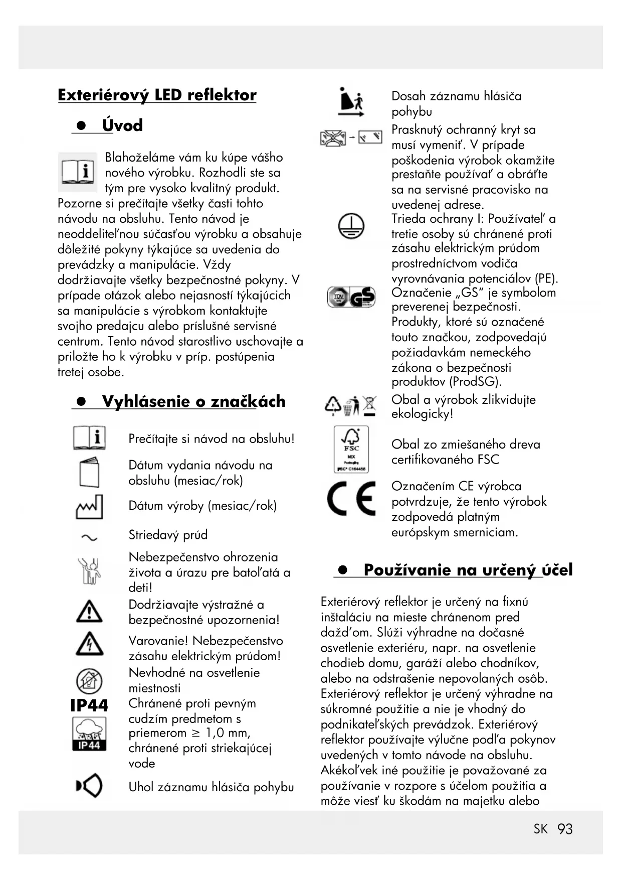 Exteriérový LED reektor z Úvod Blahoželáme vám ku kúpe vášho nového výrobku. Rozhodli ste sa tým pre vysoko kvalitný produkt. Pozorne si prečítajte všetky časti tohto návodu na obsluhu. Tento návod je neoddeliteľnou súčasťou výrobku a obsahuje dôležité pokyny týkajúce sa uvedenia do prevádzky a manipulácie. Vždy dodržiavajte všetky bezpečnostné pokyny. V prípade otázok alebo nejasností týkajúcich sa manipulácie s výrobkom kontaktujte svojho predajcu alebo príslušné servisné centrum. Tento návod starostlivo uschovajte a priložte ho k výrobku v príp. postúpenia tretej osobe. z Vyhlásenie o značkách Prečítajte si návod na obsluhu! Dátum vydania návodu na obsluhu (mesiac/rok) Dátum výroby (mesiac/rok) Striedavý prúd Nebezpečenstvo ohrozenia života a úrazu pre batoľatá a deti! Dodržiavajte výstražné a bezpečnostné upozornenia! Varovanie! Nebezpečenstvo zásahu elektrickým prúdom! Nevhodné na osvetlenie miestnosti IP44 Chránené proti pevným cudzím predmetom s priemerom ≥ 1,0 mm, chránené proti striekajúcej vode Uhol záznamu hlásiča pohybu Dosah záznamu hlásiča pohybu Prasknutý ochranný kryt sa musí vymeniť. V prípade poškodenia výrobok okamžite prestaňte používať a obráťte sa na servisné pracovisko na uvedenej adrese. Trieda ochrany I: Používateľ a tretie osoby sú chránené proti zásahu elektrickým prúdom prostredníctvom vodiča vyrovnávania potenciálov (PE). Označenie „GS“ je symbolom preverenej bezpečnosti. Produkty, ktoré sú označené touto značkou, zodpovedajú požiadavkám nemeckého zákona o bezpečnosti produktov (ProdSG). Obal a výrobok zlikvidujte ekologicky! Obal zo zmiešaného dreva certikovaného FSC Označením CE výrobca potvrdzuje, že tento výrobok zodpovedá platným európskym smerniciam. z Používanie na určený účel Exteriérový reektor je určený na xnú inštaláciu na mieste chránenom pred dažďom. Slúži výhradne na dočasné osvetlenie exteriéru, napr. na osvetlenie chodieb domu, garáží alebo chodníkov, alebo na odstrašenie nepovolaných osôb. Exteriérový reektor je určený výhradne na súkromné použitie a nie je vhodný do podnikateľských prevádzok. Exteriérový reektor používajte výlučne podľa pokynov uvedených v tomto návode na obsluhu. Akékoľvek iné použitie je považované za používanie v rozpore s účelom použitia a môže viesť ku škodám na majetku alebo94