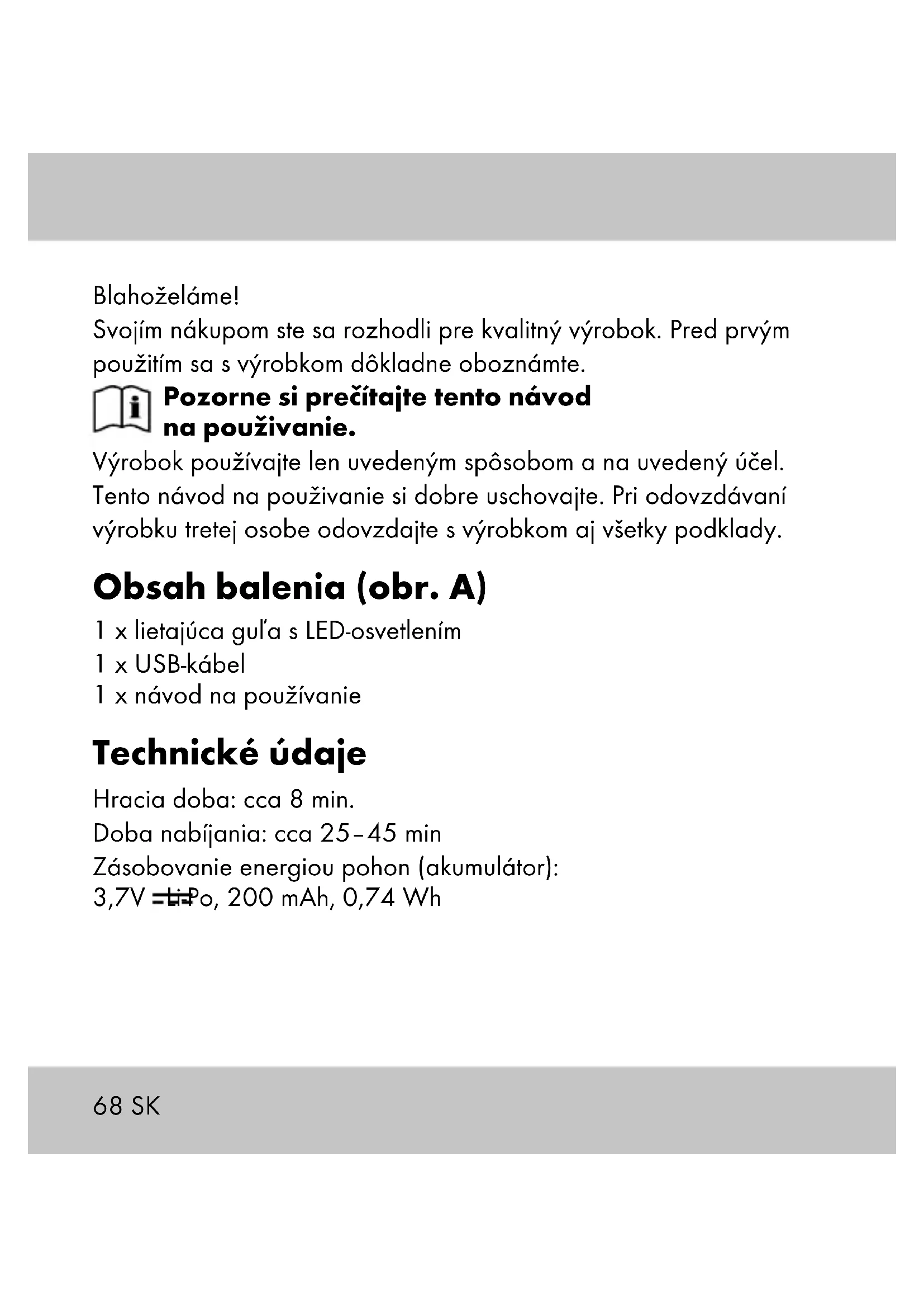 svetelná lišta s LED (1c) zhasne po krátkom preblesknutí. Výrobok sa nachádza v režime standby. Upozornenie: Keď sa listy rotora prestanú točiť, môžete stlačiť tlačidlo (1b). Výrobok nehádžte na podlahu. Skladovanie, čistenie Pri nepoužívaní skladujte výrobok vždy suchý a čistý pri izbovej teplote. Čistite len vlhkou čistiacou handričkou a nakoniec utrite dosucha. DÔLEŽITÉ! Výrobok nikdy nečistite ostrými čistiacimi prostriedkami.74 SK Pokyny k likvidácii Vedľa uvedený symbol znázorňuje, že tento prístroj podlieha smernici 2012/19/EÚ. Táto smernica oznamuje, že tento výrobok nesmiete na konci jeho doby používania likvidovať spolu s bežným domácim odpadom, ale ho musíte odovzdať v špeciálne zriadených zberných dvoroch, recyklačných centrách alebo likvidačných prevádzkach. Chráňte životné prostredie a likvidujte odborne. Batérie/akumulátory sa nesmú likvidovať spolu s domovým odpadom. Môžu obsahovať toxické ťažké kovy a podliehajú spracovaniu špeciálneho odpadu. Chemické symboly ťažkých kovov sú nasledovné: Cd = kadmium, Hg = ortuť, Pb = olovo. Použité batérie/ akumulátory preto odovzdajte v komunálnom zbernom mieste. Ďalšie informácie o možnostiach likvidácie zastaraného prístroja dostanete na svojej obecnej alebo mestskej správe. Prístroj a obal zlikvidujte ekologicky. Obalový materiál (ako napr. fóliové vrecká) uschovajte mimo dosahu detí. Pri triedení odpadu dodržiavajte označenie obalových materiálov, ktoré sú označené skratkami (a) a číslami (b) s nasledujúcim významom: 1 – 7: plasty / 20 – 22: papier a lepenka / 80 – 98: kompozitné látky.75SK Výrobok a obalové materiály sú recyklovateľné, likvidujte tieto oddelene pre lepšie spracovanie odpadu. Logo Triman je len pre Francúzsko. Pokyny k záruke a priebehu servisu Výrobok bol vyrobený veľmi starostlivo a pod stálou kontrolou. Na tento výrobok poskytuje DELTA-SPORT HANDELSKONTOR GmbH súkromným koncovým užívateľom trojročnú záruku odo dňa kúpy (záručná lehota) po splnení nasledovných podmienok. Záruka platí len na chyby materiálu a spracovania. Záruka sa netýka dielov, ktoré podliehajú bežnému opotrebeniu a preto ich možno považovať za opotrebiteľné diely (napr. batérie), ako aj krehkých dielov, napr. vypínače, akumulátory alebo diely, ktoré sú vyrobené zo skla. Nároky z tejto záruky zanikajú, keď sa výrobok používal neodborne alebo nesprávne, mimo určenia na používanie alebo určeného rozsahu používania alebo neboli dodržané pokyny návodu na obsluhu, s výnim- kou, že koncový užívateľ preukáže, že ide o chybu materiálu alebo spra- covania, ktorá nebola spôsobená niektorou z hore uvedených okolností. Záruku je možné uplatniť len počas záručnej lehoty po predložení originálu pokladničného dokladu. Originál pokladničného do- kladu preto prosím uschovajte. Záručná doba sa kvôli prípadným záručným opravám, zákonnej záruke alebo ako obchodné gesto nepredlžuje. Platí to aj pre vymenené a opravené diely.76 SK Pri reklamáciách sa prosím najskôr obráťte na dole uvedenú Ser- vice-Hotline alebo sa s nami spojte prostredníctvom e-mailu. Ak sa jedná o záručný prípad, výrobok – podľa našej voľby – bezplatne opravíme, vymeníme alebo vrátime kúpnu cenu. Ďalšie práva zo záruky nevyplývajú. Vaše zákonné práva, hlavne nároky na záručné plnenie voči prísluš- nému predajcovi, nie sú touto zárukou obmedzené. IAN: 419744_2201 Servis Slovensko Tel.: 0850 232001 E-Mail: deltasport@lidl.sk77ES ¡Enhorabuena! Con su compra se ha decidido por un artículo de gran calidad. Familiarícese con el artículo antes de usarlo por primera vez. Para ello, lea detenidamente las siguientes instrucciones de uso. Use el artículo solo de la forma descrita y para los campos de aplicación indicados. Conserve estas instrucciones de uso a buen recaudo. Entregue todos los documentos en caso de traspasar el artículo a terceros. Contenido de suministro (fig. A) 1 x bola voladora con iluminación LED 1 x cable USB 1 x instrucciones de uso Datos técnicos Tiempo de juego: aprox. 8 min. Periodo de carga: aprox. 25–45 min. Alimentación de energía del accionamiento (batería): 3,7V Li-Po, 200 mAh, 0,74 Wh78 ES Cable USB (tipo C): Entrada: 5V