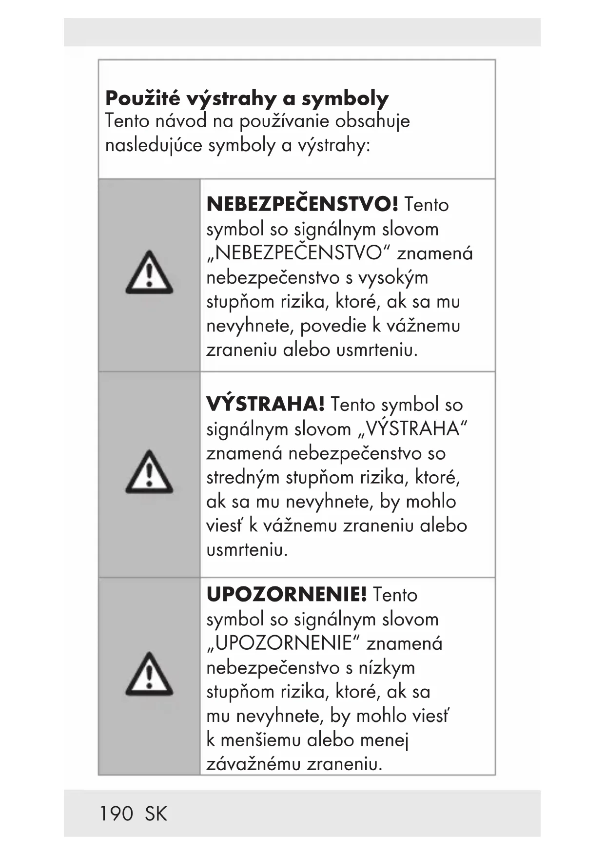 Prehltnutie môže viesť k poleptaniu, perforácii mäkkého tkaniva a usmrteniu. Závažné poleptanie sa môže objaviť v priebehu 2 hodín od požitia. NEBEZPEČENSTVO VÝBUCHU! Nikdy nenabíjajte nenabíjateľné batérie. Batérie/ nabíjateľné batérie neskratujte ani ich neotvárajte. Mohlo by dôjsť k prehriatiu, vzniku požiaru alebo výbuchu. Batérie/nabíjateľné batérie nikdy nehádžte do ohňa ani do vody. Batérie/nabíjateľné batérie nikdy mechanicky nezaťažujte. Riziko úniku elektrolytu z batérií/ nabíjateľných batérií Vyhýbajte sa extrémnym podmienkam a teplotám okolitého prostredia, ktoré by mohli mať vplyv na batérie/nabíjateľné batérie, napr. radiátory/priame slnečné svetlo. Ak došlo k úniku elektrolytu z batérií/ nabíjateľných batérií, vyhýbajte sa kontaktu tejto chemikálie s pokožkou, očami a sliznicami! Postihnuté miesta ihneď opláchnite pitnou vodou a vyhľadajte lekársku pomoc!200 SK