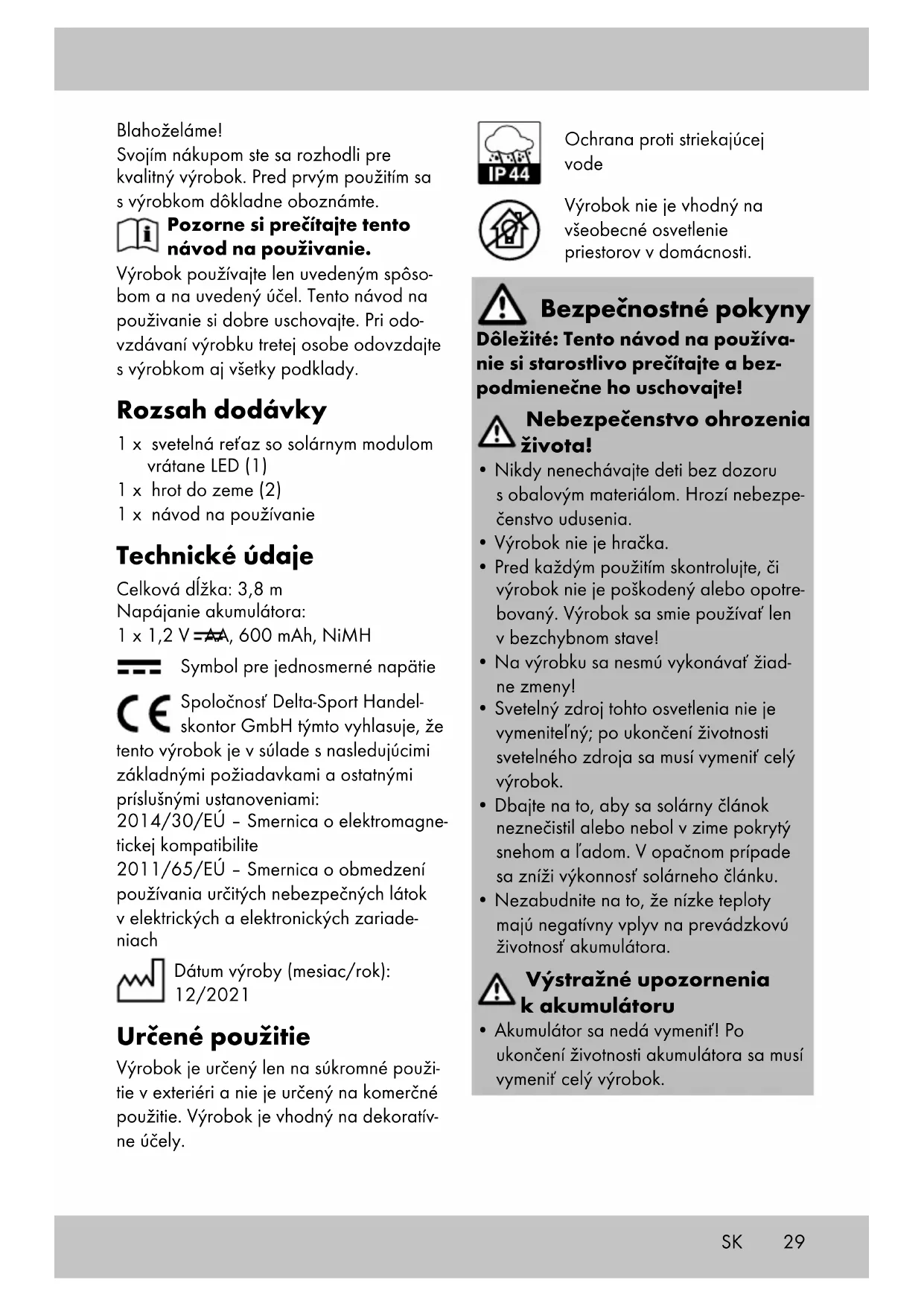 - Spínač na zapínanie/vypínanie uveďte do polohy OFF. Výrobok je natrvalo vypnutý. Skladovanie, čistenie Pri nepoužívaní skladujte výrobok vždy vypnutý, suchý a čistý pri izbovej teplote. Zvonka čistite len vlhkou čistiacou handrič- kou a nakoniec utrite dosucha. DÔLEŽITÉ! Výrobok nikdy nečistite ostrými čistiacimi prostriedkami.31 Pokyny k likvidácii V záujme ochrany životného prostredia nevyhadzujte svoj výrobok do domáceho odpadu, ak doslúžil, ale odneste ho na špecializo- vanú likvidáciu. O zberných miestach a ich otváracích hodinách sa môžete informovať na vašej príslušnej miestnej správe. Chybné alebo použité batérie/akumuláto- ry sa musia recyklovať v súlade so smerni- cou 2006/66/ES a jej zmenami. Vráťte batérie/akumulátory a / alebo výrobok prostredníctvom ponúkaných zberných zariadení. Obalové materiály, ako napr. plastové vrecká, nepatria do rúk deťom. Uchovávajte obalový materiál mimo dosahu detí. Škody na životnom prostredí nesprávnou likvidáciou batérií/ akumulátorov! Batérie/akumuláto- ry sa nesmú likvidovať spolu s domovým odpadom. Môžu obsahovať toxické ťažké kovy a podliehajú spracovaniu špeciálne- ho odpadu. Chemické symboly ťažkých kovov sú nasledovné: Cd = kadmium, Hg = ortuť, Pb = olovo. Použité batérie/ akumulátory preto odovzdajte v komunál- nom zbernom mieste. Výrobok a obal zlikvidujte ekologickým spôsobom. Pri triedení odpadu dodržiavajte označenie obalových materiálov, ktoré sú označené skratkami (a) a číslami (b) s nasledujúcim významom: 1 – 7: plasty/20 – 22: papier a lepenka/ 80 – 98: kompozitné látky. Výrobok a obalové materiály sú recyk- lovateľné, likvidujte tieto oddelene pre lepšie spracovanie odpadu. Logo Triman je len pre Francúzsko. Možnosti likvidácie doslúženého výrobku sa dozviete na vašej správe obci alebo mesta. Pokyny k záruke a priebehu servisu Výrobok bol vyrobený veľmi starostlivo a pod stálou kontrolou. Na tento výrobok poskytuje DELTA-SPORT HANDELSKON- TOR GmbH súkromným koncovým užívateľom trojročnú záruku odo dňa kúpy (záručná lehota) po splnení nasledovných podmienok. Záruka platí len na chyby materiálu a spracovania. Záruka sa netýka dielov, ktoré podliehajú bežnému opotre- beniu a preto ich možno považovať za opotrebiteľné diely (napr. batérie), ako aj krehkých dielov, napr. vypínače, akumu- látory alebo diely, ktoré sú vyrobené zo skla. Nároky z tejto záruky zanikajú, keď sa výrobok používal neodborne alebo nesprávne, mimo určenia na používanie alebo určeného rozsahu používania alebo neboli dodržané pokyny návodu na obsluhu, s výnimkou, že koncový užívateľ preukáže, že ide o chybu materiálu alebo spracovania, ktorá nebola spôsobená niektorou z hore uvedených okolností. Záruku je možné uplatniť len počas záručnej lehoty po predložení originálu pokladničného dokladu. Originál poklad- ničného dokladu preto prosím uschovajte. Záručná doba sa kvôli prípadným záruč- ným opravám, zákonnej záruke alebo ako obchodné gesto nepredlžuje. Platí to aj pre vymenené a opravené diely. Pri reklamáciách sa prosím najskôr obráťte na dole uvedenú Service-Hotline alebo sa s nami spojte prostredníctvom e-mailu. Ak sa jedná o záručný prípad, výrobok – podľa našej voľby – bezplatne opravíme, vymeníme alebo vrátime kúpnu cenu. Ďalšie práva zo záruky nevyplývajú. Vaše zákonné práva, hlavne nároky na záručné plnenie voči príslušnému predajcovi, nie sú touto zárukou obmedzené. SK32 SK IAN: 398838_2107 Servis Slovensko Tel.: 0850 232001 E-Mail: deltasport@lidl.sk33 ¡Enhorabuena! Con su compra se ha decidido por un artí- culo de gran calidad. Familiarícese con el artículo antes de usarlo por primera vez. Para ello, lea detenidamente las siguientes instrucciones de uso. Use el artículo solo de la forma descrita y para los campos de aplicación indicados. Conserve estas instrucciones de uso a buen recaudo. Entregue todos los docu- mentos en caso de traspasar el artículo a terceros. Alcance de suministro 1 cadena de luces con módulo solar, incl. LED (1) 1 estaca (2) 1 instrucciones de uso Datos técnicos Longitud total: 3,8 m Alimentación de energía por batería: 1 batería de 1,2 V AA, 600 mAh, NiMH Símbolo de tensión continua Por la presente, Delta-Sport Handelskontor GmbH declara que este artículo cumple con los siguientes requisitos básicos y las disposiciones pertinentes: 2014/30/UE – Directiva CEM 2011/65/UE – Directiva RoHS Fecha de fabricación (mes/año): 12/2021 Uso previsto El artículo es solo para uso privado en exteriores y no está destinado a uso comercial. El artículo es apto para fines decorativos. Protección contra salpicaduras de agua No es adecuado para iluminar estancias en el hogar. Indicaciones de seguridad Importante: Lea detenidamente estas instrucciones de uso y consér- velas. ¡Peligro de muerte!