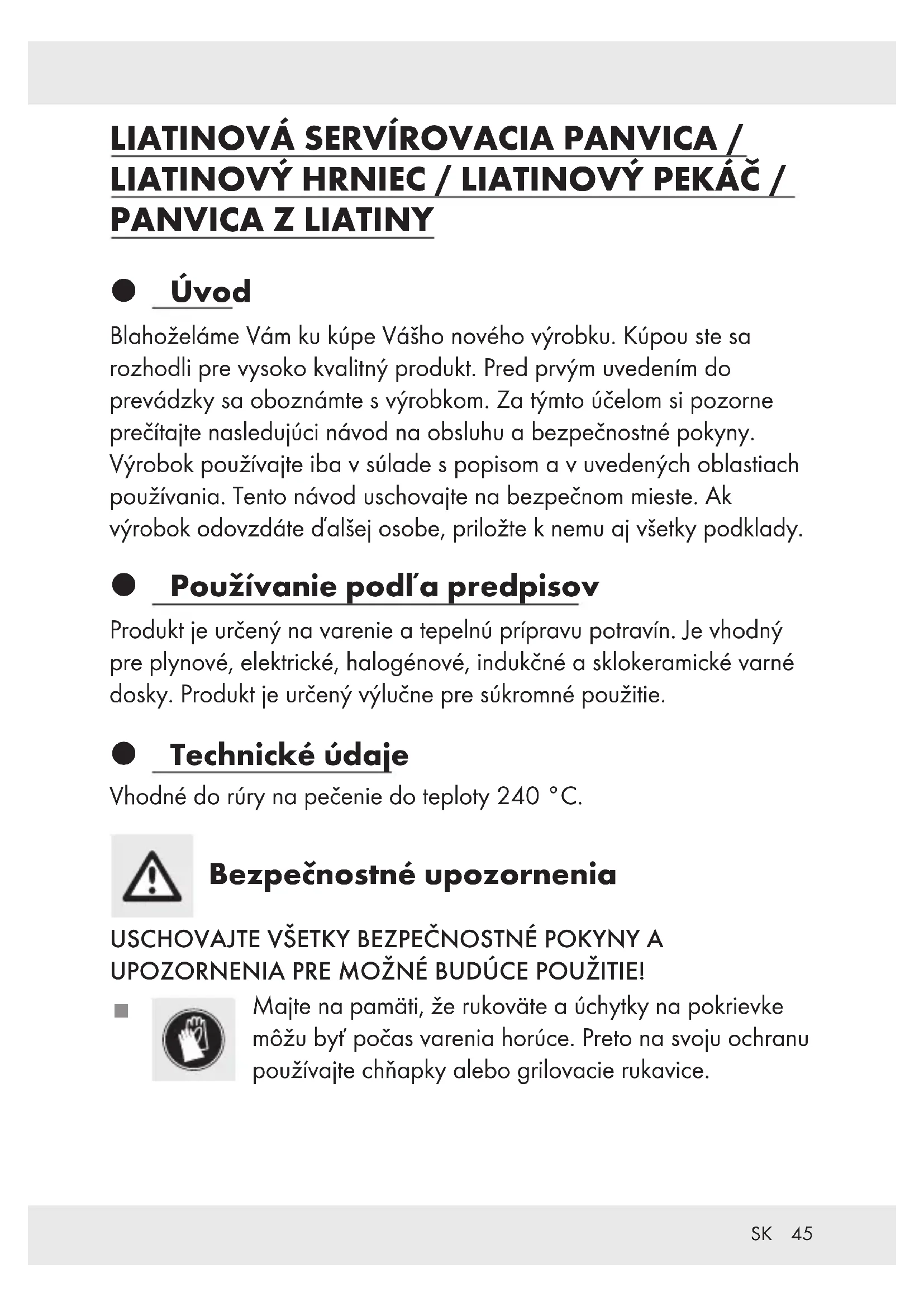 Úvod Blahoželáme Vám ku kúpe Vášho nového výrobku. Kúpou ste sa rozhodli pre vysoko kvalitný produkt. Pred prvým uvedením do prevádzky sa oboznámte s výrobkom. Za týmto účelom si pozorne prečítajte nasledujúci návod na obsluhu a bezpečnostné pokyny. Výrobok používajte iba v súlade s popisom a v uvedených oblastiach používania. Tento návod uschovajte na bezpečnom mieste. Ak výrobok odovzdáte ďalšej osobe, priložte k nemu aj všetky podklady. Používanie podľa predpisov Produkt je určený na varenie a tepelnú prípravu potravín. Je vhodný pre plynové, elektrické, halogénové, indukčné a sklokeramické varné dosky. Produkt je určený výlučne pre súkromné použitie. Technické údaje Vhodné do rúry na pečenie do teploty 240 °C. Bezpečnostné upozornenia USCHOVAJTE VŠETKY BEZPEČNOSTNÉ POKYNY A UPOZORNENIA PRE MOŽNÉ BUDÚCE POUŽITIE!