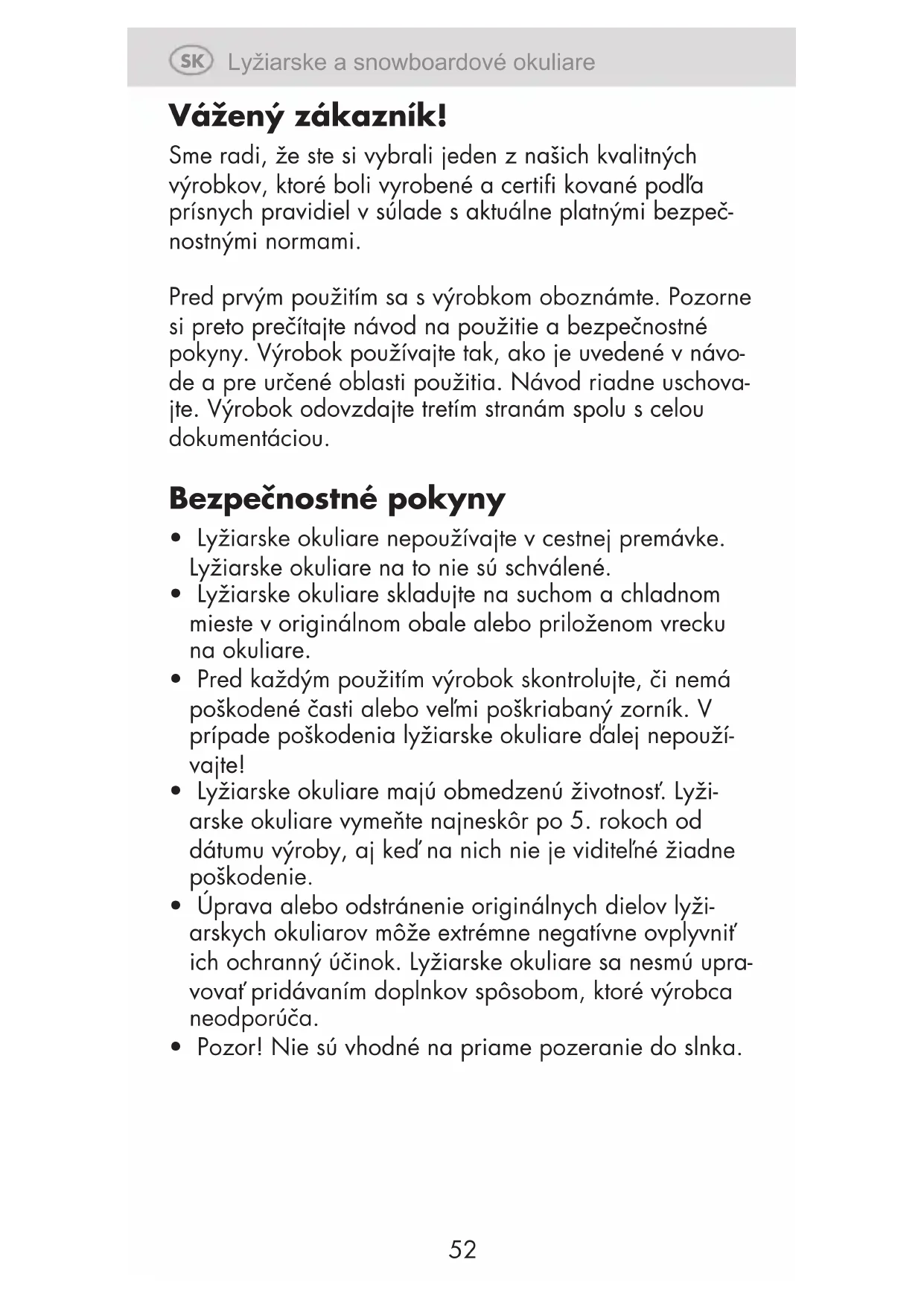- Lyžiarske okuliare nepoužívajte v cestnej premávke. Lyžiarske okuliare na to nie sú schválené.