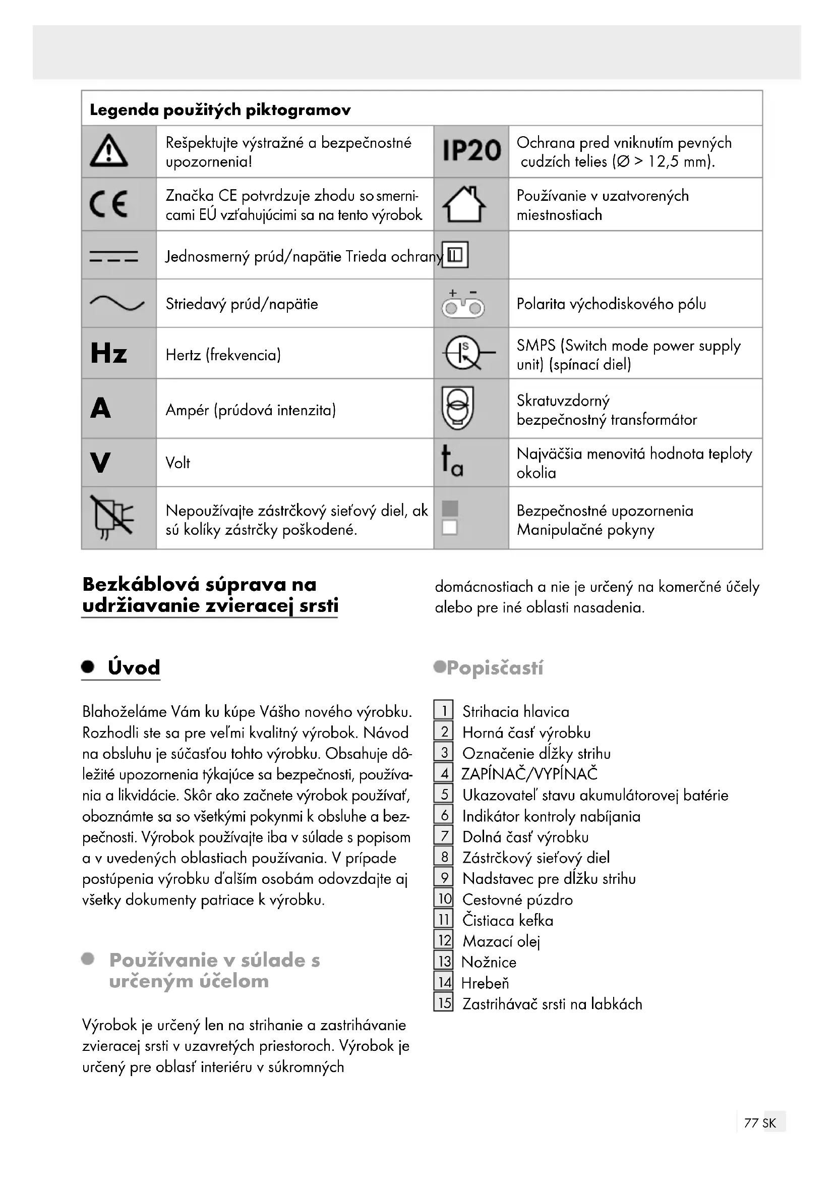 Volt Najväčšia menovitá hodnota teploty okolia Nepoužívajte zástrčkový sieťový diel, ak sú kolíky zástrčky poškodené. Bezpečnostné upozornenia Manipulačné pokyny Bezkáblová súprava na udržiavanie zvieracej srsti Úvod Blahoželáme Vám ku kúpe Vášho nového výrobku. Rozhodli ste sa pre veľmi kvalitný výrobok. Návod na obsluhu je súčasťou tohto výrobku. Obsahuje dô- ležité upozornenia týkajúce sa bezpečnosti, používa- nia a likvidácie. Skôr ako začnete výrobok používať, oboznámte sa so všetkými pokynmi k obsluhe a bez- pečnosti. Výrobok používajte iba v súlade s popisom a v uvedených oblastiach používania. V prípade postúpenia výrobku ďalším osobám odovzdajte aj všetky dokumenty patriace k výrobku. Používanie v súlade s určeným účelom Výrobok je určený len na strihanie a zastrihávanie zvieracej srsti v uzavretých priestoroch. Výrobok je určený pre oblasť interiéru v súkromných domácnostiach a nie je určený na komerčné účely alebo pre iné oblasti nasadenia. Popis častí