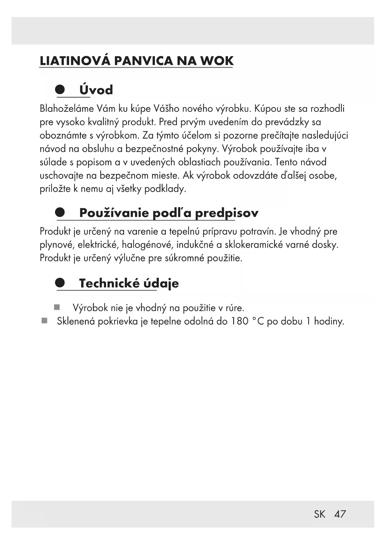 Úvod Blahoželáme Vám ku kúpe Vášho nového výrobku. Kúpou ste sa rozhodli pre vysoko kvalitný produkt. Pred prvým uvedením do prevádzky sa oboznámte s výrobkom. Za týmto účelom si pozorne prečítajte nasledujúci návod na obsluhu a bezpečnostné pokyny. Výrobok používajte iba v súlade s popisom a v uvedených oblastiach používania. Tento návod uschovajte na bezpečnom mieste. Ak výrobok odovzdáte ďalšej osobe, priložte k nemu aj všetky podklady. Používanie podľa predpisov Produkt je určený na varenie a tepelnú prípravu potravín. Je vhodný pre plynové, elektrické, halogénové, indukčné a sklokeramické varné dosky. Produkt je určený výlučne pre súkromné použitie. Technické údaje Výrobok nie je vhodný na použitie v rúre. Sklenená pokrievka je tepelne odolná do 180 °C po dobu 1 hodiny.48 SK Bezpečnostné upozornenia USCHOVAJTE VŠETKY BEZPEČNOSTNÉ POKYNY A UPOZORNENIA PRE MOŽNÉ BUDÚCE POUŽITIE!