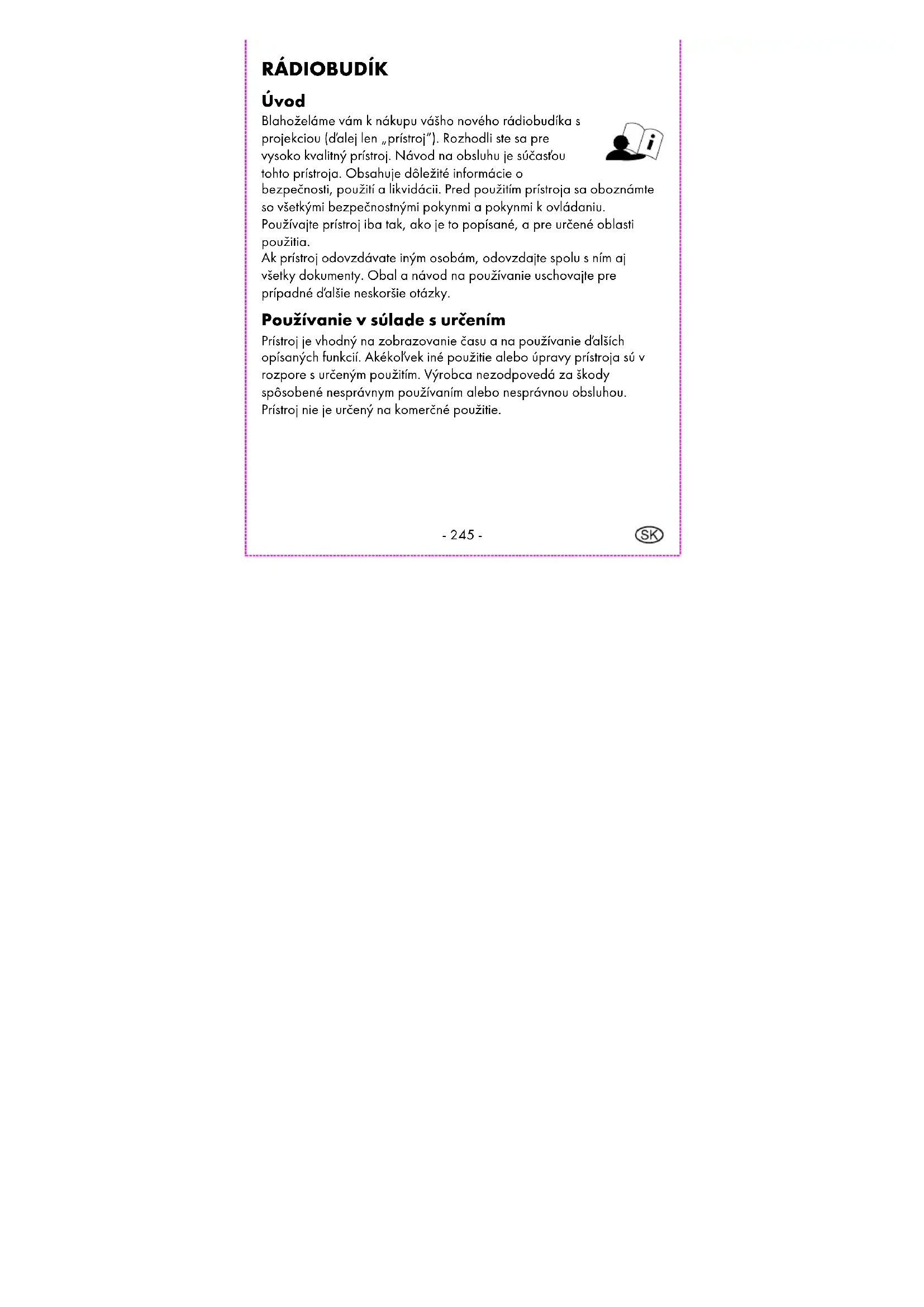 Úvod Blahoželáme vám k nákupu vášho nového rádiobudíka s projekciou (ďalej len „prístroj“). Rozhodli ste sa pre vysoko kvalitný prístroj. Návod na obsluhu je súčasťou tohto prístroja. Obsahuje dôležité informácie o bezpečnosti, použití a likvidácii. Pred použitím prístroja sa oboznámte so všetkými bezpečnostnými pokynmi a pokynmi k ovládaniu. Používajte prístroj iba tak, ako je to popísané, a pre určené oblasti použitia. Ak prístroj odovzdávate iným osobám, odovzdajte spolu s ním aj všetky dokumenty. Obal a návod na používanie uschovajte pre prípadné ďalšie neskoršie otázky. Používanie v súlade s určením Prístroj je vhodný na zobrazovanie času a na používanie ďalších opísaných funkcií. Akékoľvek iné použitie alebo úpravy prístroja sú v rozpore s určeným použitím. Výrobca nezodpovedá za škody spôsobené nesprávnym používaním alebo nesprávnou obsluhou. Prístroj nie je určený na komerčné použitie.- 246 - Obsah dodávky Upozornenie: Po zakúpení skontrolujte obsah dodávky. Uistite sa, že sú dodané všetky diely a že nie sú poškodené. Ak dodávka nie je kompletná a/alebo sú niektoré diely poškodené, prístroj nepoužívajte. Obráťte sa na servisné oddelenie (pozri „Postup v prípade záruky“).