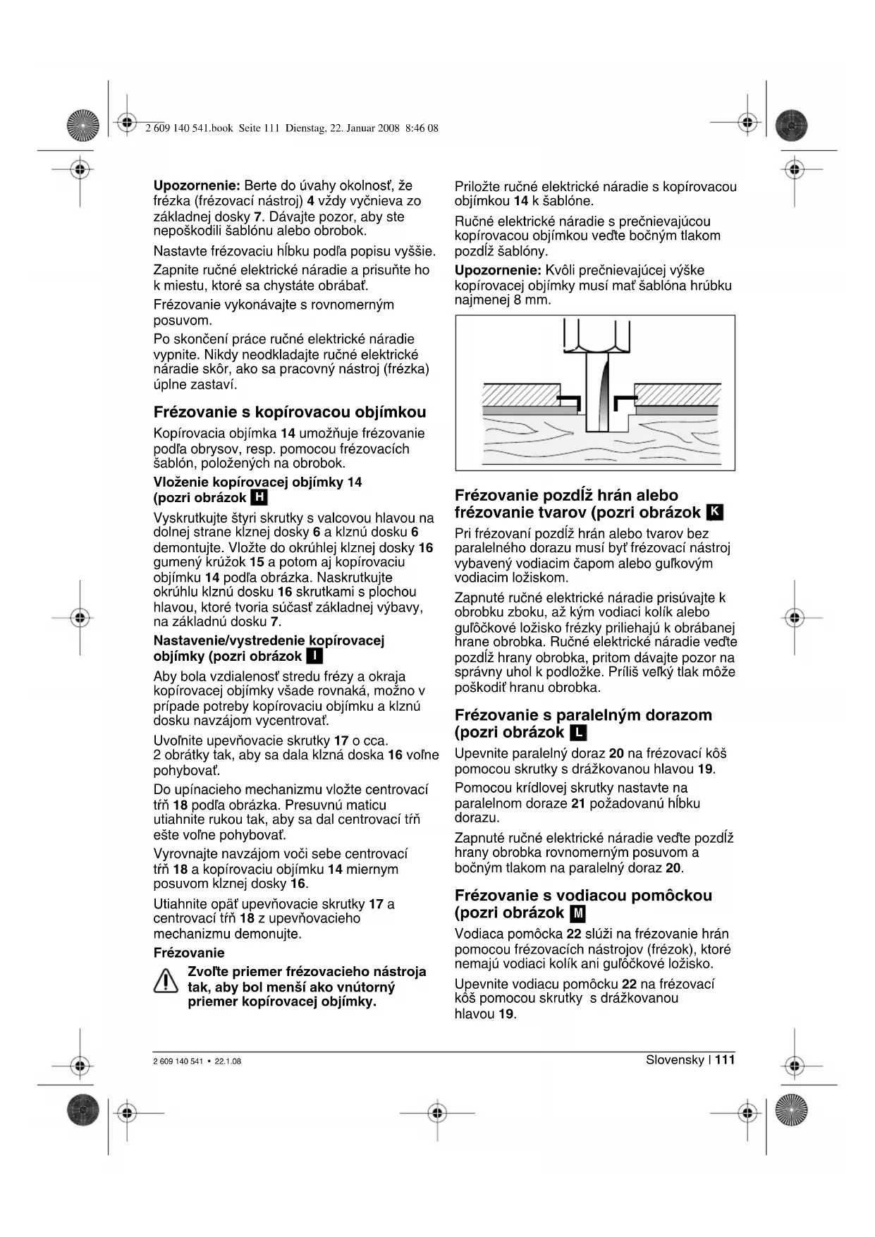 2 609 140 541.book Seite 110 Dienstag, 22. Januar 2008 8:46 08Slovensky | 111 2 609 140 541 • 22.1.08 Upozornenie: Berte do úvahy okolnosÈ, Ïe frézka (frézovací nástroj) 4 vÏdy vyãnieva zo základnej dosky 7. Dávajte pozor, aby ste nepo‰kodili ‰ablónu alebo obrobok. Nastavte frézovaciu hæbku podºa popisu vy‰‰ie. Zapnite ruãné elektrické náradie a prisuÀte ho k miestu, ktoré sa chystáte obrábaÈ. Frézovanie vykonávajte s rovnomern˘m posuvom. Po skonãení práce ruãné elektrické náradie vypnite. Nikdy neodkladajte ruãné elektrické náradie skôr, ako sa pracovn˘ nástroj (frézka) úplne zastaví. Frézovanie s kopírovacou objímkou Kopírovacia objímka 14 umoÏÀuje frézovanie podºa obrysov, resp. pomocou frézovacích ‰ablón, poloÏen˘ch na obrobok. VloÏenie kopírovacej objímky 14 (pozri obrázok ) Vyskrutkujte ‰tyri skrutky s valcovou hlavou na dolnej strane klznej dosky 6 a klznú dosku 6 demontujte. VloÏte do okrúhlej klznej dosky 16 gumen˘ krúÏok 15 a potom aj kopírovaciu objímku 14 podºa obrázka. Naskrutkujte okrúhlu klznú dosku 16 skrutkami s plochou hlavou, ktoré tvoria súãasÈ základnej v˘bavy, na základnú dosku 7. Nastavenie/vystredenie kopírovacej objímky (pozri obrázok ) Aby bola vzdialenosÈ stredu frézy a okraja kopírovacej objímky v‰ade rovnaká, moÏno v prípade potreby kopírovaciu objímku a klznú dosku navzájom vycentrovaÈ. Uvoºnite upevÀovacie skrutky 17 o cca. 2 obrátky tak, aby sa dala klzná doska 16 voºne pohybovaÈ. Do upínacieho mechanizmu vloÏte centrovací t⁄À 18 podºa obrázka. Presuvnú maticu utiahnite rukou tak, aby sa dal centrovací t⁄À e‰te voºne pohybovaÈ. Vyrovnajte navzájom voãi sebe centrovací t⁄À 18 a kopírovaciu objímku 14 miernym posuvom klznej dosky 16. Utiahnite opäÈ upevÀovacie skrutky 17 a centrovací t⁄À 18 z upevÀovacieho mechanizmu demonujte. Frézovanie Zvoºte priemer frézovacieho nástroja tak, aby bol men‰í ako vnútorn˘ priemer kopírovacej objímky. PriloÏte ruãné elektrické náradie s kopírovacou objímkou 14 k ‰ablóne. Ruãné elektrické náradie s preãnievajúcou kopírovacou objímkou veìte boãn˘m tlakom pozdæÏ ‰ablóny. Upozornenie: Kvôli preãnievajúcej v˘‰ke kopírovacej objímky musí maÈ ‰ablóna hrúbku najmenej 8 mm. Frézovanie pozdæÏ hrán alebo frézovanie tvarov (pozri obrázok ) Pri frézovaní pozdæÏ hrán alebo tvarov bez paralelného dorazu musí byÈ frézovací nástroj vybaven˘ vodiacim ãapom alebo guºkov˘m vodiacim loÏiskom. Zapnuté ruãné elektrické náradie prisúvajte k obrobku zboku, aÏ k˘m vodiaci kolík alebo guºôãkové loÏisko frézky priliehajú k obrábanej hrane obrobka. Ruãné elektrické náradie veìte pozdæÏ hrany obrobka, pritom dávajte pozor na správny uhol k podloÏke. Príli‰ veºk˘ tlak môÏe po‰kodiÈ hranu obrobka. Frézovanie s paraleln˘m dorazom (pozri obrázok ) Upevnite paraleln˘ doraz 20 na frézovací kô‰ pomocou skrutky s dráÏkovanou hlavou 19. Pomocou krídlovej skrutky nastavte na paralelnom doraze 21 poÏadovanú hæbku dorazu. Zapnuté ruãné elektrické náradie veìte pozdæÏ hrany obrobka rovnomern˘m posuvom a boãn˘m tlakom na paraleln˘ doraz 20. Frézovanie s vodiacou pomôckou (pozri obrázok ) Vodiaca pomôcka 22 slúÏi na frézovanie hrán pomocou frézovacích nástrojov (frézok), ktoré nemajú vodiaci kolík ani guºôãkové loÏisko. Upevnite vodiacu pomôcku 22 na frézovací kô‰ pomocou skrutky s dráÏkovanou hlavou 19.