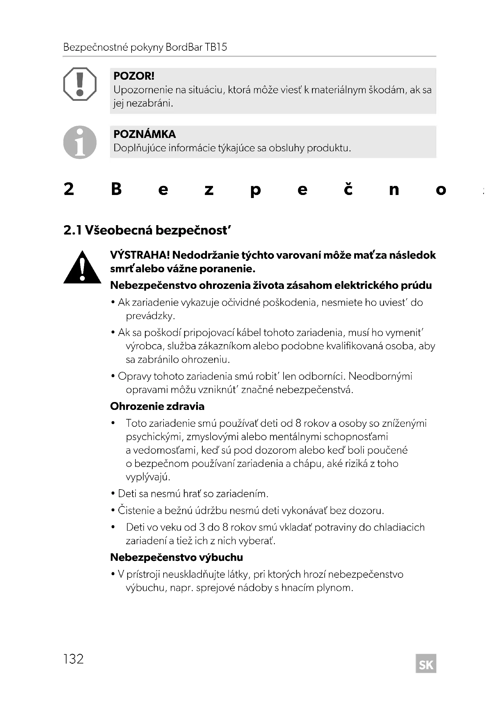 - V prístroji neuskladňujte látky, pri ktorých hrozí nebezpečenstvo výbuchu, napr. sprejové nádoby s hnacím plynom. POZOR! Upozornenie na situáciu, ktorá môže viesť k materiálnym škodám, ak sa jej nezabráni. POZNÁMKA Doplňujúce informácie týkajúce sa obsluhy produktu. TB15_OPM_EMEA16.book Seite 132 Mittwoch, 19. Juni 2019 8:58 20SK BordBar TB15 Bezpečnostné pokyny