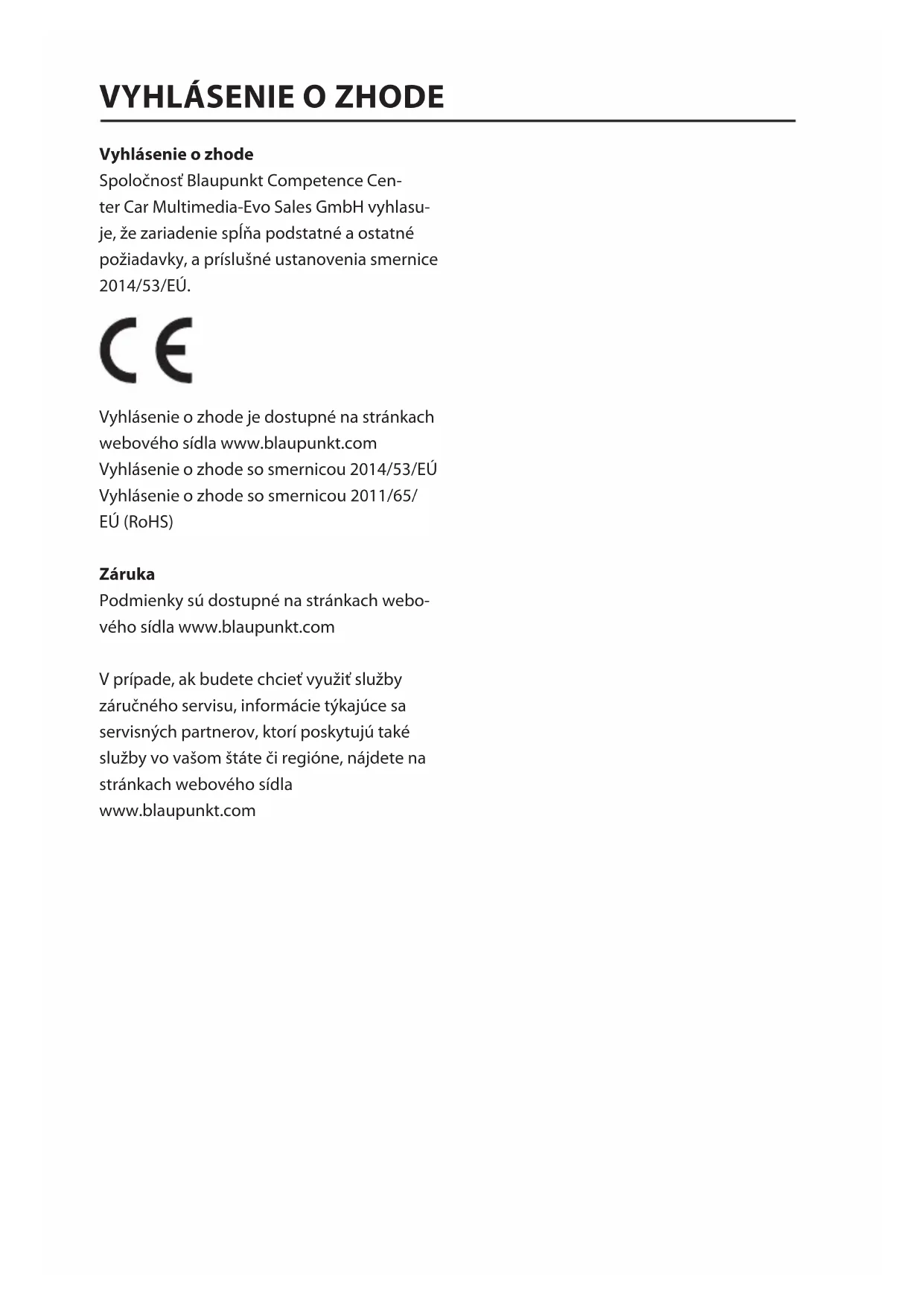 BPA 1121 BT Manual.indd 145 05.10.2021 16:15:42Vyhlásenie ozhode Spoločnosť Blaupunkt Competence Cen- ter Car Multimedia-Evo Sales GmbH vyhlasu- je, že zariadenie spĺňa podstatné a ostatné požiadavky, a príslušné ustanovenia smernice 2014/53/EÚ. Vyhlásenie o zhode je dostupné na stránkach webového sídla www.blaupunkt.com Vyhlásenie ozhode so smernicou 2014/53/EÚ Vyhlásenie ozhode so smernicou 2011/65/ EÚ (RoHS) Záruka Podmienky sú dostupné na stránkach webo- vého sídla www.blaupunkt.com V prípade, ak budete chcieť využiť služby záručného servisu, informácie týkajúce sa servisných partnerov, ktorí poskytujú také služby vo vašom štáte či regióne, nájdete na stránkach webového sídla www.blaupunkt.com