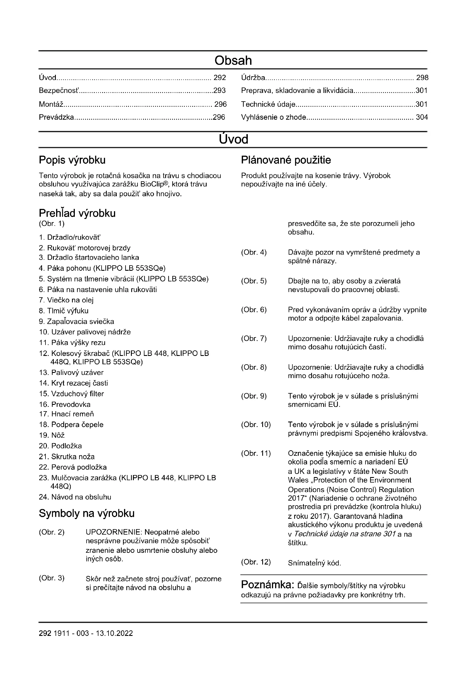Technické údaje na strane 301 ana štítku. (Obr. 12) Snímateľný kód. Poznámka: Ďalšie symboly/štítky na výrobku odkazujú na právne požiadavky pre konkrétny trh. 292 1911 - 003 - 13.10.2022Štítky na výrobku, iba pre Austráliu a Nový Zéland (Obr. 13) Udržiavajte ruky a chodidlá mimo dosahu rotujúceho noža. Emisie Euro V VÝSTRAHA: Nepovolená manipulácia smotorom ruší platnosť typového schválenia tohto výrobku pre EÚ. Zodpovednosť za výrobok Vsúlade správnymi predpismi upravujúcimi zodpovednosť za výrobok nenesieme zodpovednosť za škody spôsobené naším výrobkom vdôsledku: