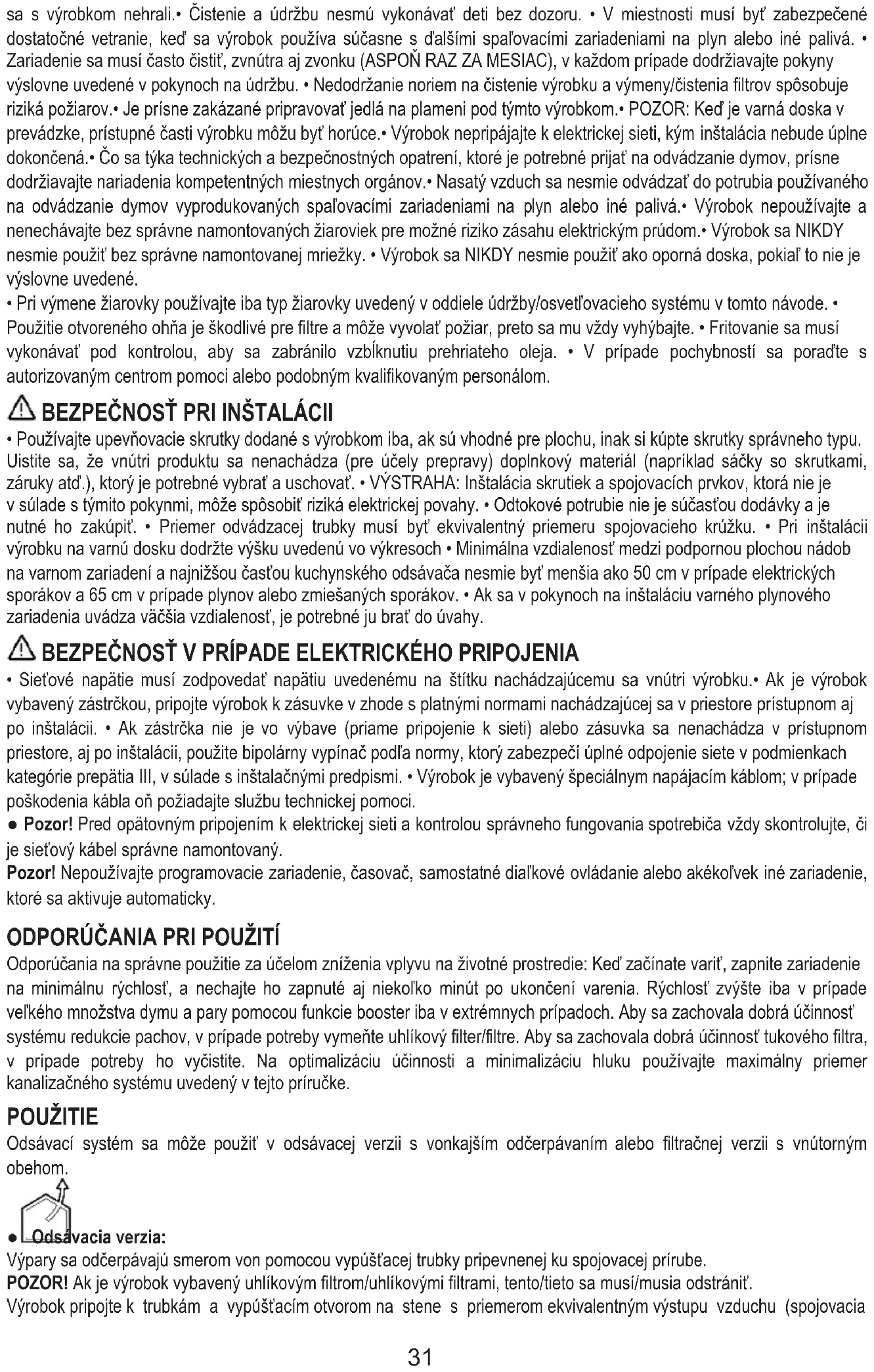 - Na výrobku alebo na odvádzacích potrubiach nevykonávajte elektrické alebo mechanické zmeny. • Pred akýmkoľvek úkonom čistenia alebo údržby odpojte zariadenie od elektrickej siete vytiahnutím zástrčky alebo odpojením hlavného vypínača v byte. • Pri všetkých úkonoch montáže a údržby používajte pracovné rukavice.• Zariadenie smú používať deti staršie ako 8 rokov a osoby s obmedzenými fyzickými, zmyslovými alebo mentálnymi schopnosťami alebo bez skúseností alebo potrebných znalostí len vtedy, keď sú pod dozorom alebo keď im boli dané pokyny týkajúce sa bezpečného používania zariadenia a tieto osoby pochopili nebezpečenstvá spojené so zariadením.• Deti musia byť pod dozorom, aby 30sa s výrobkom nehrali.• Čistenie a údržbu nesmú vykonávať deti bez dozoru. • V miestnosti musí byť zabezpečené dostatočné vetranie, keď sa výrobok používa súčasne s ďalšími spaľovacími zariadeniami na plyn alebo iné palivá. • Zariadenie sa musí často čistiť, zvnútra aj zvonku (ASPOŇ RAZ ZA MESIAC), v každom prípade dodržiavajte pokyny výslovne uvedené v pokynoch na údržbu. • Nedodržanie noriem na čistenie výrobku a výmeny/čistenia filtrov spôsobuje riziká požiarov.• Je prísne zakázané pripravovať jedlá na plameni pod týmto výrobkom.• POZOR: Keď je varná doska v prevádzke, prístupné časti výrobku môžu byť horúce.• Výrobok nepripájajte k elektrickej sieti, kým inštalácia nebude úplne dokončená.• Čo sa týka technických a bezpečnostných opatrení, ktoré je potrebné prijať na odvádzanie dymov, prísne dodržiavajte nariadenia kompetentných miestnych orgánov.• Nasatý vzduch sa nesmie odvádzať do potrubia používaného na odvádzanie dymov vyprodukovaných spaľovacími zariadeniami na plyn alebo iné palivá.• Výrobok nepoužívajte a nenechávajte bez správne namontovaných žiaroviek pre možné riziko zásahu elektrickým prúdom.• Výrobok sa NIKDY nesmie použiť bez správne namontovanej mriežky. • Výrobok sa NIKDY nesmie použiť ako oporná doska, pokiaľ to nie je výslovne uvedené.