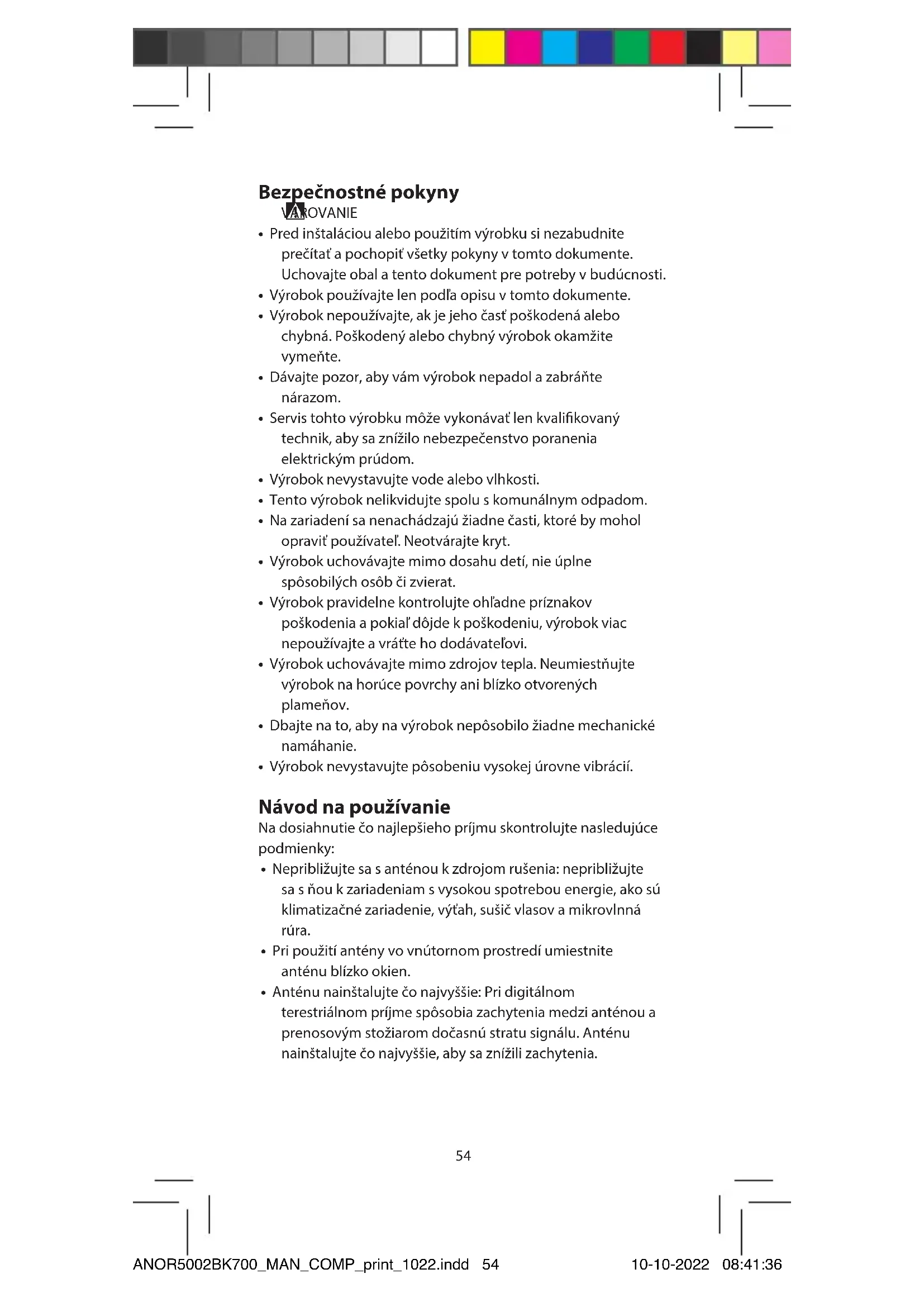 Rýchly návod TV anténa do vonkajšieho prostredia ANOR5002BK700 Určené použitie Tento výrobok je anténa, ktorá sa môže použiť s TV prijímačom alebo set-top-boxom, ktorý podporuje napájanie koaxiálnym káblom. Toto je anténa navrhnutá hlavne pre príjem digitálneho terestriálneho TV vysielania. Tento výrobok je určený len na použitie vo vonkajšom prostredí. Technické údaje Produkt TV anténa do vonkajšieho prostredia Číslo výrobku ANOR5002BK700 Príkon AC/DC adaptér: 12 V jednosm.; 200 mA Set-top-box DTV: 5 V jednosm.; 40 mA Obsah balenia (obrázok A) Pred inštaláciou skontrolujte obsah. 1 Hlavná jednotka antény 2 Príslušenstvo pre montáž na stenu/tyč 3 napájací adaptér 4 Zásuvka jednosmerného napájania ANOR5002BK700_MAN_COMP_print_1022.indd 53ANOR5002BK700_MAN_COMP_print_1022.indd 53 10-10-2022 08:41:3610-10-2022 08:41:3654 Bezpečnostné pokyny