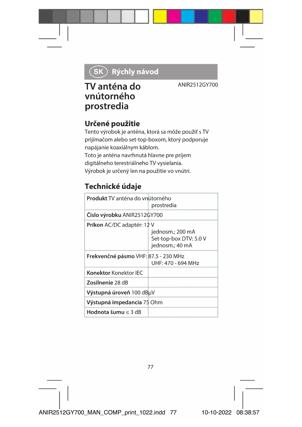 Rýchly návod TV anténa do vnútorného prostredia ANIR2512GY700 Určené použitie Tento výrobok je anténa, ktorá sa môže použiť s TV prijímačom alebo set-top-boxom, ktorý podporuje napájanie koaxiálnym káblom. Toto je anténa navrhnutá hlavne pre príjem digitálneho terestriálneho TV vysielania. Výrobok je určený len na použitie vo vnútri. Technické údaje Produkt TV anténa do vnútorného prostredia Číslo výrobku ANIR2512GY700 Príkon AC/DC adaptér: 12 V jednosm.; 200 mA Set-top-box DTV: 5.0 V jednosm.; 40 mA Frekvenčné pásmo VHF: 87.5 - 230 MHz UHF: 470 - 694 MHz Konektor Konektor IEC Zosilnenie 28 dB Výstupná úroveň 100 dBµV Výstupná impedancia 75 Ohm Hodnota šumu ≤ 3 dB ANIR2512GY700_MAN_COMP_print_1022.indd 77ANIR2512GY700_MAN_COMP_print_1022.indd 77 10-10-2022 08:38:5710-10-2022 08:38:5778 Obsah balenia (obrázok A) Pred inštaláciou skontrolujte obsah. 1 Hlavná jednotka antény s koaxiálnym káblom 2 napájací adaptér 3 Stojanová podpera na pracovnú plochu stola Funkcie výrobku