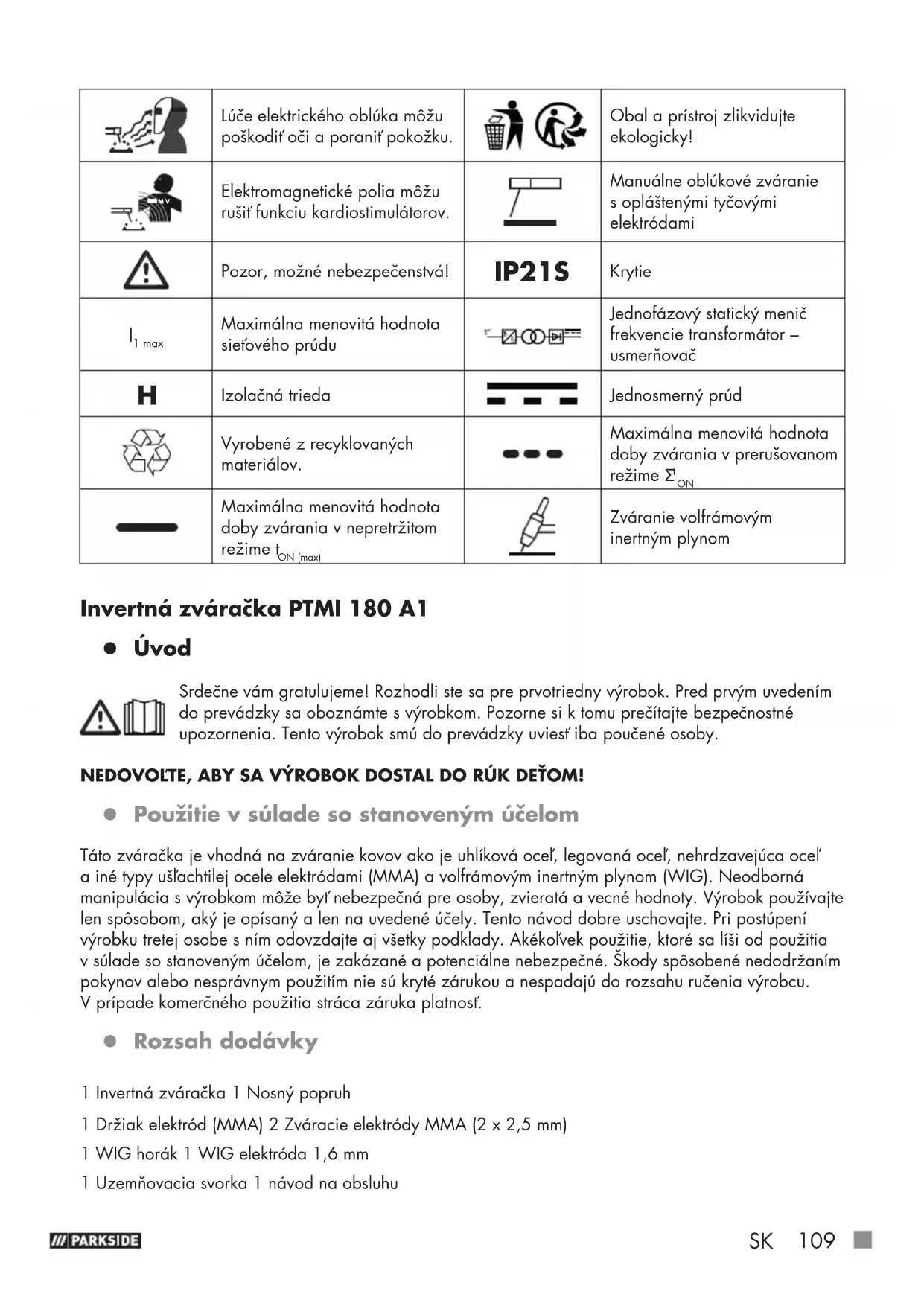 Maximálna menovitá hodnota doby zvárania v nepretržitom režime t ON (max) Zváranie volfrámovým inertným plynom Invertná zváračka PTMI 180 A1 z Úvod Srdečne vám gratulujeme! Rozhodli ste sa pre prvotriedny výrobok. Pred prvým uvedením do prevádzky sa oboznámte s výrobkom. Pozorne si k tomu prečítajte bezpečnostné upozornenia. Tento výrobok smú do prevádzky uviesť iba poučené osoby. NEDOVOĽTE, ABY SA VÝROBOK DOSTAL DO RÚK DEŤOM! z Použitie v súlade sostanoveným účelom Táto zváračka je vhodná na zváranie kovov ako je uhlíková oceľ, legovaná oceľ, nehrdzavejúca oceľ a iné typy ušľachtilej ocele elektródami (MMA) a volfrámovým inertným plynom (WIG). Neodborná manipulácia s výrobkom môže byť nebezpečná pre osoby, zvieratá a vecné hodnoty. Výrobok používajte len spôsobom, aký je opísaný alenna uvedené účely. Tento návod dobre uschovajte. Pri postúpení výrobku tretej osobe sním odovzdajte aj všetky podklady. Akékoľvek použitie, ktoré sa líši od použitia vsúlade so stanoveným účelom, je zakázané apotenciálne nebezpečné. Škody spôsobené nedodržaním pokynov alebo nesprávnym použitím nie sú kryté zárukou anespadajú do rozsahu ručenia výrobcu. Vprípade komerčného použitia stráca záruka platnosť. z Rozsah dodávky 1 Invertná zváračka 1 Nosný popruh 1 Držiak elektród (MMA) 2 Zváracie elektródy MMA (2 x 2,5 mm) 1 WIG horák 1 WIG elektróda 1,6 mm 1 Uzemňovacia svorka 1 návod na obsluhu110