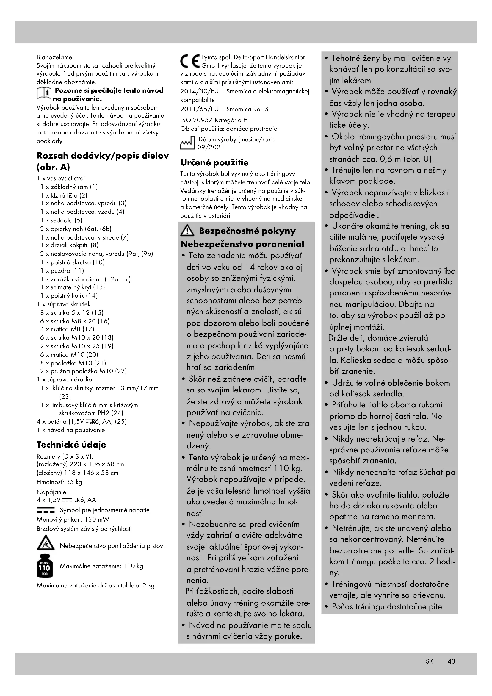Maximálne zaťaženie: 110 kg Maximálne zaťaženie držiaka tabletu: 2 kg Týmto spol. Delta-Sport Handelskontor GmbH vyhlasuje, že tento výrobok je v zhode s nasledujúcimi základnými požiadav- kami a ďalšími príslušnými ustanoveniami: 2014/30/EÚ – Smernica o elektromagnetickej kompatibilite 2011/65/EÚ – Smernica RoHS ISO 20957 Kategória H Oblasť použitia: domáce prostredie Dátum výroby (mesiac/rok): 09/2021 Určené použitie Tento výrobok bol vyvinutý ako tréningový nástroj, s ktorým môžete trénovať celé svoje telo. Veslársky trenažér je určený na použitie v súk- romnej oblasti a nie je vhodný na medicínske a komerčné účely. Tento výrobok je vhodný na použitie v exteriéri. Bezpečnostné pokyny Nebezpečenstvo poranenia!