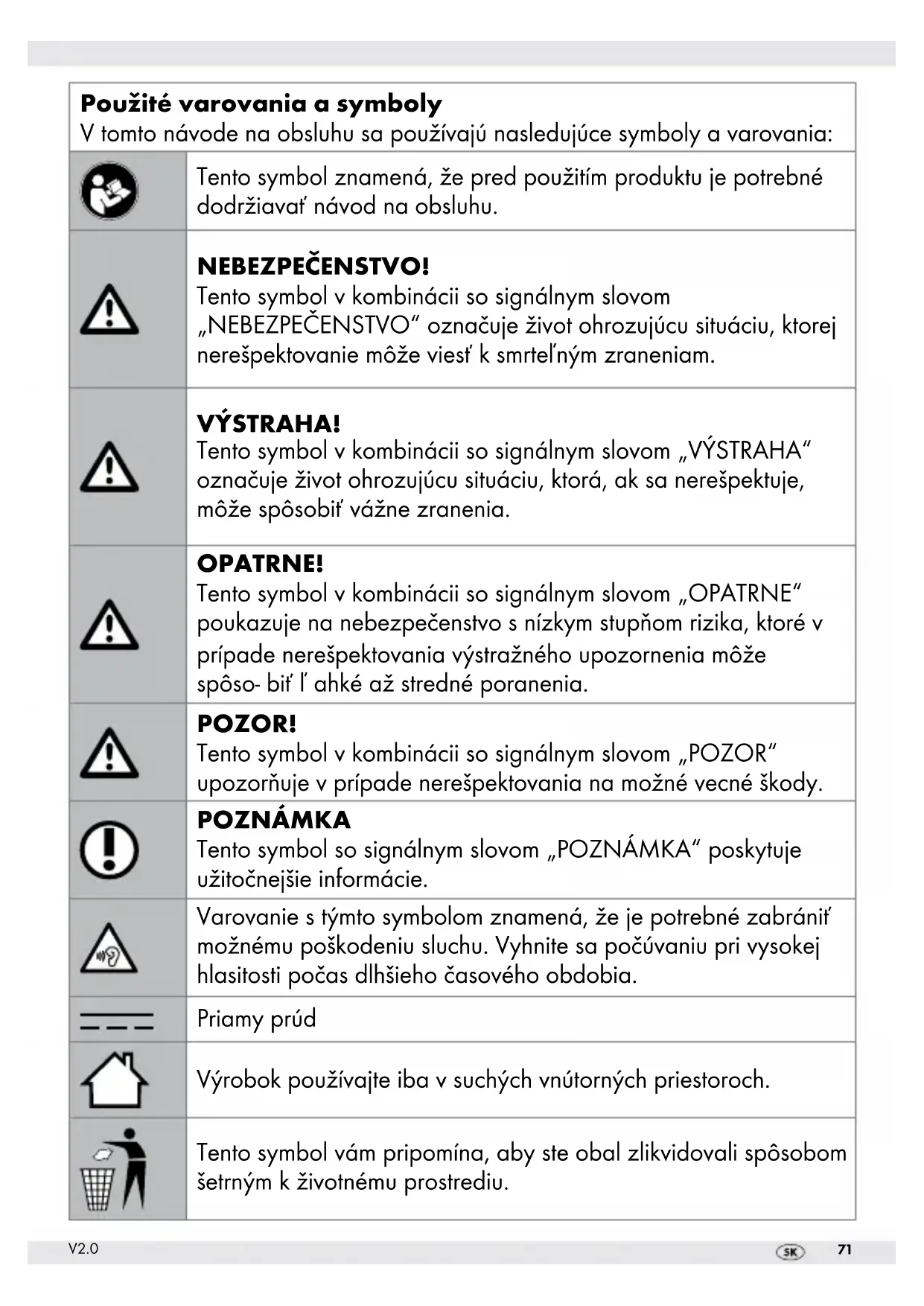 DOJAT A DETI! RIZIKO UDUSENIA! Obalový materiál nie je hračka. Deťom je zakázané hrať sa s obalovým materiálom. Hrozí nebezpečenstvo udusenia. Toto zariadenie nie je určené na používanie osobami (vrátane detí) s obmedzenými fyzickými, zmyslovými alebo duševnými schopnosťami alebo nedostatkom skúseností a/alebo vedomostí, pokiaľ nie sú pod dohľadom osoby zodpovednej za ich bezpečnosť alebo od nej nedostali pokyny o tom, ako na používanie zariadenia. Deti musia byť pod dozorom, aby sa zabezpečilo, že sa so zariadením nebudú hrať. Čistenie a používateľskú údržbu nesmú vykonávať deti, pokiaľ nie sú pod dohľadom dospelej osoby. Deti musia byť pri používaní zariadenia pod dozorom. NEBEZPEENSTVO! RIZIKO SMRTI ELEKTRICKM PRÚDOM! Chráňte výrobok pred vlhkosťou, kvapkajúcou alebo striekajúcou vodou!74 Výrobok nikdy neotvárajte. Pri otvorení výrobku hrozí nebezpečenstvo úrazu elektrickým prúdom. Všetky opravy prenechajte kvalifikovanému personálu. Servis je potrebný, ak je výrobok akýmkoľvek spôsobom poškodený. Ide napríklad o prípad, keď je výrobok poškodený, na výrobok sa rozliala tekutina, na výrobok spadli predmety, výrobok bol vystavený dažďu alebo vlhkosti, nefunguje normálne alebo spadol. Pri odpájaní zástrčky zo zásuvky vždy ťahajte za zástrčku, nie za kábel. Neťahajte za audio kábel. Nikdy sa nedotýkajte zástrčky vlhkými alebo mokrými rukami, pretože by to mohlo spôsobiť skrat alebo úraz elektrickým prúdom. Na kábel neumiestňujte žiadny nábytok ani podobné predmety. Uistite sa, že kábel nie je pricviknutý. Kábel nikdy neviažte na uzly ani ho nespájajte s inými káblami. Poškodený kábel alebo zástrčka môžu spôsobiť požiar alebo úraz elektrickým prúdom. Pravidelne kontrolujte kábel a zástrčky. Nepoužívajte poškodený kábel alebo zástrčku. Použitá sieťová zásuvka musí byť ľahko prístupná, aby sa zástrčka dala v prípade núdze rýchlo odpojiť. Ak spozorujete nezvyčajný hluk, dym a podobne, musíte okamžite vytiahnuť kábel zo sieťovej zásuvky a odpojiť všetky pripojené zariadenia. Výrobok znova nepoužívajte, kým nebude otestovaný kvalifikovanou osobou. Výrobok sa môže používať iba v suchých vnútorných priestoroch.