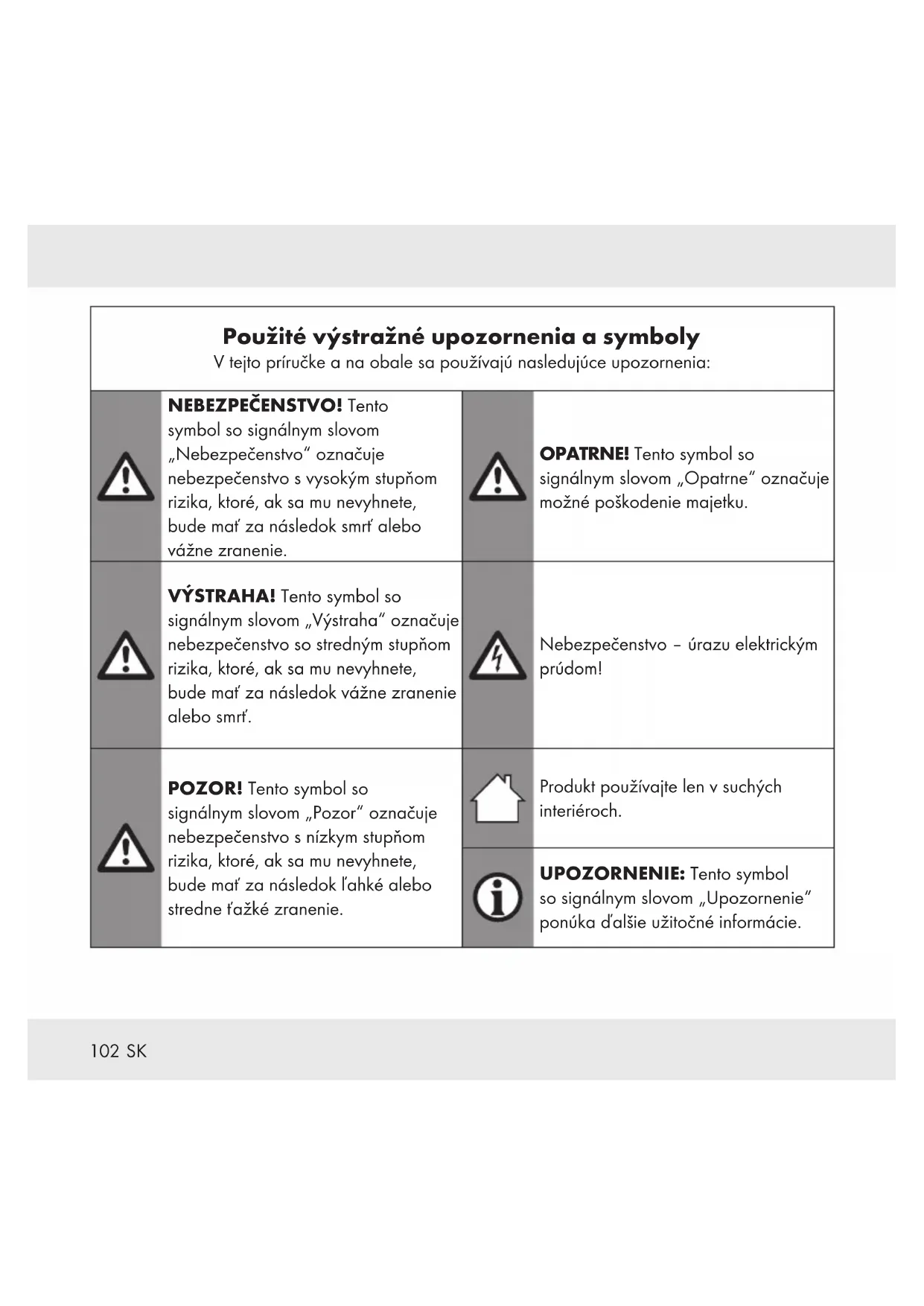 Použité výstražné upozornenia a symboly V tejto príručke a na obale sa používajú nasledujúce upozornenia: NEBEZPEČENSTVO! Tento symbol so signálnym slovom „Nebezpečenstvo“ označuje nebezpečenstvo s vysokým stupňom rizika, ktoré, ak sa mu nevyhnete, bude mať za následok smrť alebo vážne zranenie. OPATRNE! Tento symbol so signálnym slovom „Opatrne“ označuje možné poškodenie majetku. VÝSTRAHA! Tento symbol so signálnym slovom „Výstraha“ označuje nebezpečenstvo so stredným stupňom rizika, ktoré, ak sa mu nevyhnete, bude mať za následok vážne zranenie alebo smrť. Nebezpečenstvo– úrazu elektrickým prúdom! POZOR! Tento symbol so signálnym slovom „Pozor“ označuje nebezpečenstvo s nízkym stupňom rizika, ktoré, ak sa mu nevyhnete, bude mať za následok ľahké alebo stredne ťažké zranenie. Produkt používajte len v suchých interiéroch. UPOZORNENIE: Tento symbol so signálnym slovom „Upozornenie“ ponúka ďalšie užitočné informácie.103