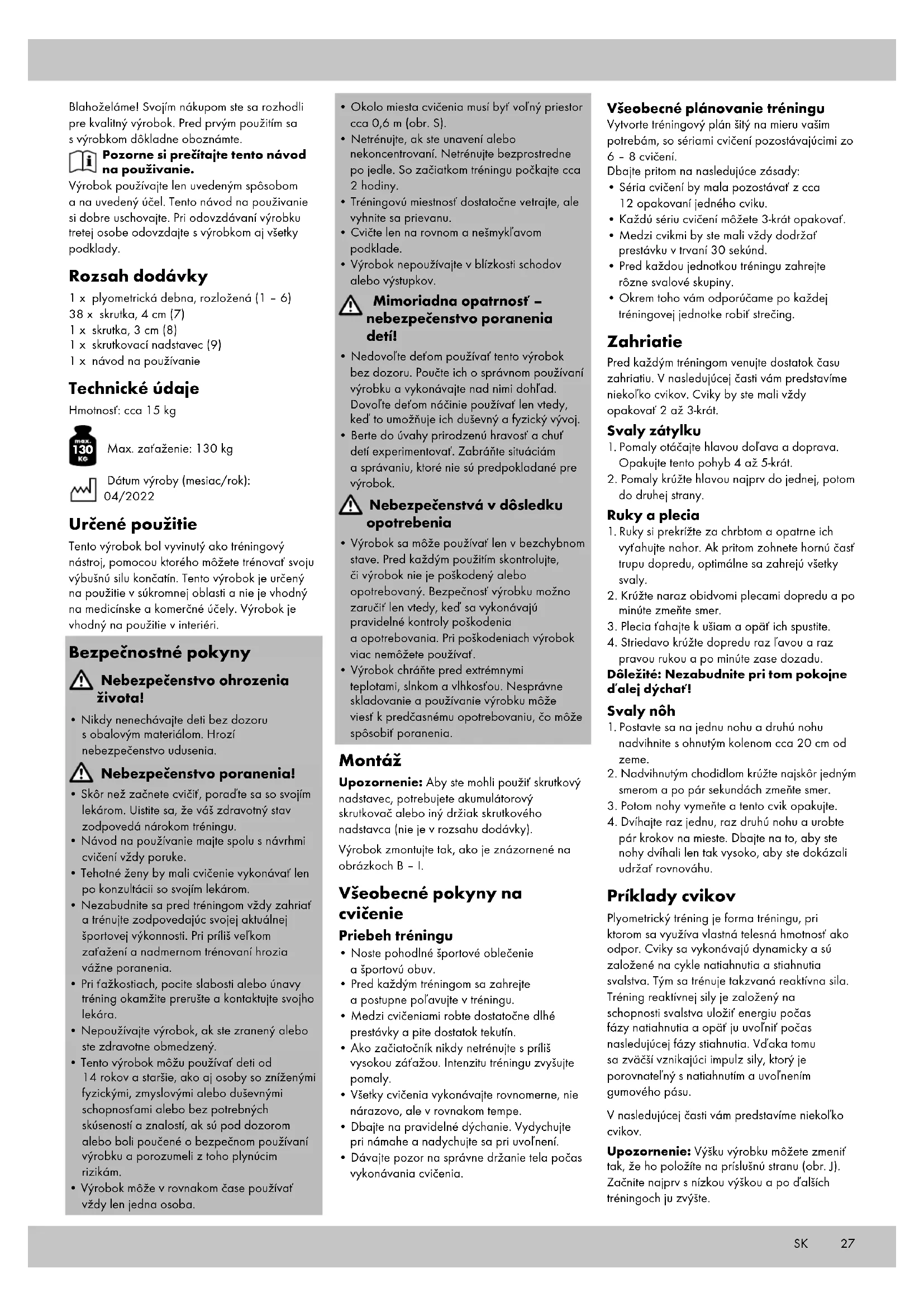 Max. zaťaženie: 130 kg Dátum výroby (mesiac/rok): 04/2022 Určené použitie Tento výrobok bol vyvinutý ako tréningový nástroj, pomocou ktorého môžete trénovať svoju výbušnú silu končatín. Tento výrobok je určený na použitie v súkromnej oblasti a nie je vhodný na medicínske a komerčné účely. Výrobok je vhodný na použitie v interiéri. Bezpečnostné pokyny Nebezpečenstvo ohrozenia života!