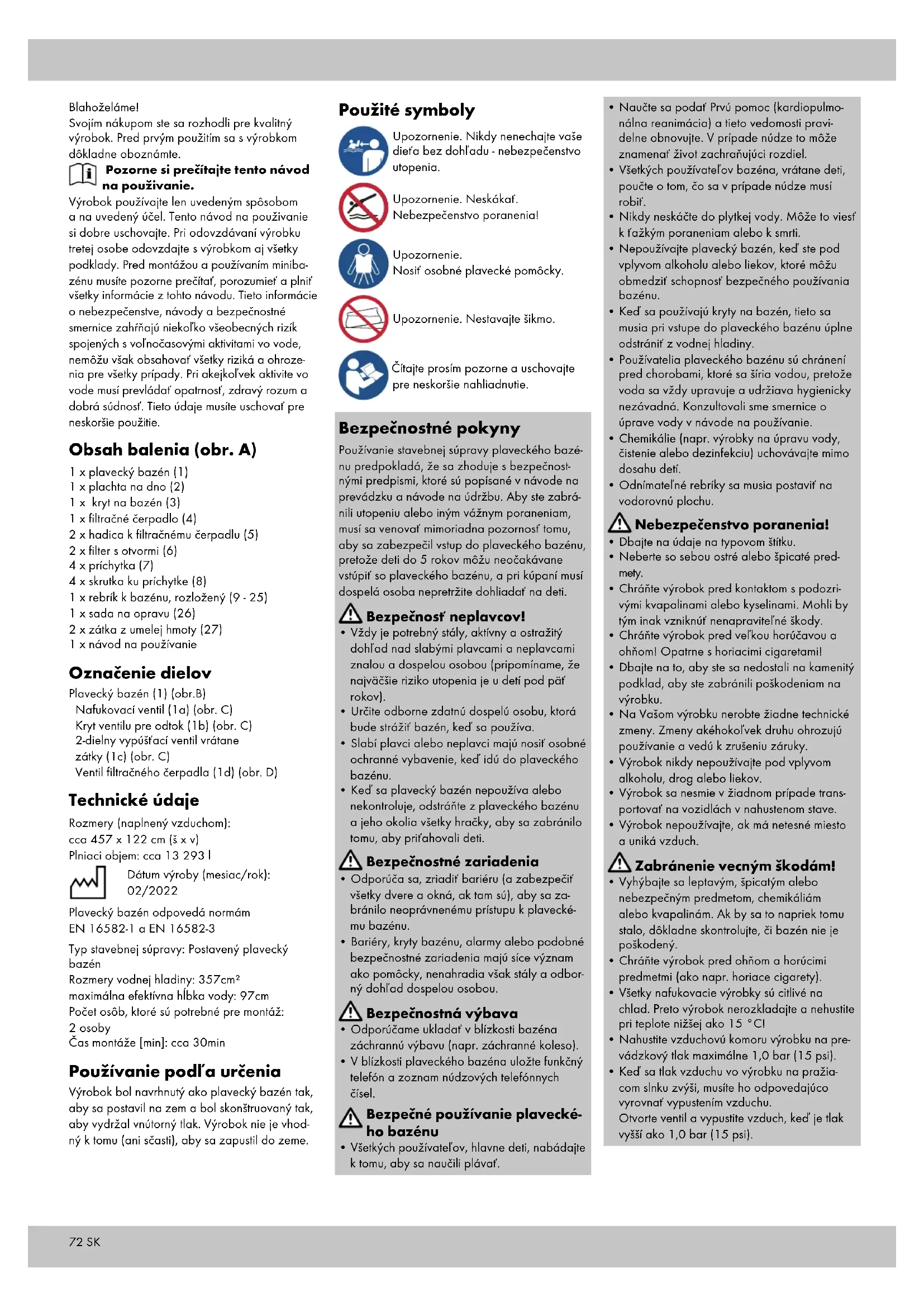 - Obraťte se na odborníka. Pokyny k likvidaci V zájmu ochrany životního prostředí nevyhazujte svůj výrobek do odpadu v případě, že dosloužil, ale odneste jej na profesionální místo k likvidaci. O sběrných místech a jejich otevírací době se můžete informovat u příslušné místní správy. Výrobek a obal zlikvidujte ekologicky. Při třídění odpadu dodržujte označení balicích materiálů, které jsou označeny zkratkami (a) a čísly (b) s následujícím významem: 1–7: plasty/20–22: papír a karton/80–98: smíšený odpad. Výrobek a balicí materiály jsou recyklovatelné, likvidujte je odděleně pro lepší zpracování odpadu. Logo Triman platí pouze pro Francii. Možnosti likvidace výrobku, který dosloužil, jsou k dispozici u místní nebo městské správy.72 SK Blahoželáme! Svojím nákupom ste sa rozhodli pre kvalitný výrobok. Pred prvým použitím sa s výrobkom dôkladne oboznámte. Pozorne si prečítajte tento návod na použivanie. Výrobok používajte len uvedeným spôsobom a na uvedený účel. Tento návod na použivanie si dobre uschovajte. Pri odovzdávaní výrobku tretej osobe odovzdajte s výrobkom aj všetky podklady. Pred montážou a používaním miniba- zénu musíte pozorne prečítať, porozumieť a plniť všetky informácie z tohto návodu. Tieto informácie o nebezpečenstve, návody a bezpečnostné smernice zahŕňajú niekoľko všeobecných rizík spojených s voľnočasovými aktivitami vo vode, nemôžu však obsahovať všetky riziká a ohroze- nia pre všetky prípady. Pri akejkoľvek aktivite vo vode musí prevládať opatrnosť, zdravý rozum a dobrá súdnosť. Tieto údaje musíte uschovať pre neskoršie použitie. Obsah balenia (obr. A) 1 x plavecký bazén (1) 1 x plachta na dno (2) 1 x kryt na bazén (3) 1 x filtračné čerpadlo (4) 2 x hadica k filtračnému čerpadlu (5) 2 x filter s otvormi (6) 4 x príchytka (7) 4 x skrutka ku príchytke (8) 1 x rebrík k bazénu, rozložený (9 - 25) 1 x sada na opravu (26) 2 x zátka z umelej hmoty (27) 1 x návod na používanie Označenie dielov Plavecký bazén (1) (obr.B) Nafukovací ventil (1a) (obr. C) Kryt ventilu pre odtok (1b) (obr. C) 2-dielny vypúšťací ventil vrátane zátky (1c) (obr. C) Ventil filtračného čerpadla (1d) (obr. D) Technické údaje Rozmery (naplnený vzduchom): cca 457 x 122 cm (š x v) Plniaci objem: cca 13 293 l Dátum výroby (mesiac/rok): 02/2022 Plavecký bazén odpovedá normám EN 16582-1 a EN 16582-3 Typ stavebnej súpravy: Postavený plavecký bazén Rozmery vodnej hladiny: 357cm² maximálna efektívna hĺbka vody: 97cm Počet osôb, ktoré sú potrebné pre montáž: 2 osoby Čas montáže [min]: cca 30min Používanie podľa určenia Výrobok bol navrhnutý ako plavecký bazén tak, aby sa postavil na zem a bol skonštruovaný tak, aby vydržal vnútorný tlak. Výrobok nie je vhod- ný k tomu (ani sčasti), aby sa zapustil do zeme. Použité symboly Upozornenie. Nikdy nenechajte vaše dieťa bez dohľadu - nebezpečenstvo utopenia. Upozornenie. Neskákať. Nebezpečenstvo poranenia! Upozornenie. Nosiť osobné plavecké pomôcky. Upozornenie. Nestavajte šikmo. Čítajte prosím pozorne a uschovajte pre neskoršie nahliadnutie. Bezpečnostné pokyny Používanie stavebnej súpravy plaveckého bazé- nu predpokladá, že sa zhoduje s bezpečnost- nými predpismi, ktoré sú popísané v návode na prevádzku a návode na údržbu. Aby ste zabrá- nili utopeniu alebo iným vážnym poraneniam, musí sa venovať mimoriadna pozornosť tomu, aby sa zabezpečil vstup do plaveckého bazénu, pretože deti do 5 rokov môžu neočakávane vstúpiť so plaveckého bazénu, a pri kúpaní musí dospelá osoba nepretržite dohliadať na deti. Bezpečnosť neplavcov!