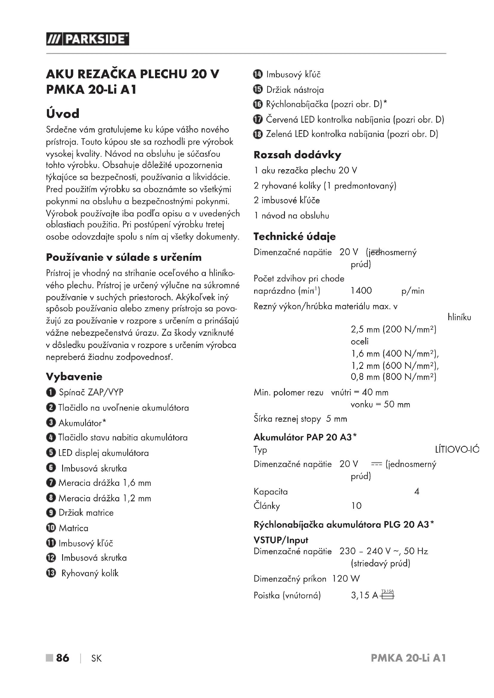 PMKA 20-Li A1 Úvod Srdečne vám gratulujeme kukúpe vášho nového prístroja. Touto kúpou ste sa rozhodli pre výrobok vysokej kvality. Návod na obsluhu je súčasťou tohto výrobku. Obsahuje dôležité upozornenia týkajúce sa bezpečnosti, používania a likvidácie. Pred použitím výrobku sa oboznámte sovšetkými pokynmi na obsluhu a bezpečnostnými pokynmi. Výrobok používajte iba podľa opisu a vuvedených oblastiach použitia. Pri postúpení výrobku tretej osobe odovzdajte spolu sním aj všetky dokumenty. Používanie vsúlade surčením Prístroj je vhodný na strihanie oceľového a hliníko- vého plechu. Prístroj je určený výlučne nasúkromné používanie v suchých priestoroch. Akýkoľvek iný spôsob používania alebo zmeny prístroja sa pova- žujú za používanie v rozpore surčením a prinášajú vážne nebezpečenstvá úrazu. Za škody vzniknuté v dôsledku používania v rozpore s určením výrobca nepreberá žiadnu zodpovednosť. Vybavenie Spínač ZAP/VYP Tlačidlo na uvoľnenie akumulátora Akumulátor* Tlačidlo stavu nabitia akumulátora LED displej akumulátora Imbusová skrutka Meracia drážka 1,6 mm Meracia drážka 1,2 mm Držiak matrice Matrica Imbusový kľúč Imbusová skrutka Ryhovaný kolík Imbusový kľúč Držiak nástroja Rýchlonabíjačka (pozri obr. D)* Červená LED kontrolka nabíjania (pozri obr. D) Zelená LED kontrolka nabíjania (pozri obr. D) Rozsah dodávky 1 aku rezačka plechu 20 V 2 ryhované kolíky (1 predmontovaný) 2 imbusové kľúče 1 návod na obsluhu Technické údaje Dimenzačné napätie 20 V (jednosmerný prúd) Počet zdvihov pri chode naprázdno (min