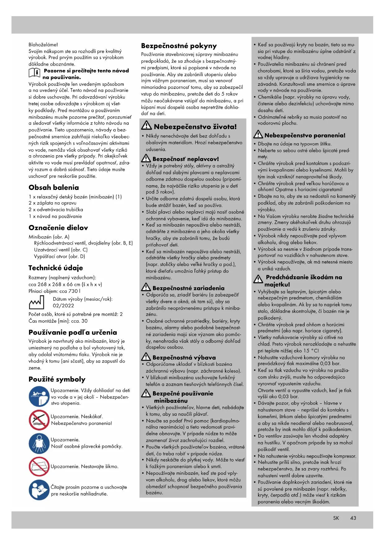 - Používanie doplnkových zariadení, ktoré nie sú povolené pre minibazén (napr. rebríky, kryty, čerpadlá atď.) môže viesť k rizikám poranenia alebo vecným škodám. SK44 SK