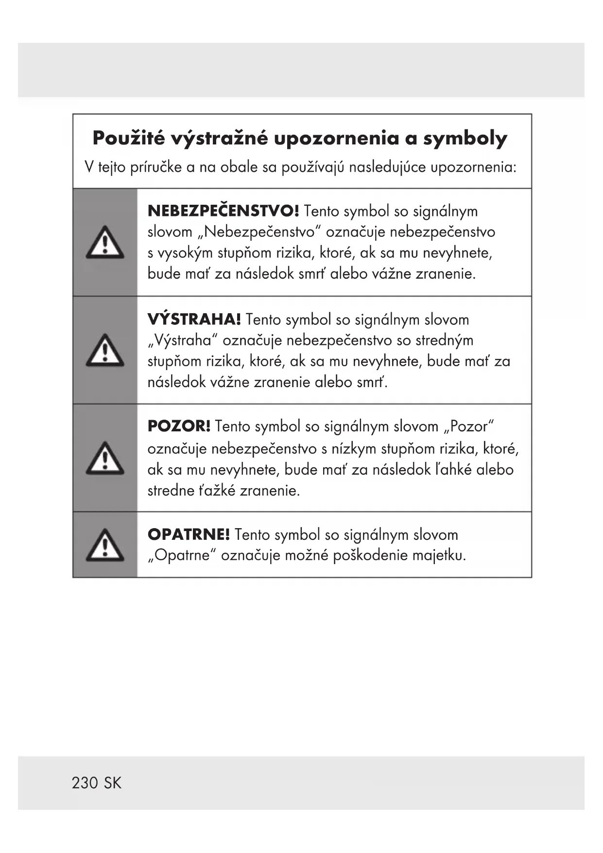 Použité výstražné upozornenia a symboly V tejto príručke a na obale sa používajú nasledujúce upozornenia: NEBEZPEČENSTVO! Tento symbol so signálnym slovom „Nebezpečenstvo“ označuje nebezpečenstvo s vysokým stupňom rizika, ktoré, ak sa mu nevyhnete, bude mať za následok smrť alebo vážne zranenie. VÝSTRAHA! Tento symbol so signálnym slovom „Výstraha“ označuje nebezpečenstvo so stredným stupňom rizika, ktoré, ak sa mu nevyhnete, bude mať za následok vážne zranenie alebo smrť. POZOR! Tento symbol so signálnym slovom „Pozor“ označuje nebezpečenstvo s nízkym stupňom rizika, ktoré, ak sa mu nevyhnete, bude mať za následok ľahké alebo stredne ťažké zranenie. OPATRNE! Tento symbol so signálnym slovom „Opatrne“ označuje možné poškodenie majetku.231