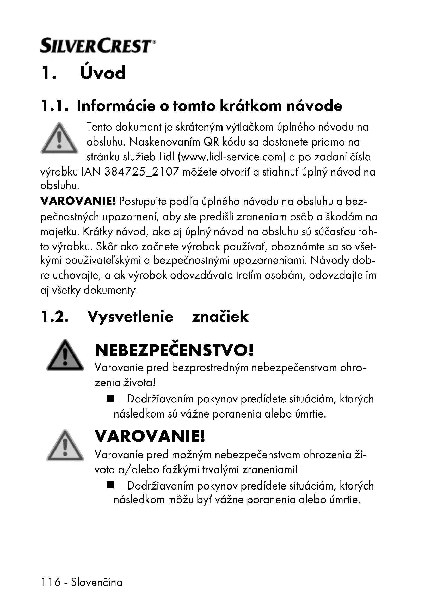 1.1. Informácie otomto krátkom návode Tento dokument je skráteným výtlačkom úplného návodu na obsluhu. Naskenovaním QR kódu sa dostanete priamo na stránku služieb Lidl (www.lidl-service.com) a po zadaní čísla výrobku IAN 384725_2107 môžete otvoriť a stiahnuť úplný návod na obsluhu. VAROVANIE! Postupujte podľa úplného návodu na obsluhu a bez- pečnostných upozornení, aby ste predišli zraneniam osôb a škodám na majetku. Krátky návod, ako aj úplný návod na obsluhu sú súčasťou toh- to výrobku. Skôr ako začnete výrobok používať, oboznámte sa so všet- kými používateľskými abezpečnostnými upozorneniami. Návody dob- re uchovajte, a ak výrobok odovzdávate tretím osobám, odovzdajte im aj všetky dokumenty. 1.2. Vysvetlenie značiek NEBEZPEČENSTVO! Varovanie pred bezprostredným nebezpečenstvom ohro- zenia života! Dodržiavaním pokynov predídete situáciám, ktorých následkom sú vážne poranenia alebo úmrtie. VAROVANIE! Varovanie pred možným nebezpečenstvom ohrozenia ži- vota a/alebo ťažkými trvalými zraneniami! Dodržiavaním pokynov predídete situáciám, ktorých následkom môžu byť vážne poranenia alebo úmrtie.Slovenčina - 117 UPOZORNENIE! Varovanie pred potenciálnymi stredne ťažkými a/alebo ľahkými zraneniami! Dodržiavaním pokynov predídete situáciám, ktorých následkom môžu byť drobné alebo ľahké poranenia. VAROVANIE! Varovanie pred nebezpečenstvom zásahu elektrickým prú- dom! OZNÁMENIE! Dodržiavaním pokynov predídete materiálnym škodám! Dodržiavaním pokynov predídete situáciám, ktorých následkom môžu byť materiálne škody. Poznámky k montáži alebo prevádzke Dbajte na upozornenia uvedené vnávode na obsluhu!